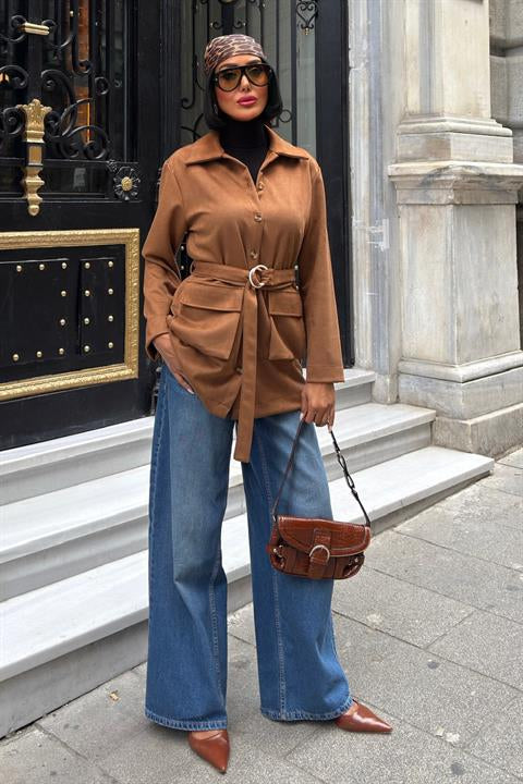 Kuşaklı ve Cepli Midi Gömlek Ceket 6130