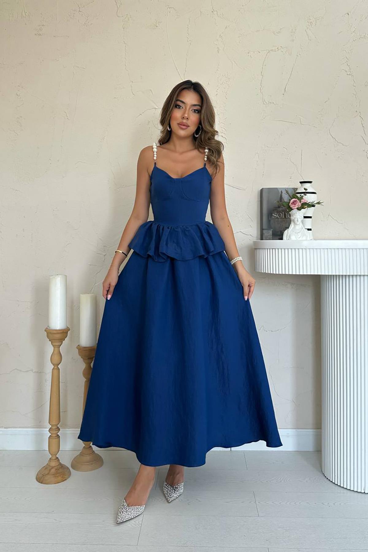 Toptan Lacivert Beli Büzgülü İnci Askılı Uzun Elbise