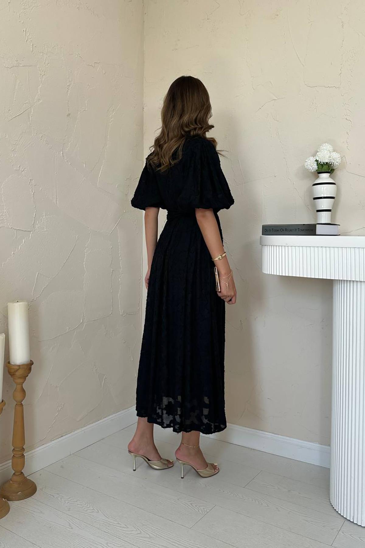Toptan Siyah Kemerli Balon Kollu Elbise