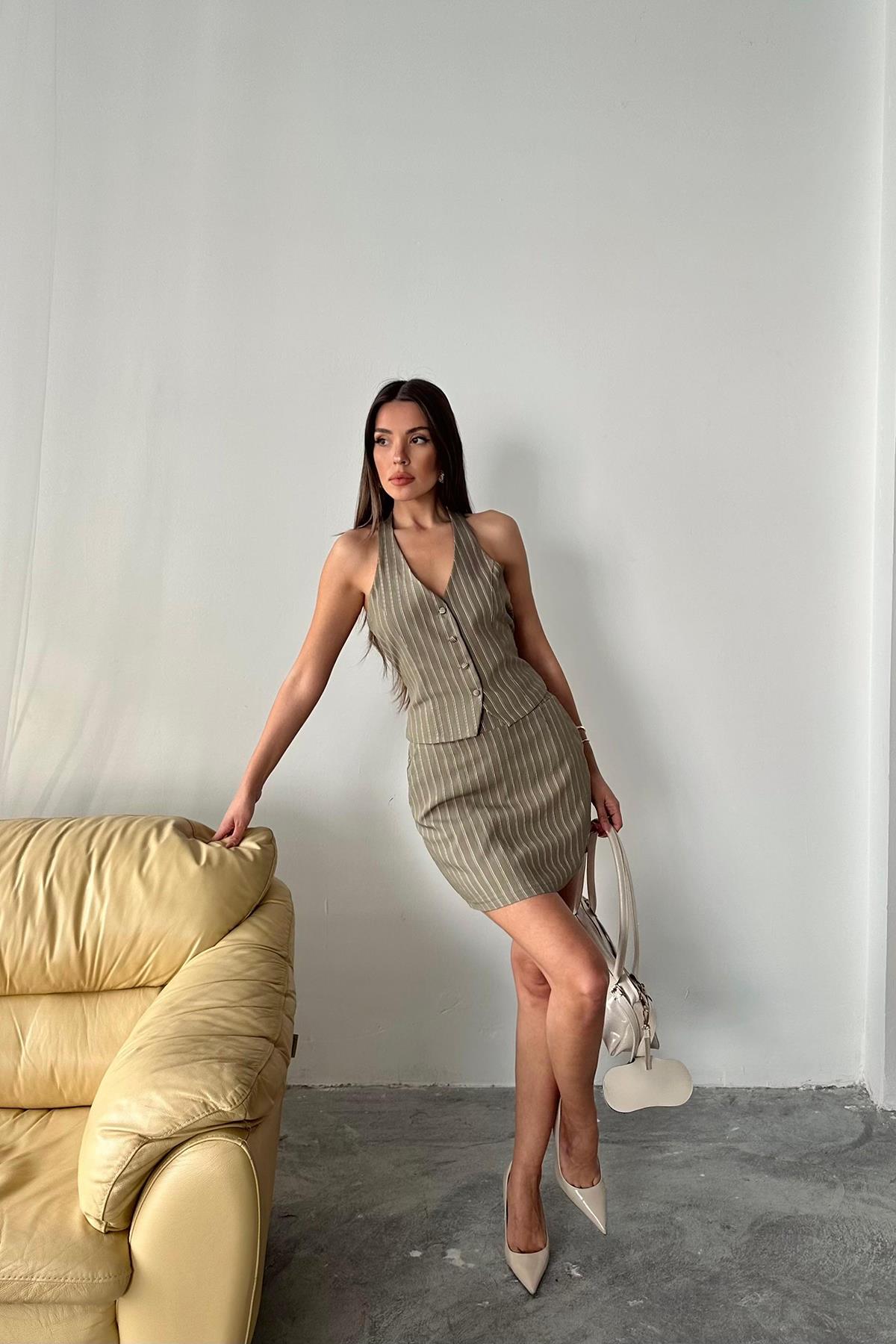 Toptan Haki Çizgili Yelek Ve Etek Takım