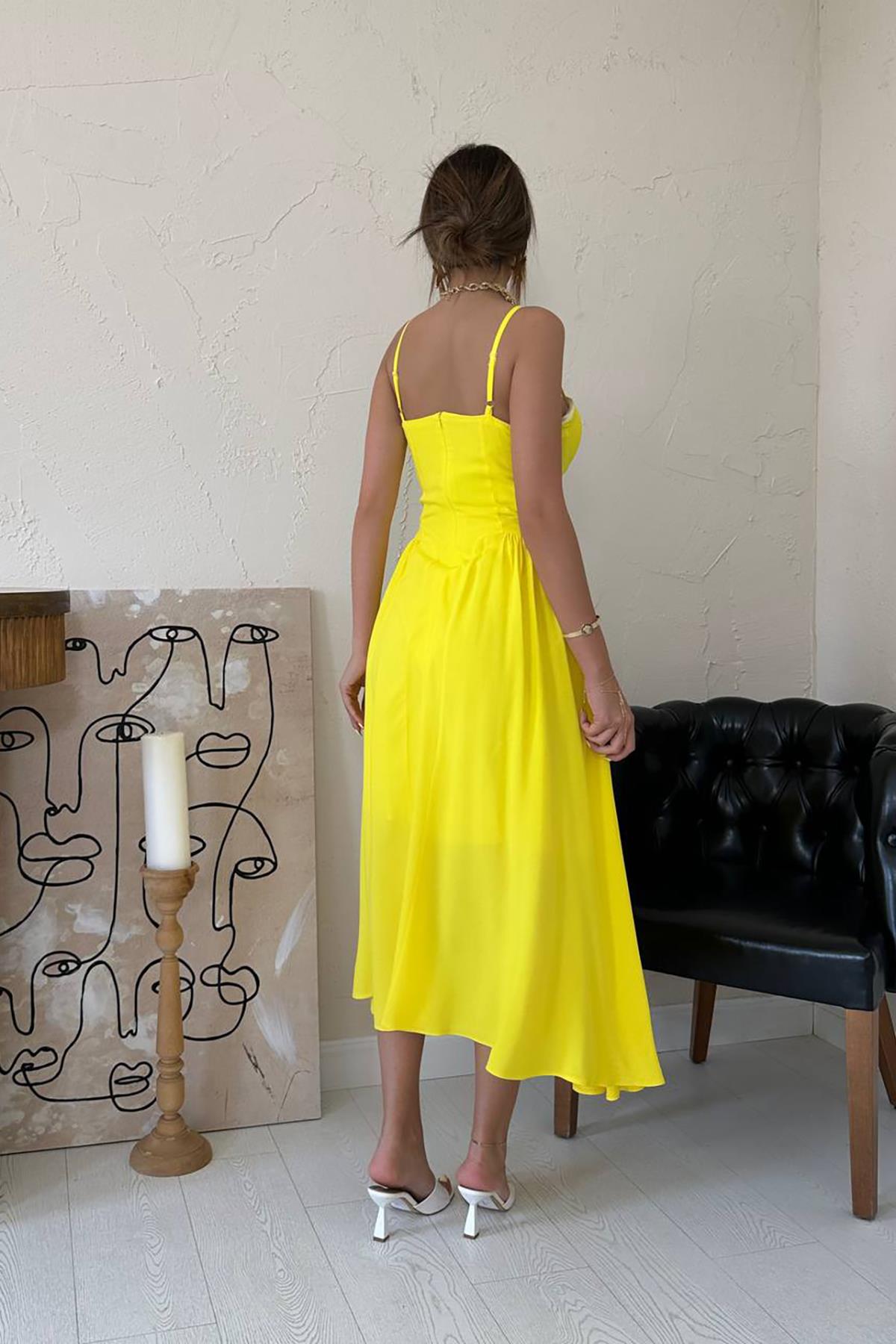 Toptan Sarı Göğüs Kuplu Uzun Büzgülü Elbise