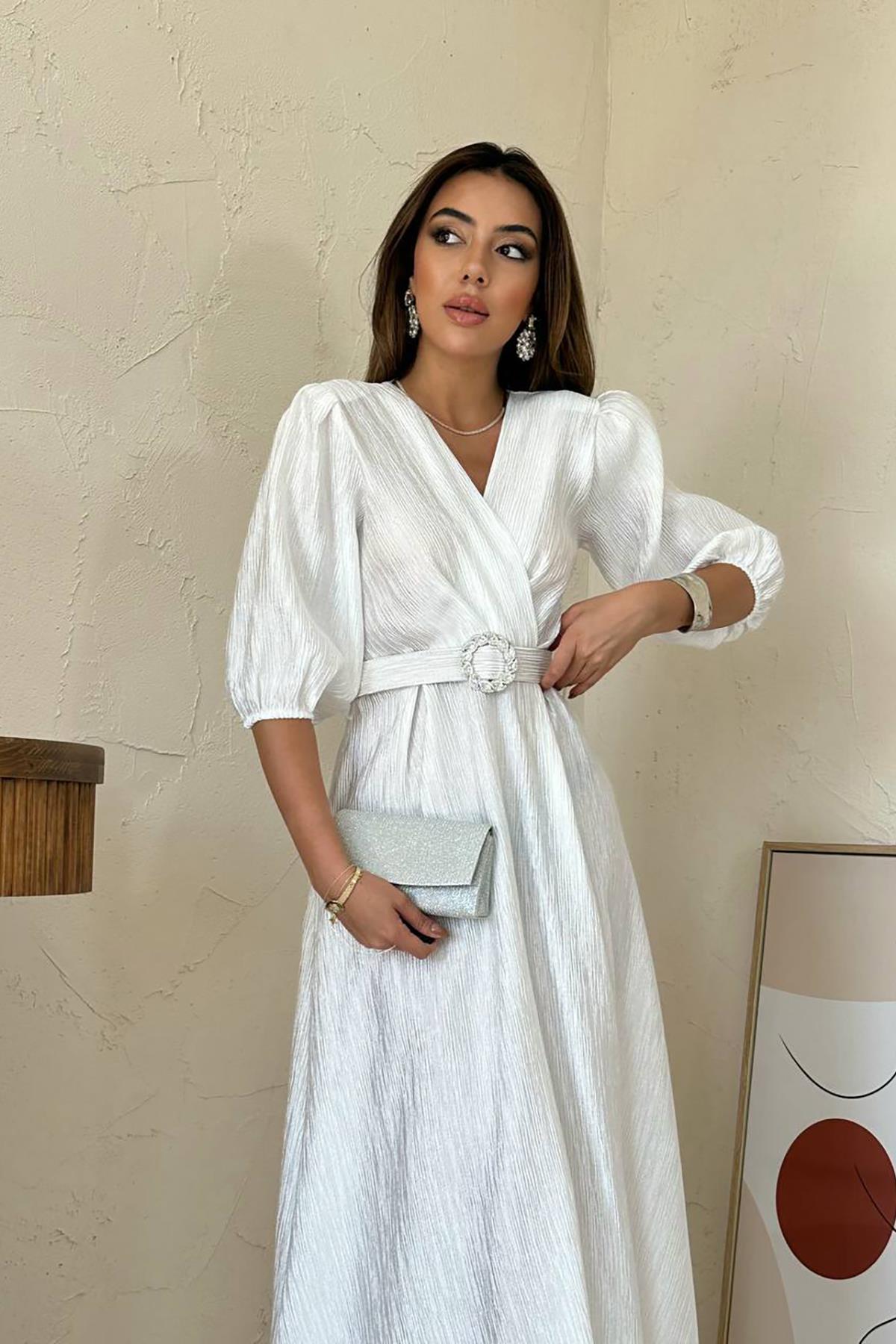 Toptan Beyaz Işıltılı Kemerli Kruvaze Elbise