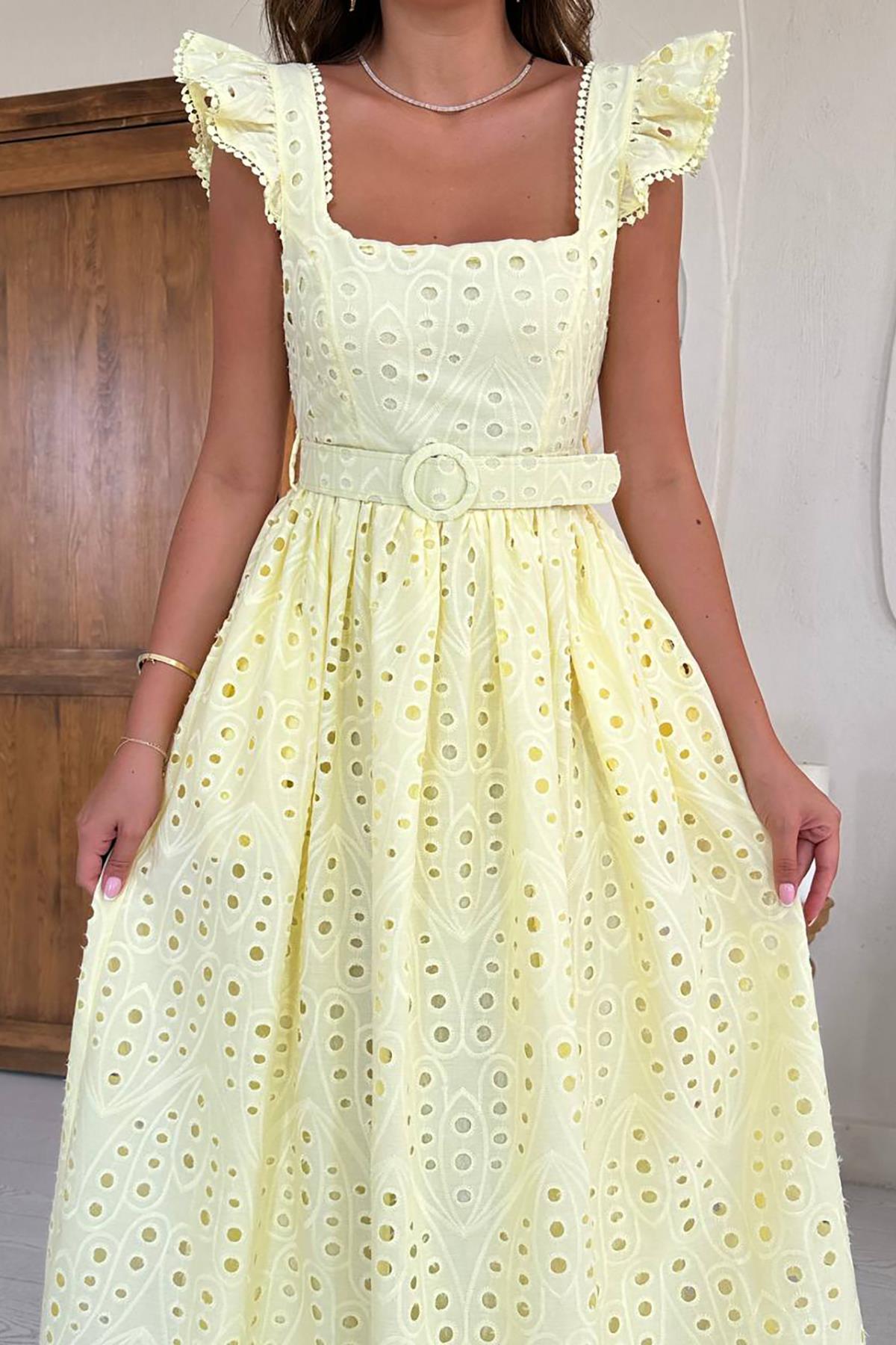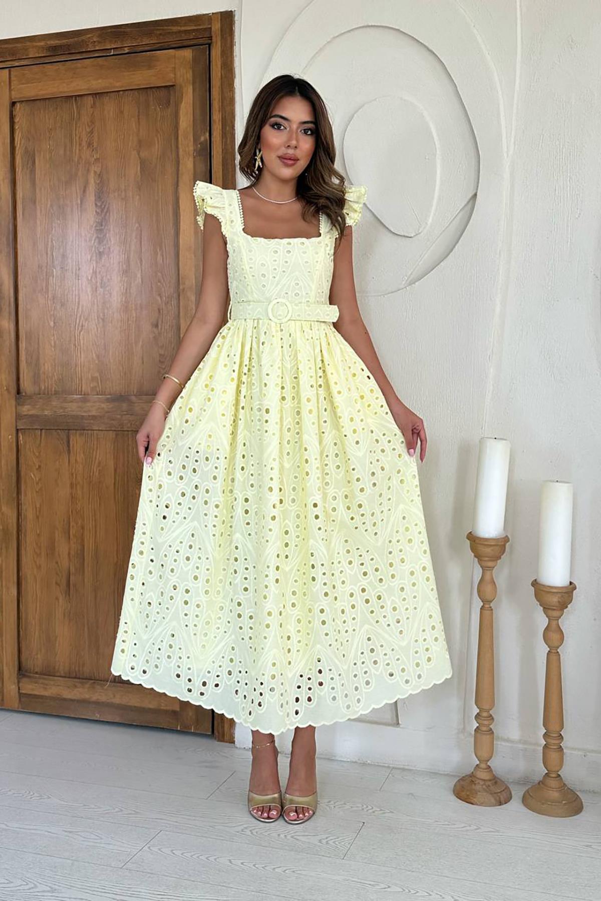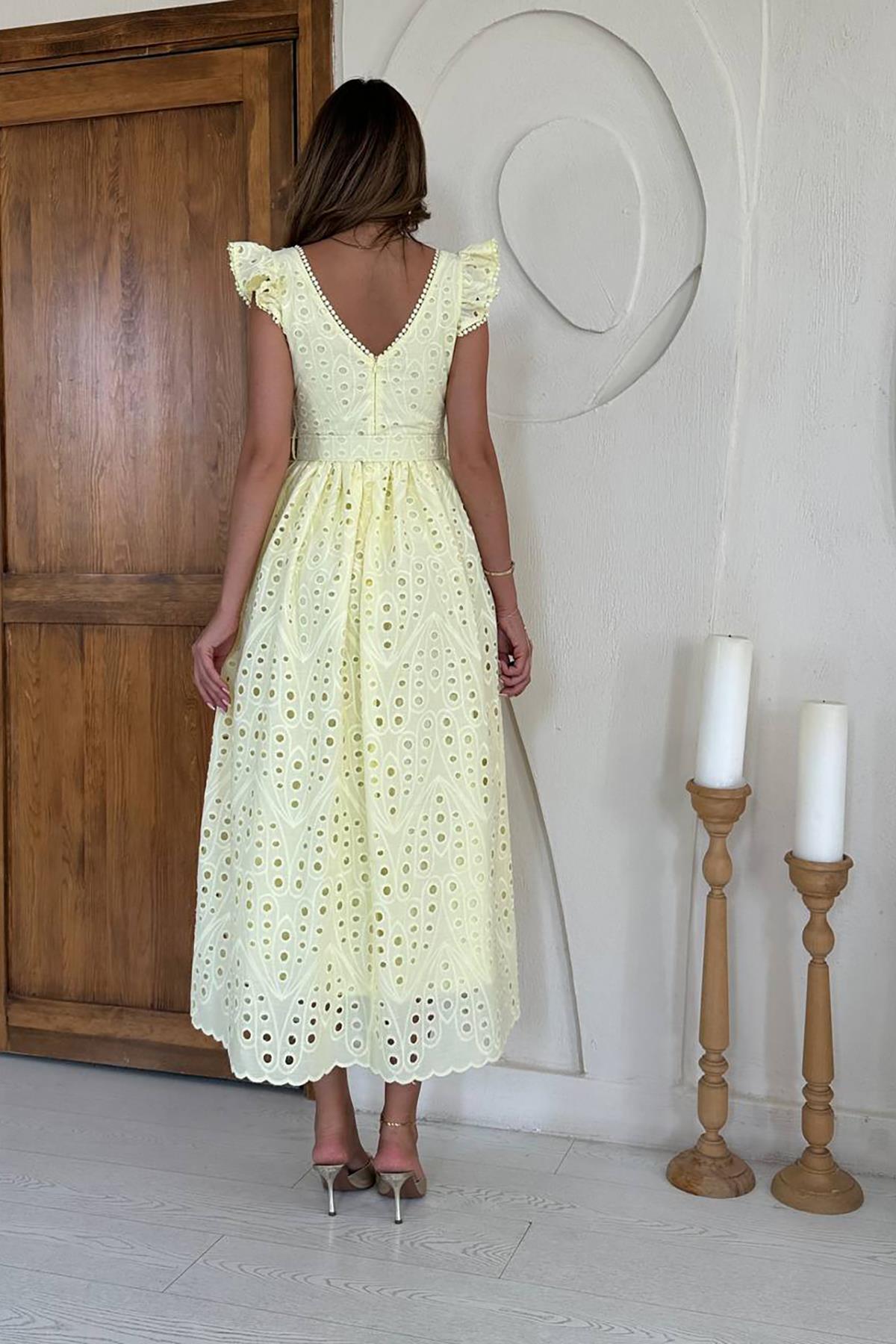 Toptan Sarı Dantelli Brode Elbise