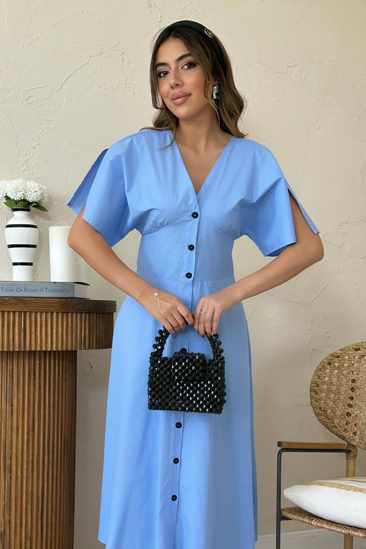 Toptan Mavi Düğmeli Midi Boy Poplin Elbise