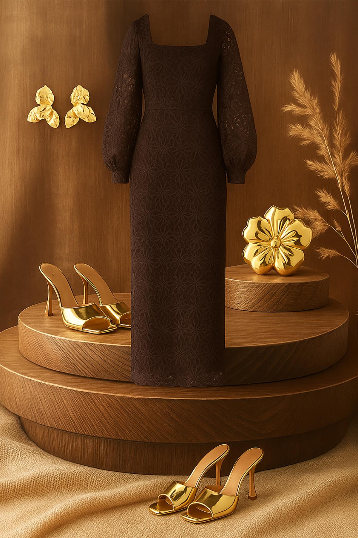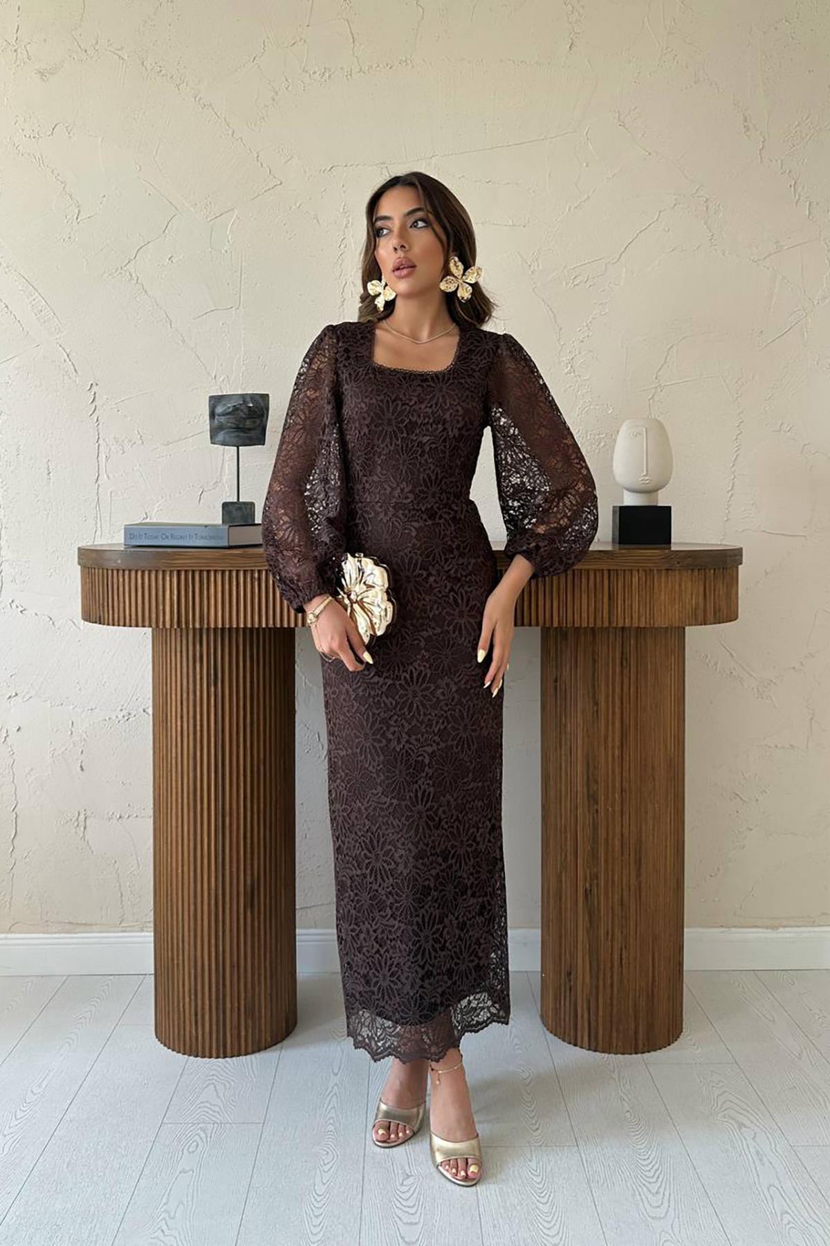 Toptan Kahverengi Güpür Detaylı Dantel Elbise