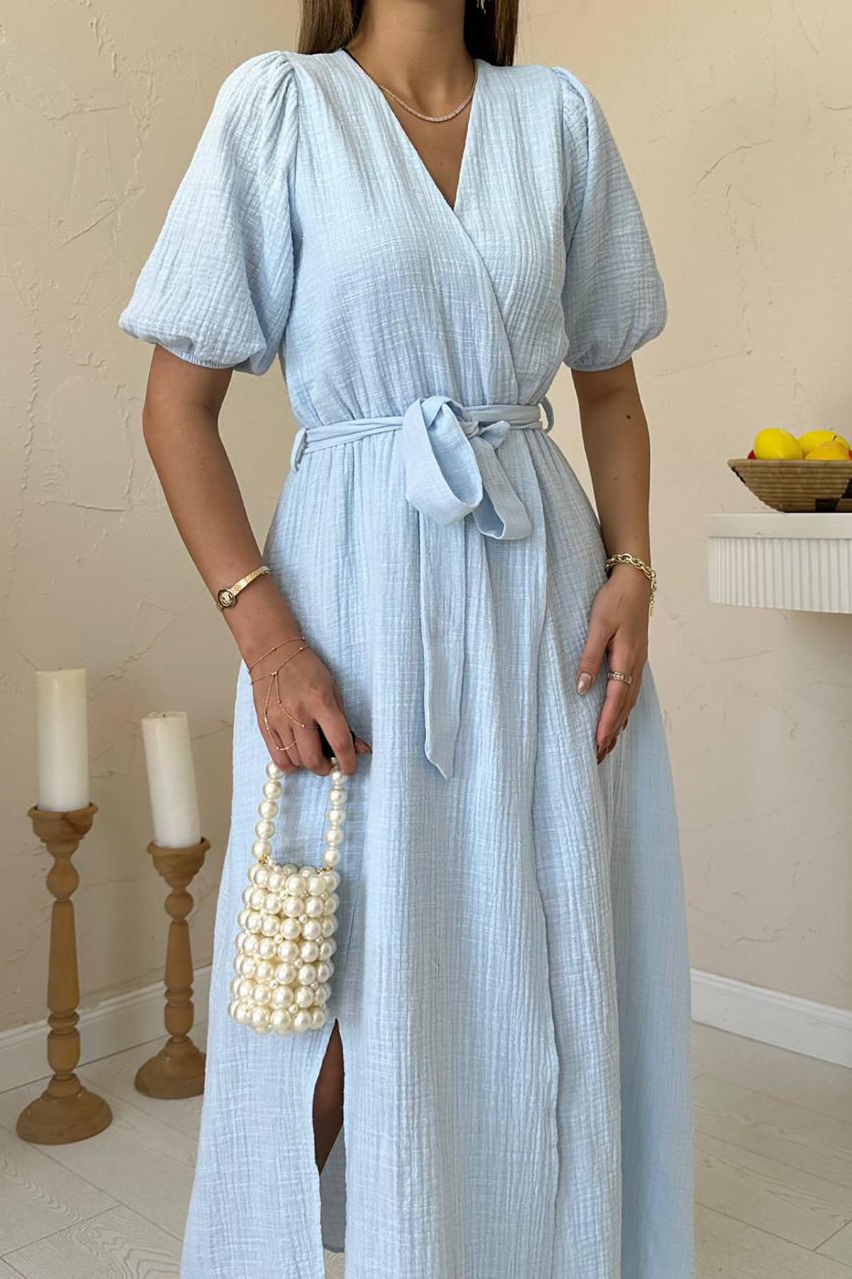 Toptan Bebe Mavi Kruvaze Yaka Müslin Keten Elbise