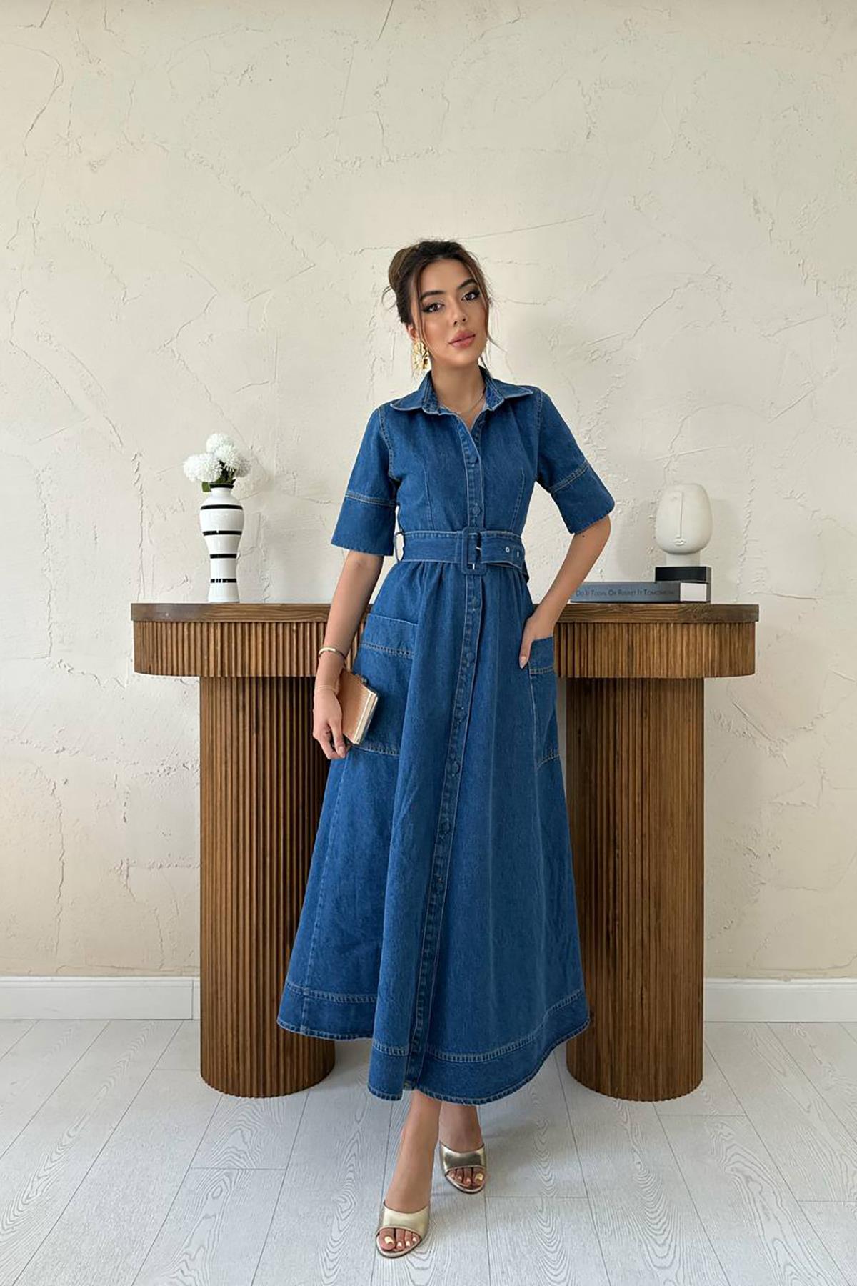 Toptan Mavi Yanları Cepli Kot Elbise