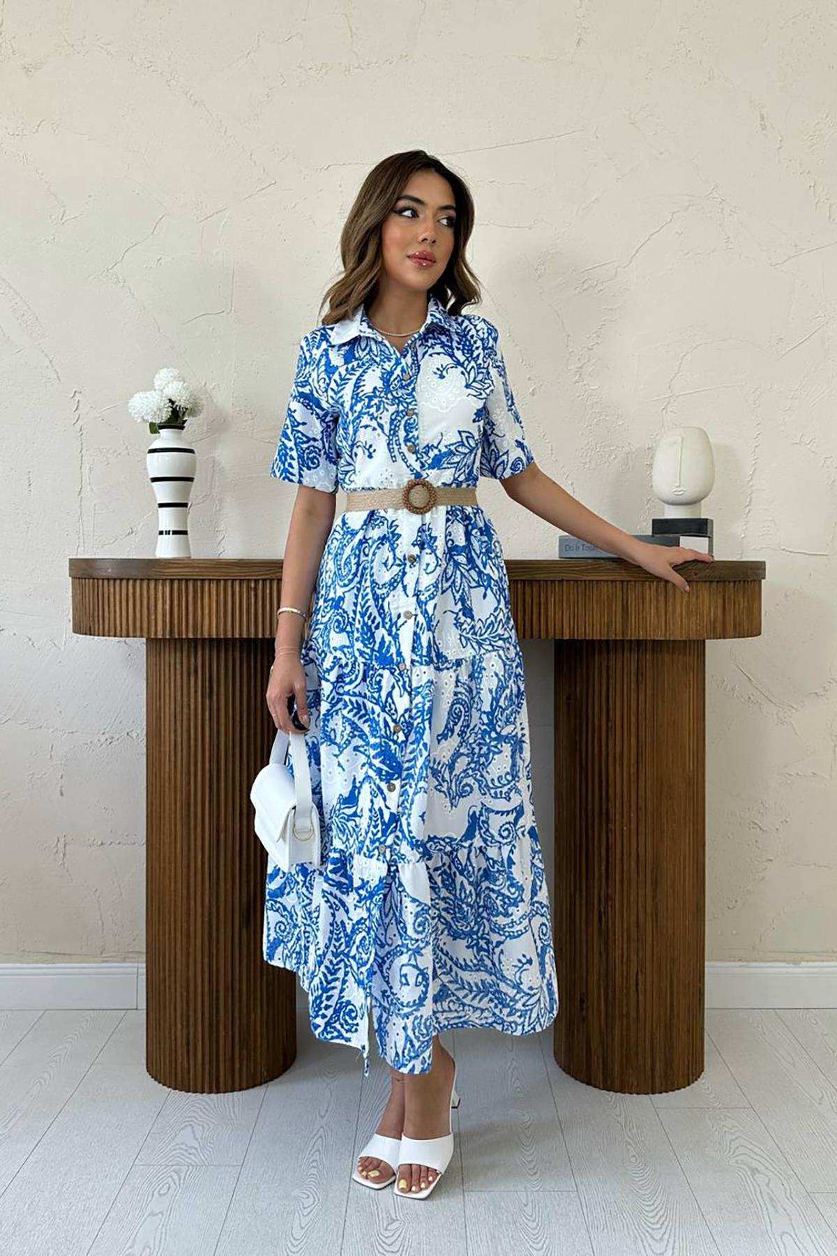 Toptan Mavi Brodeli Kolları Bağcıklı Elbise