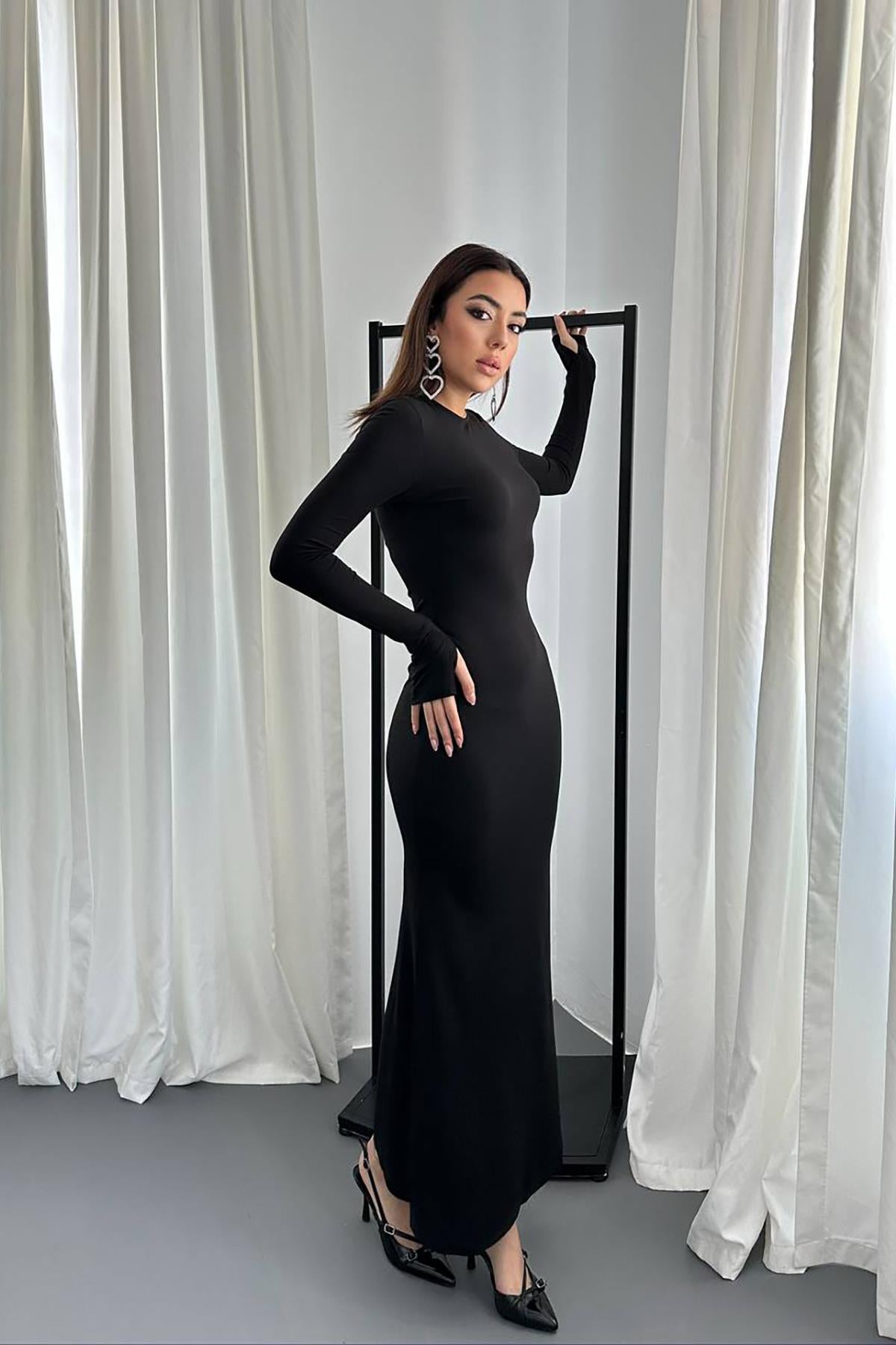 Toptan Siyah Vücudu Saran Uzun Elbise
