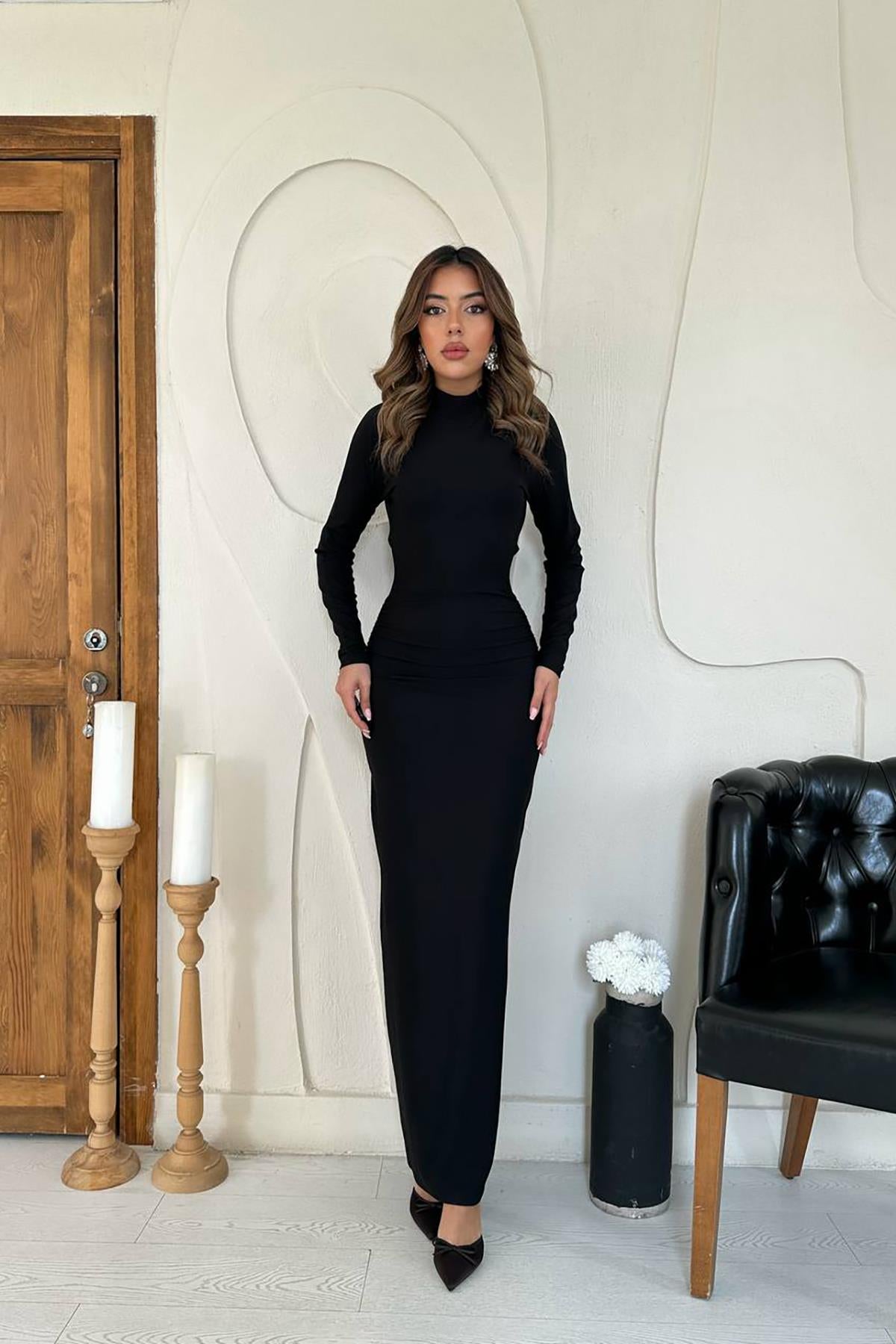 Toptan Siyah Arka Dekolteli Büzgülü Elbise