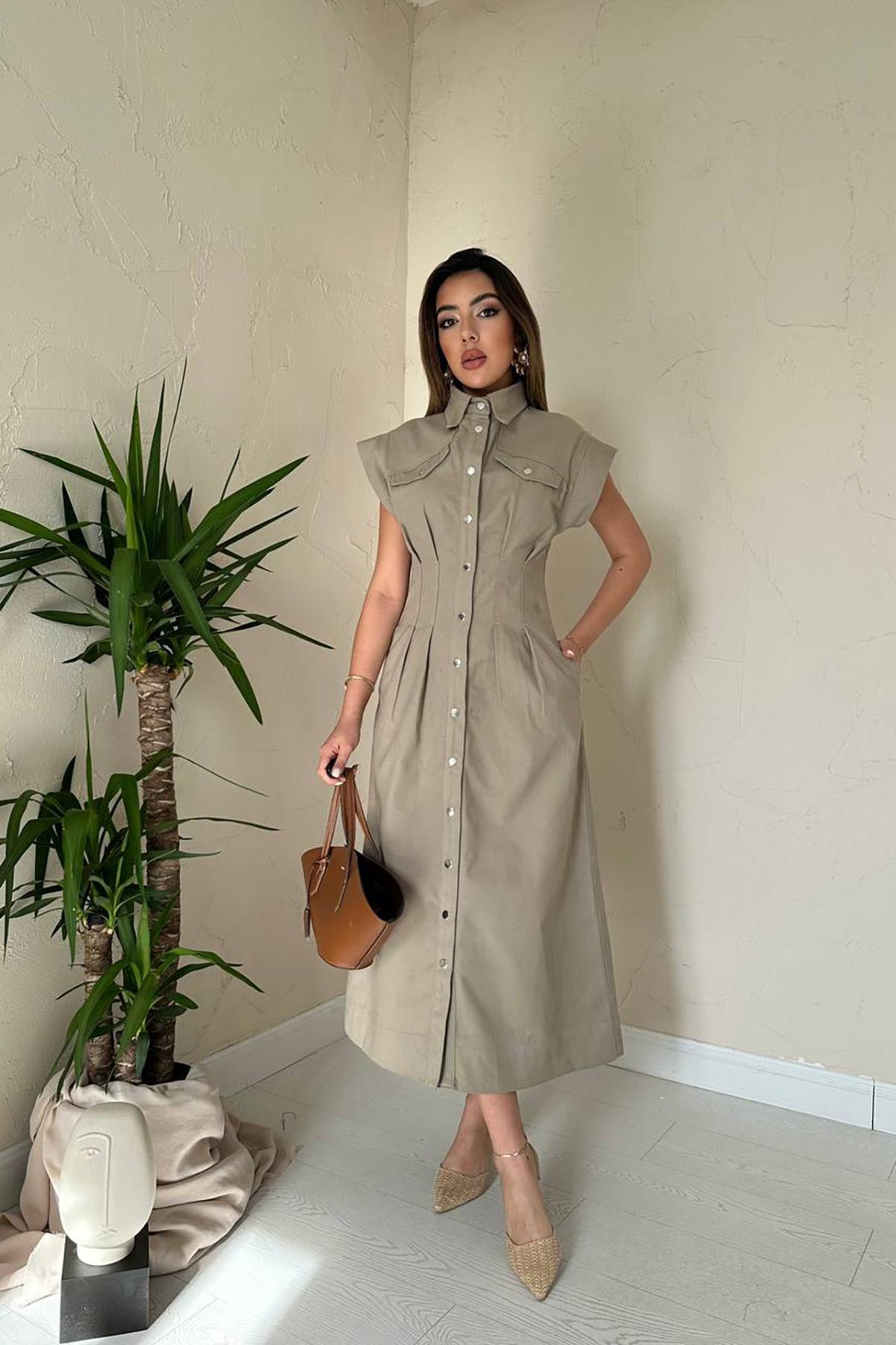 Toptan Bej Pileli Gabardin Elbise