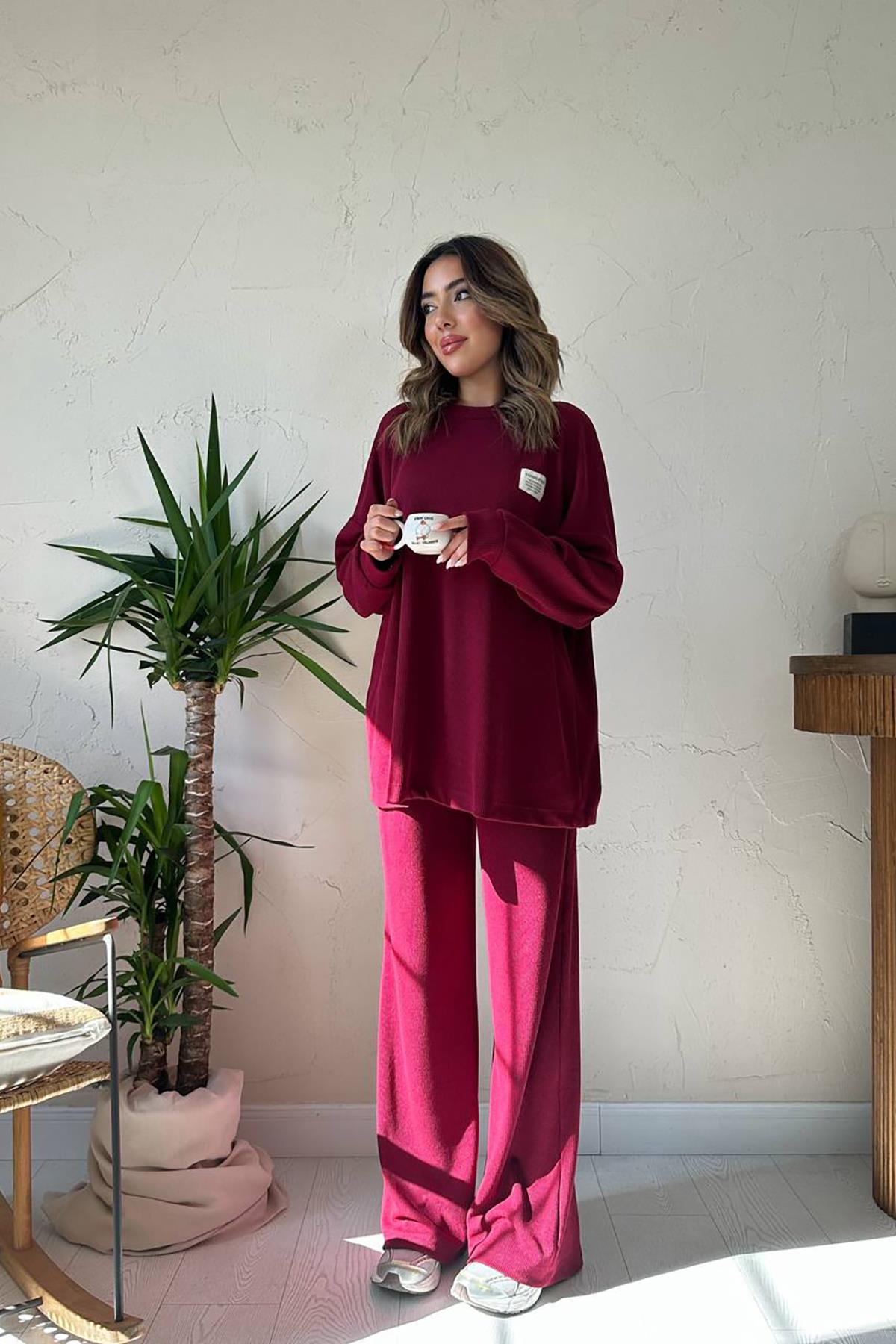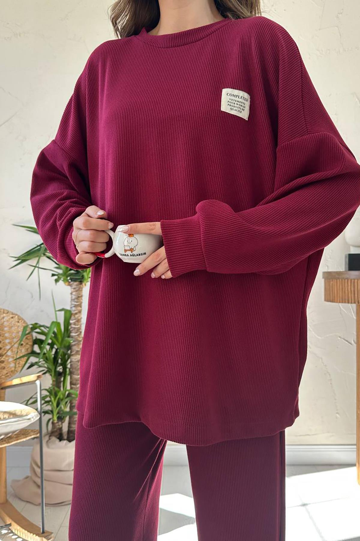 Toptan Bordo Klasik Fitilli Kazak Ve Pantolon Takım