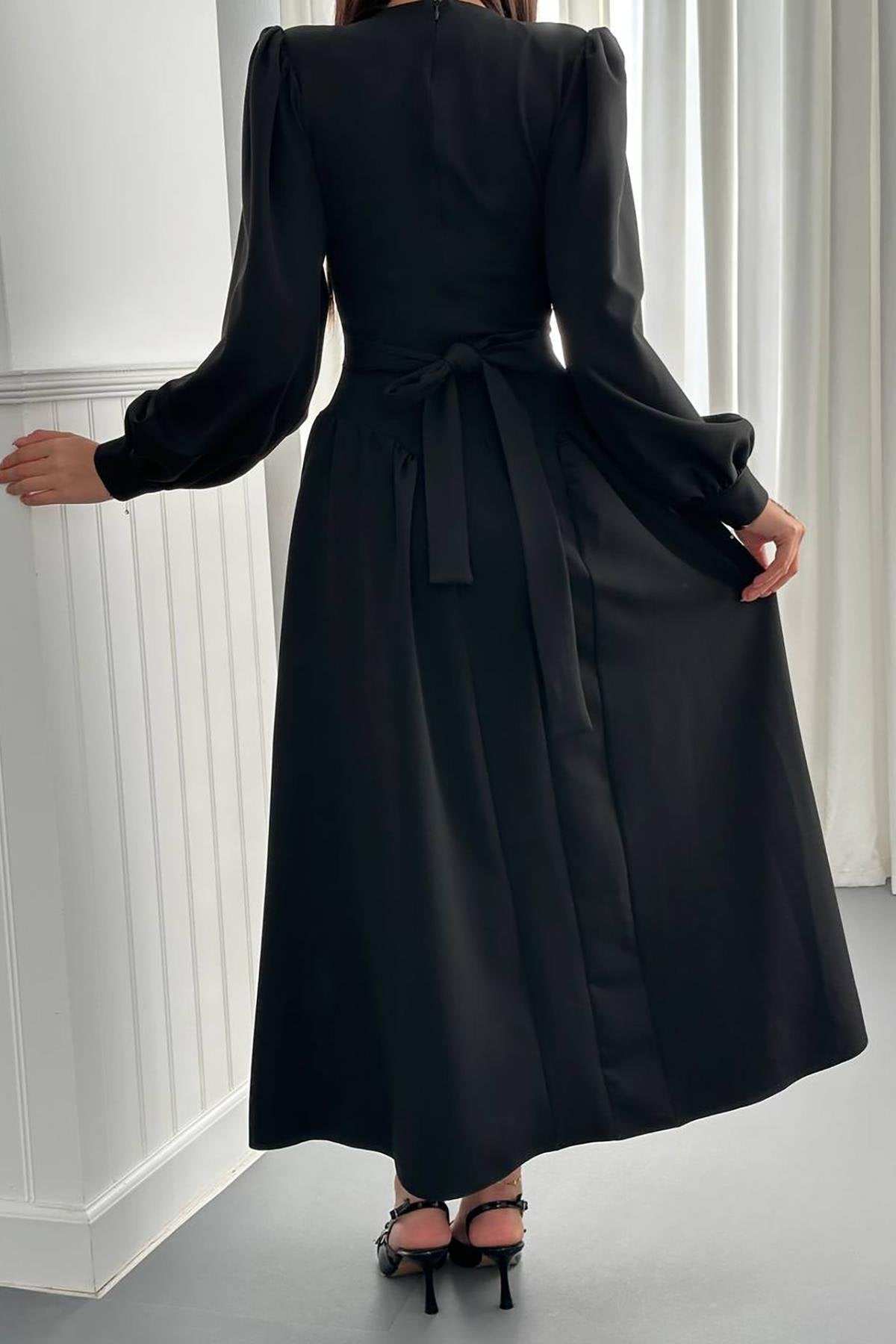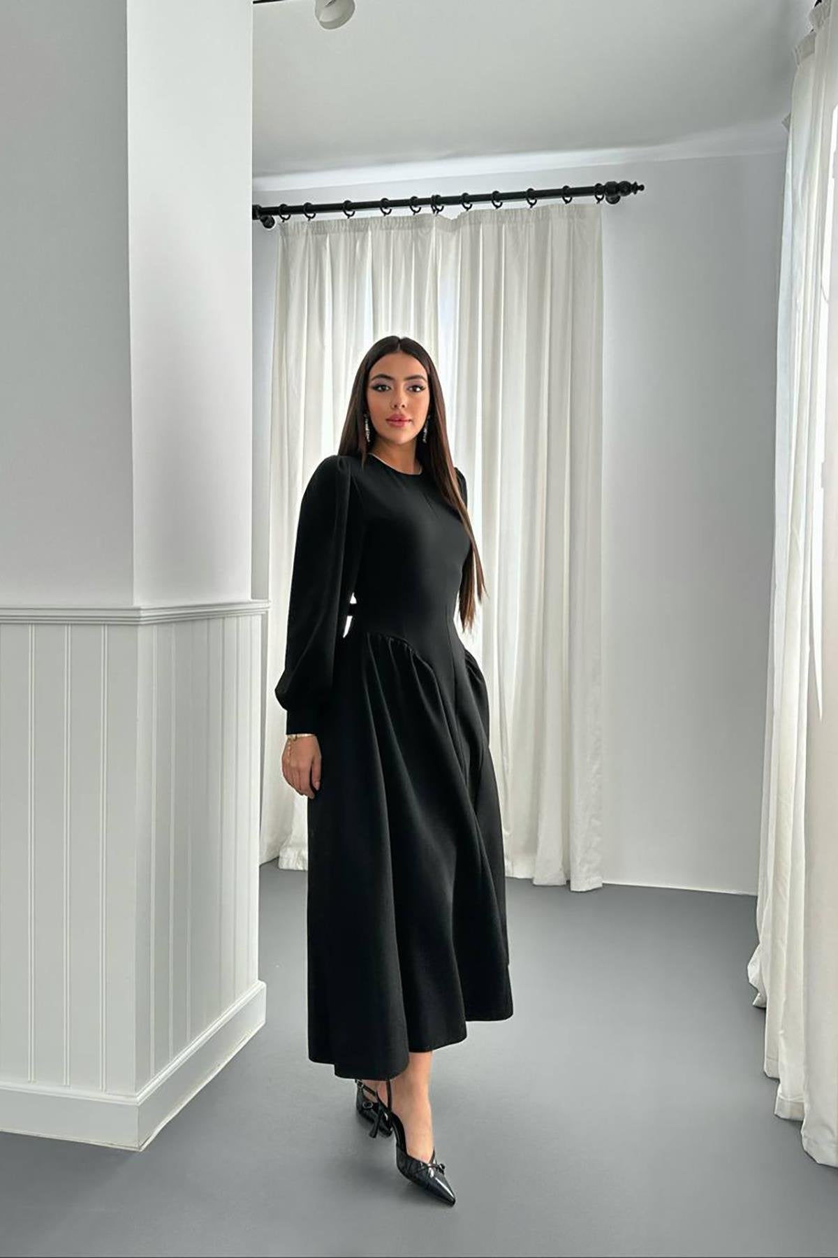 Toptan Siyah Yanları Büzgülü Uzun Kollu Elbise