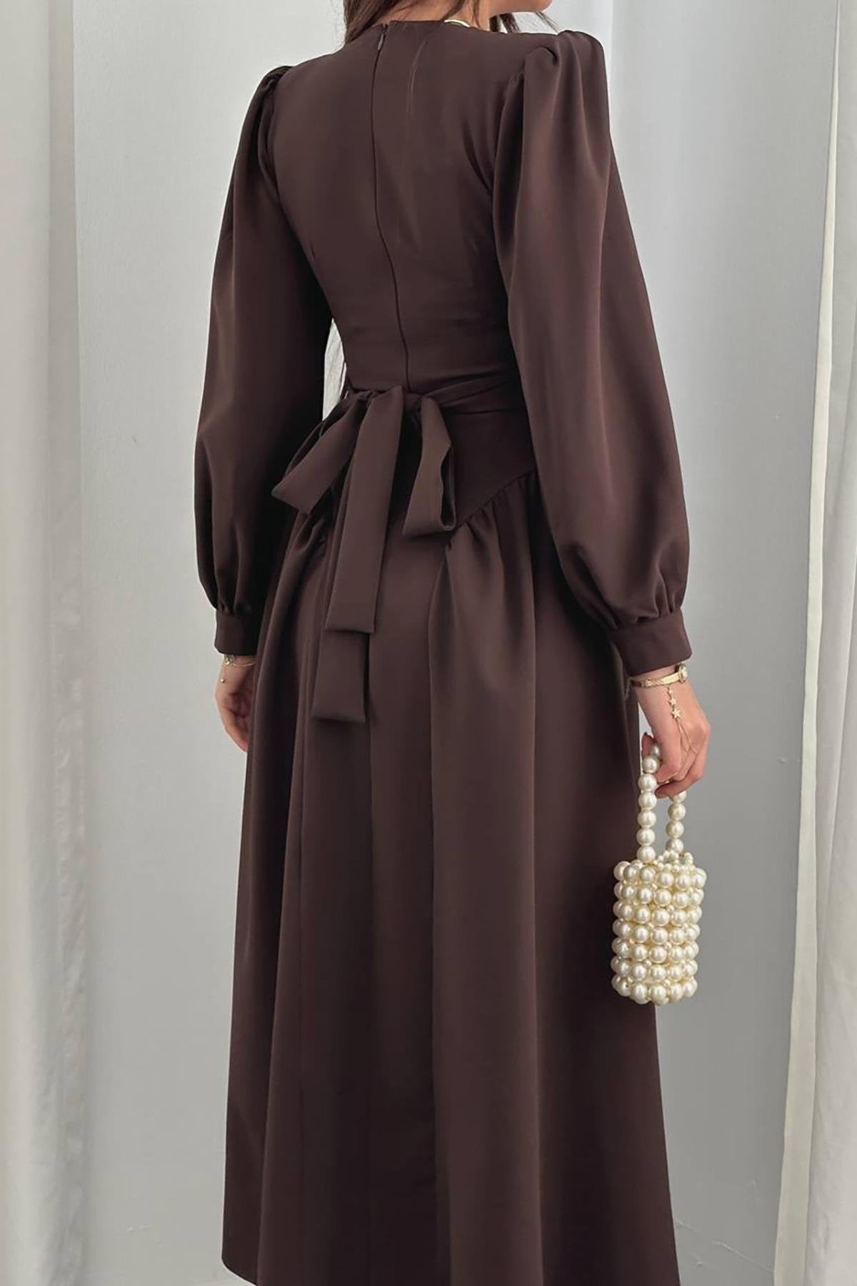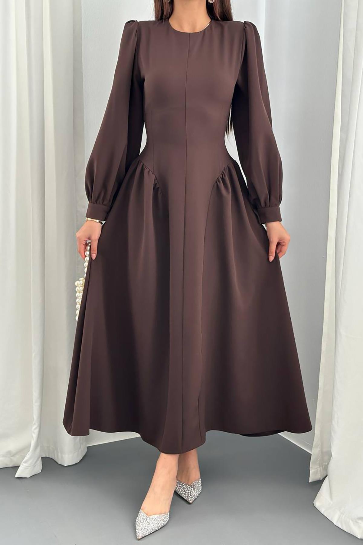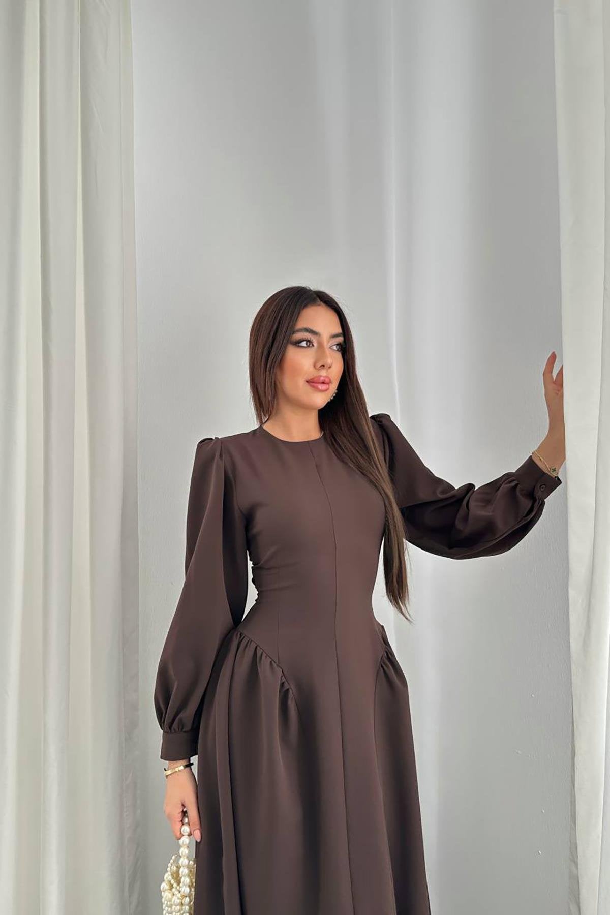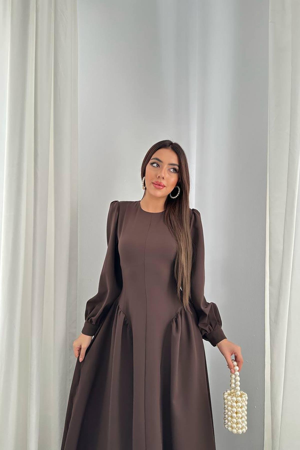 Toptan Kahverengi Yanları Büzgülü Uzun Kollu Elbise