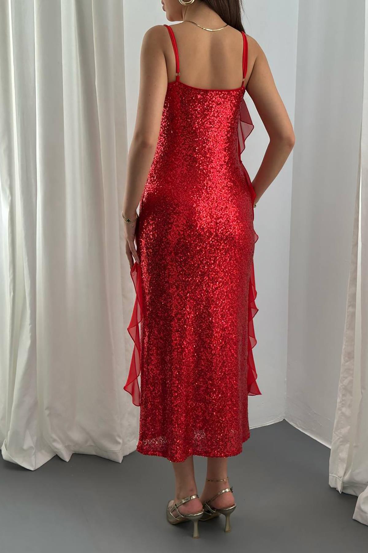 Toptan Kırmızı Pul Payetli Şifon Fırfırlı Elbise
