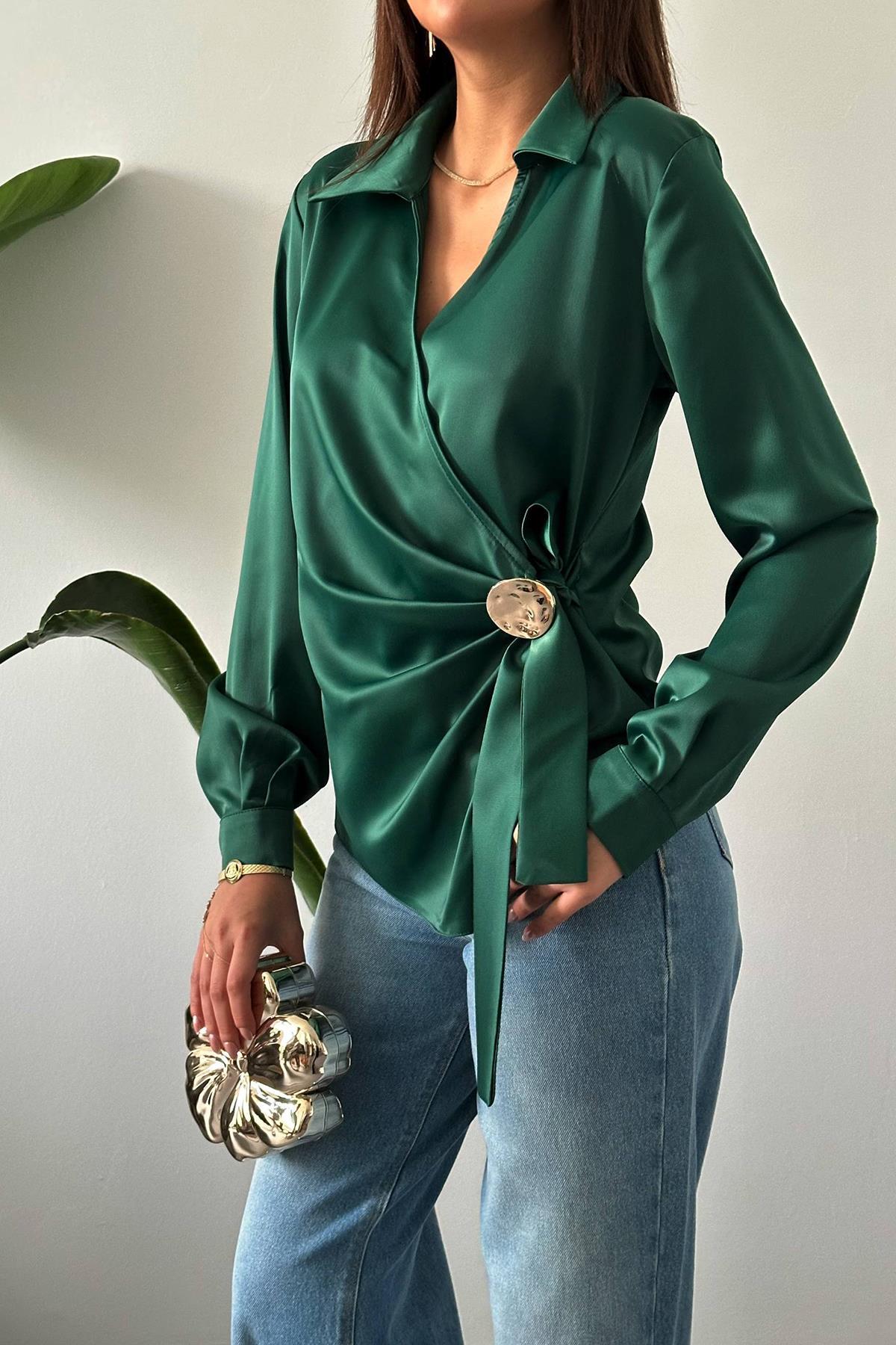 Toptan Zümrüt Düğme Detaylı Saten Bluz