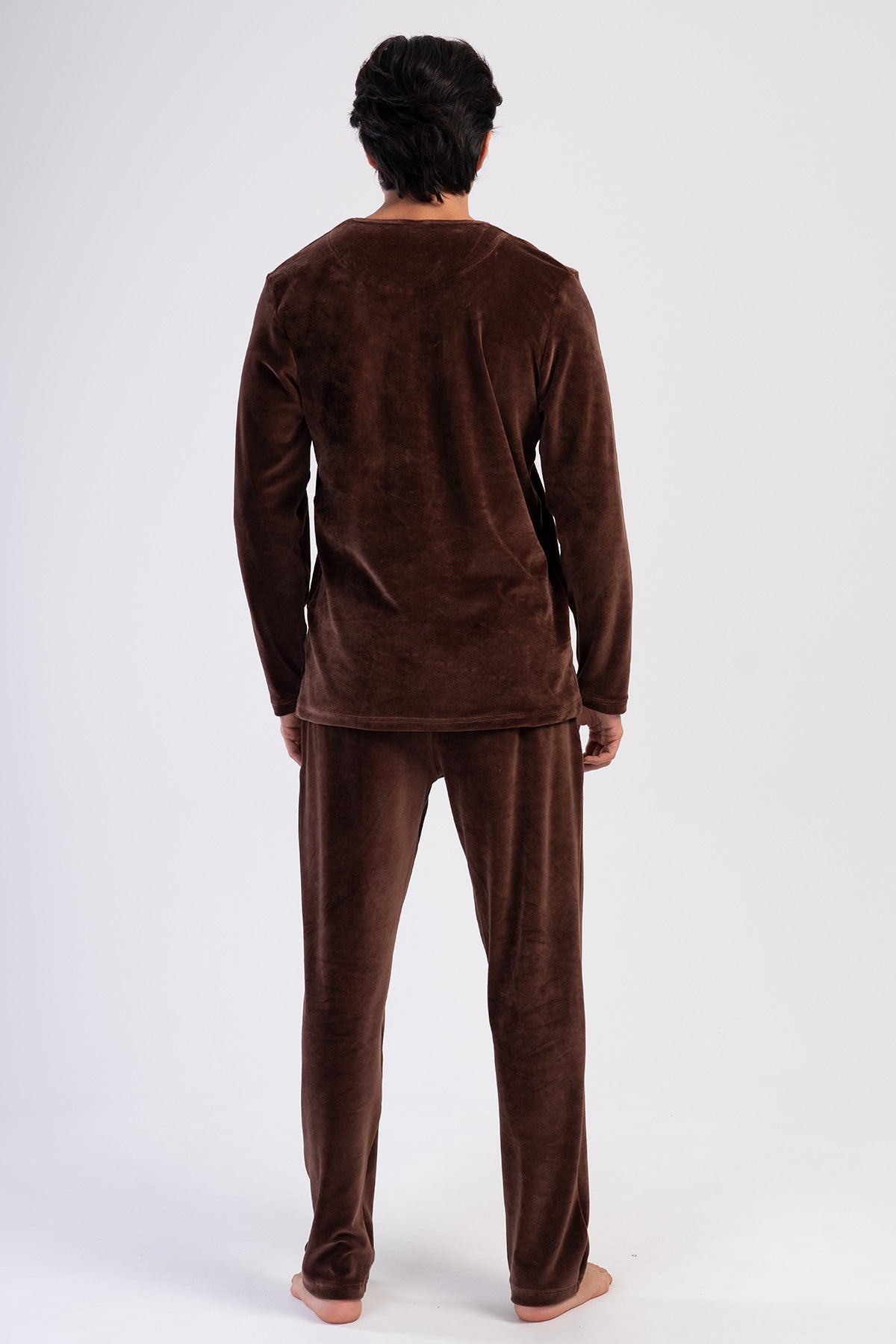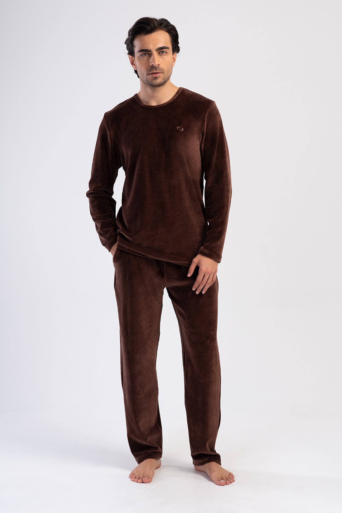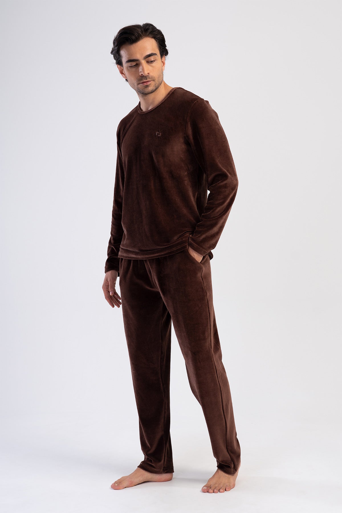 Man Brown Velvet O Neck Long Sleeve Pyjama Set