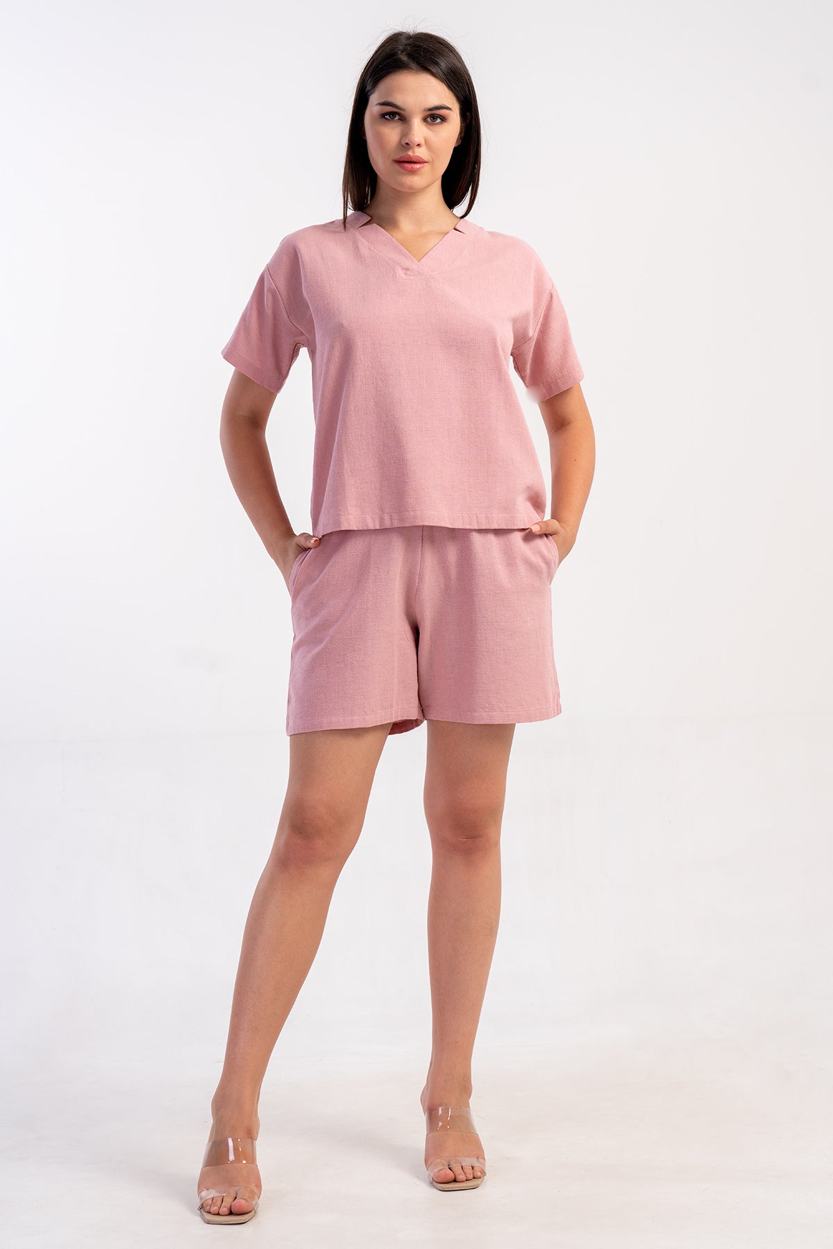 KADIN KIBRIS V YAKA PAT V DETAYLI KISA KOL BLUZ CEPLI KEMER LASTIKLI SORT TAKIM