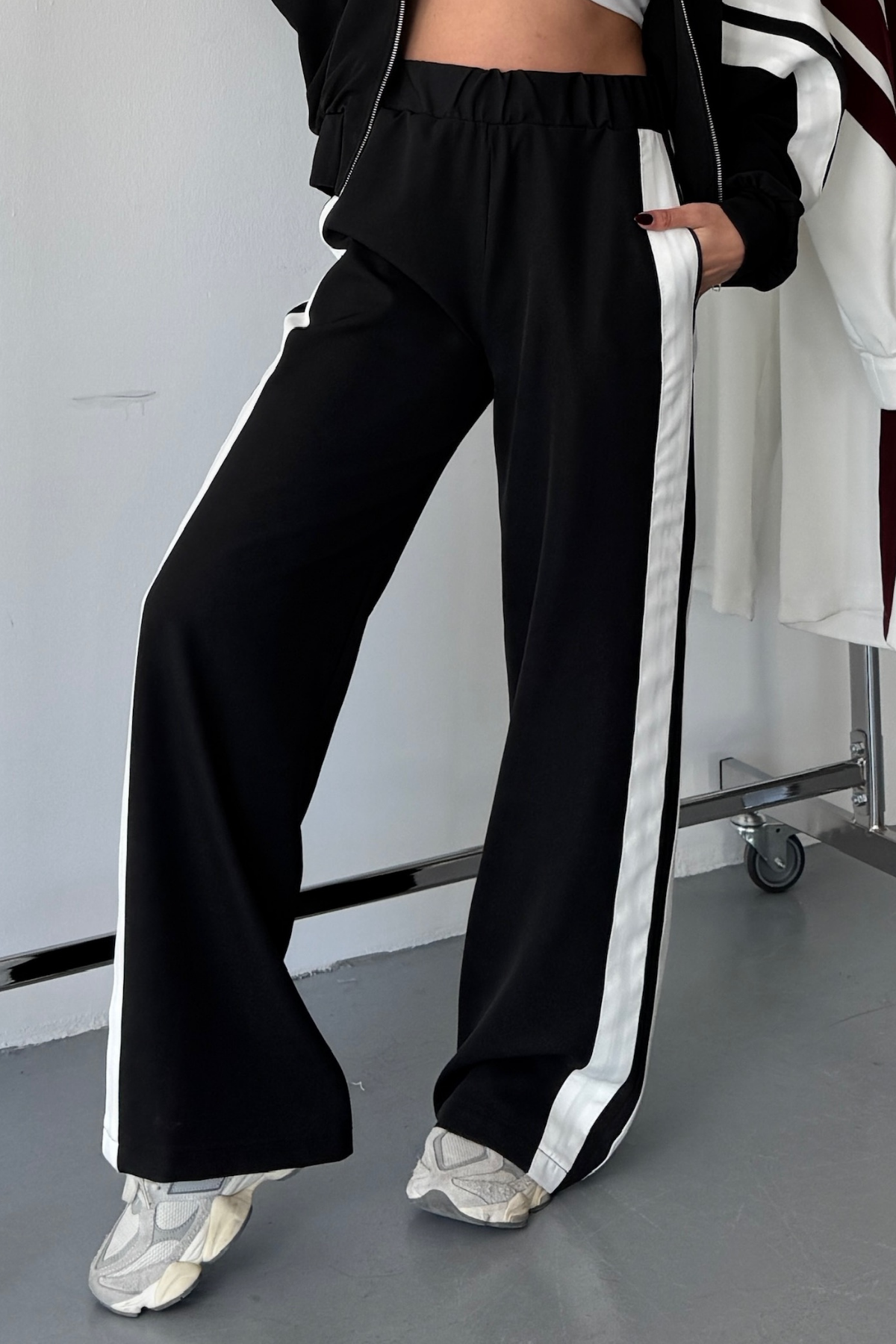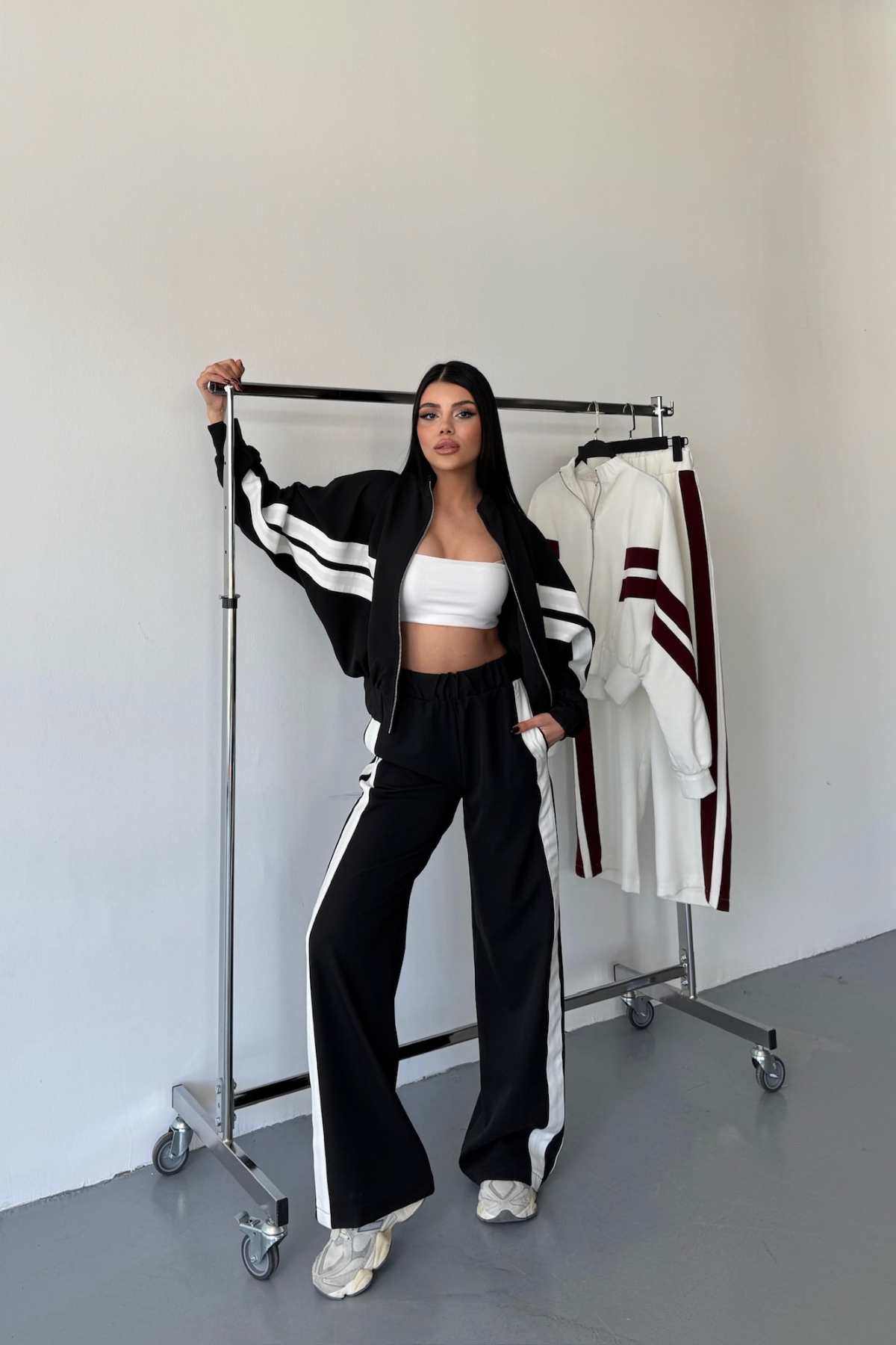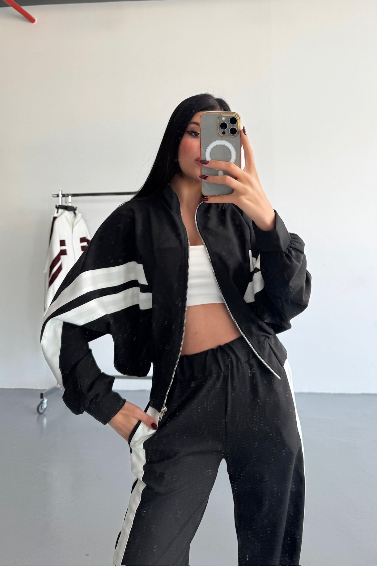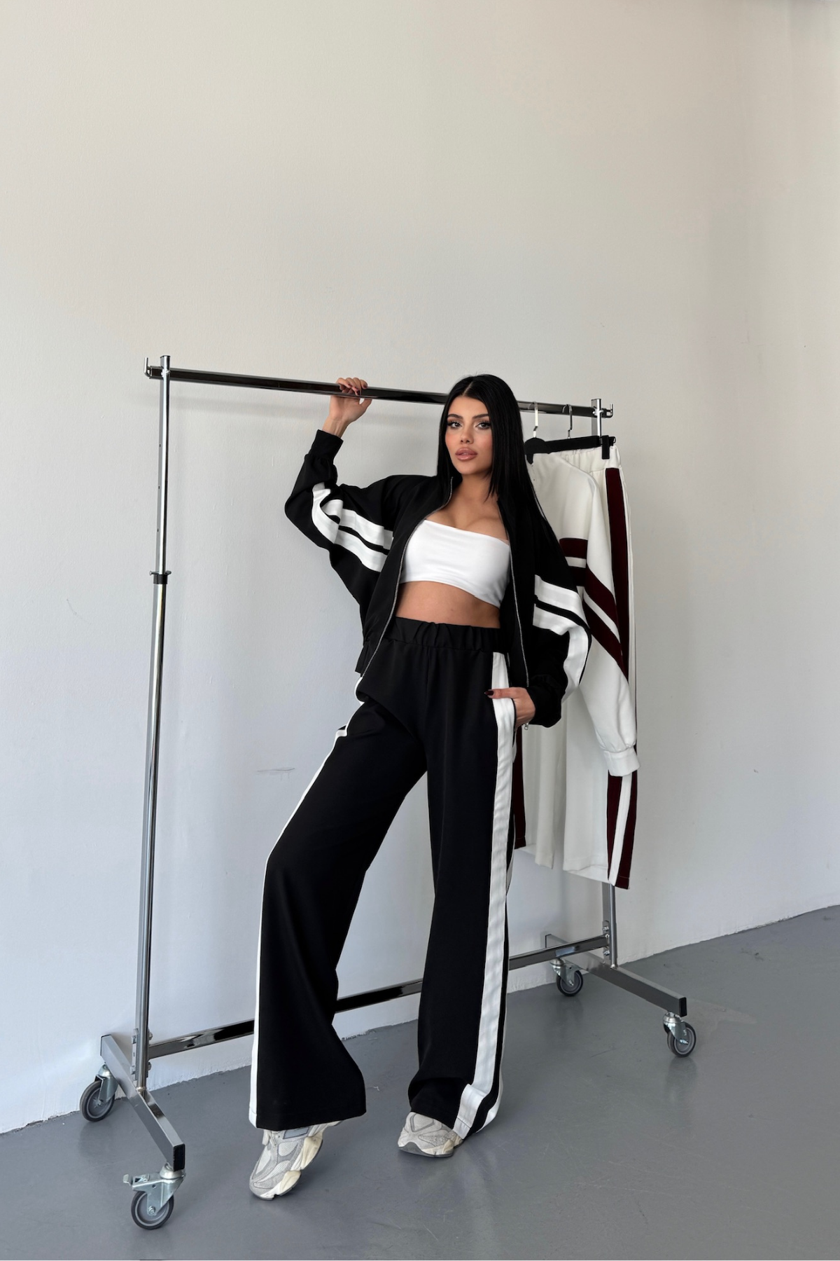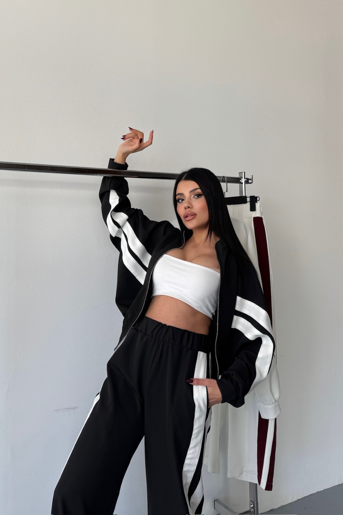 YANLAR KALIN BEYAZ ŞERİTLİ EŞOFMAN TAKIM - Siyah