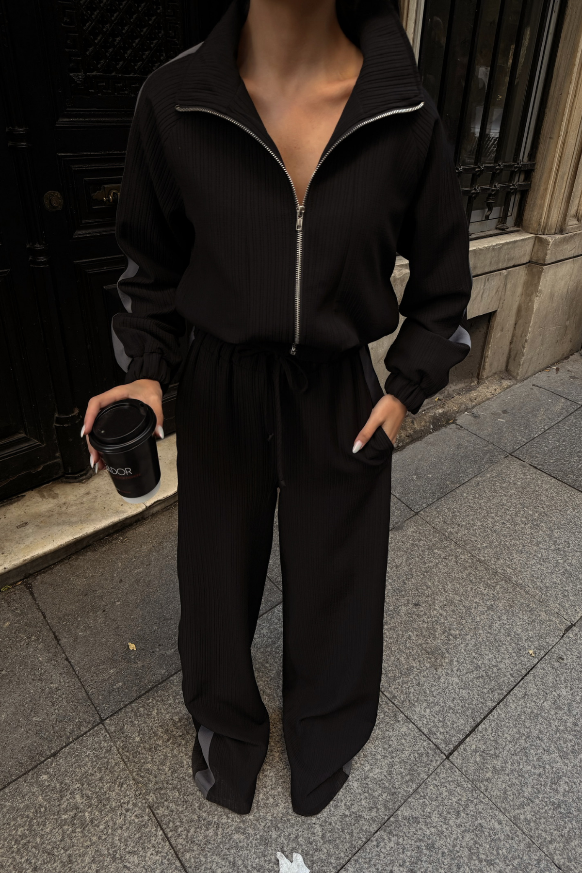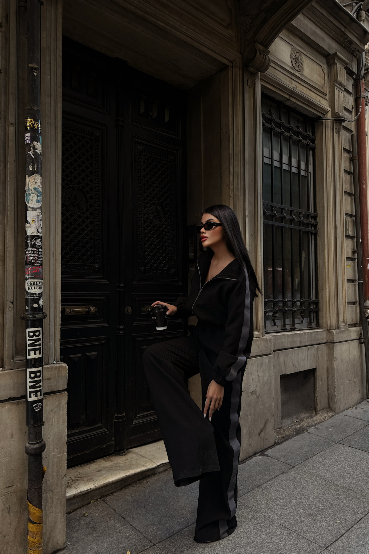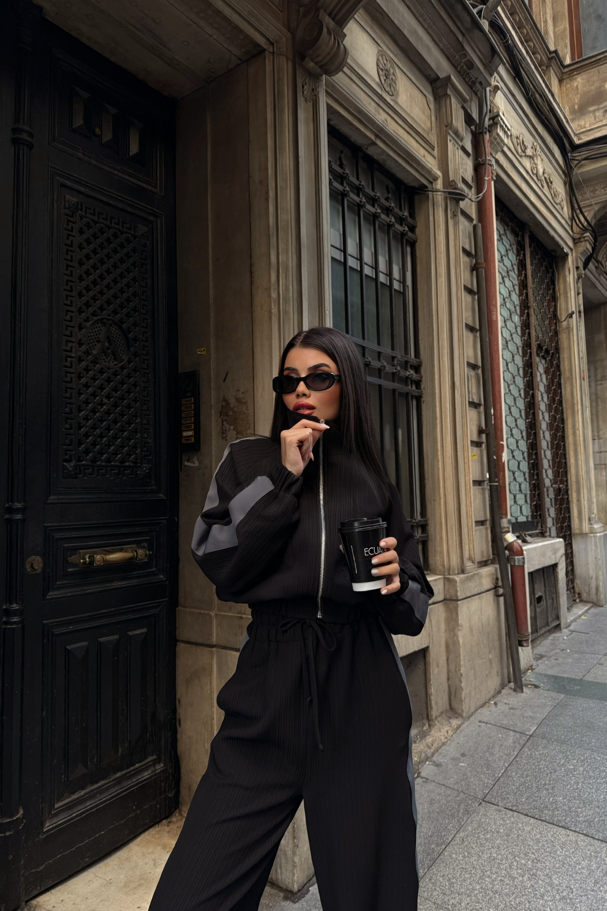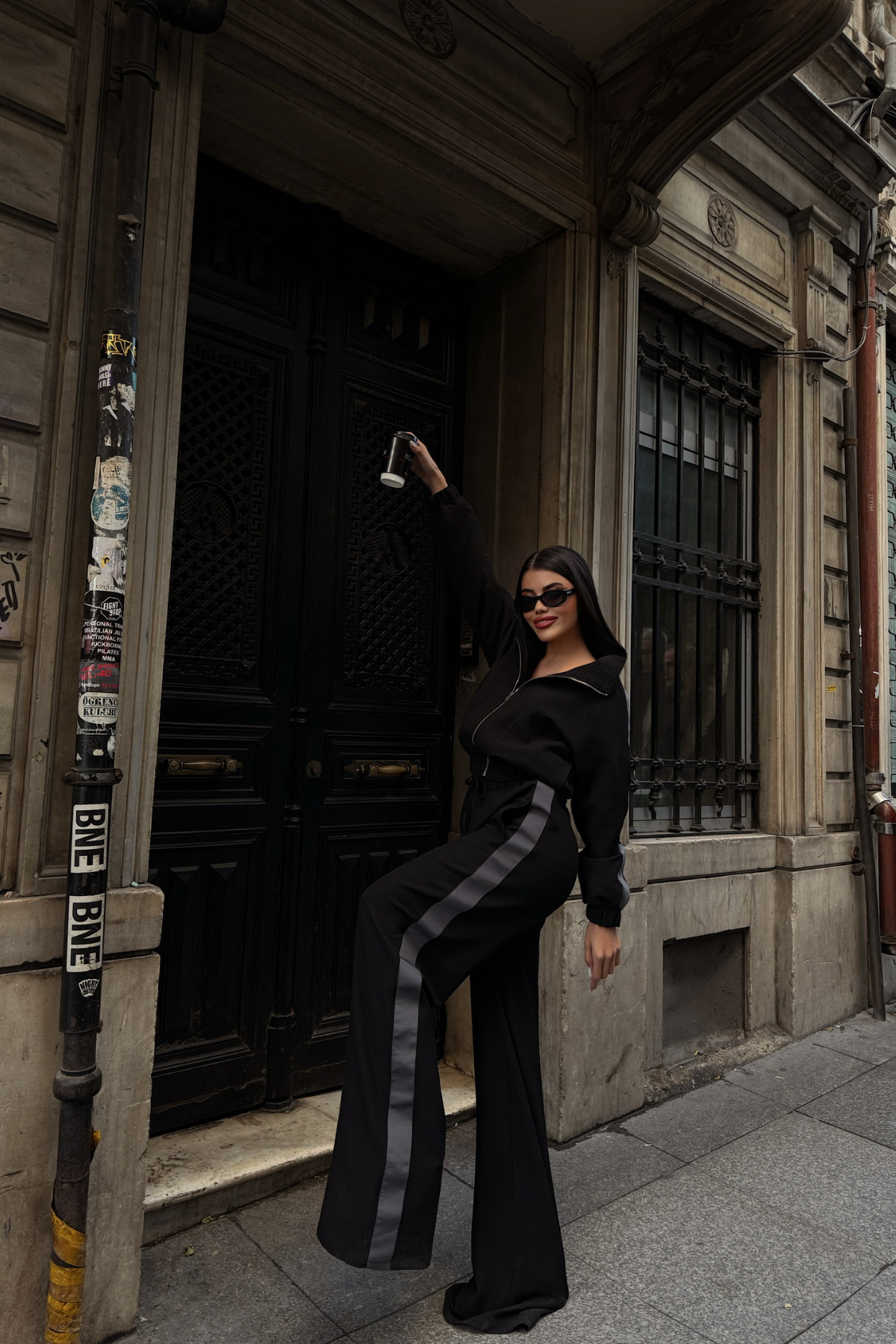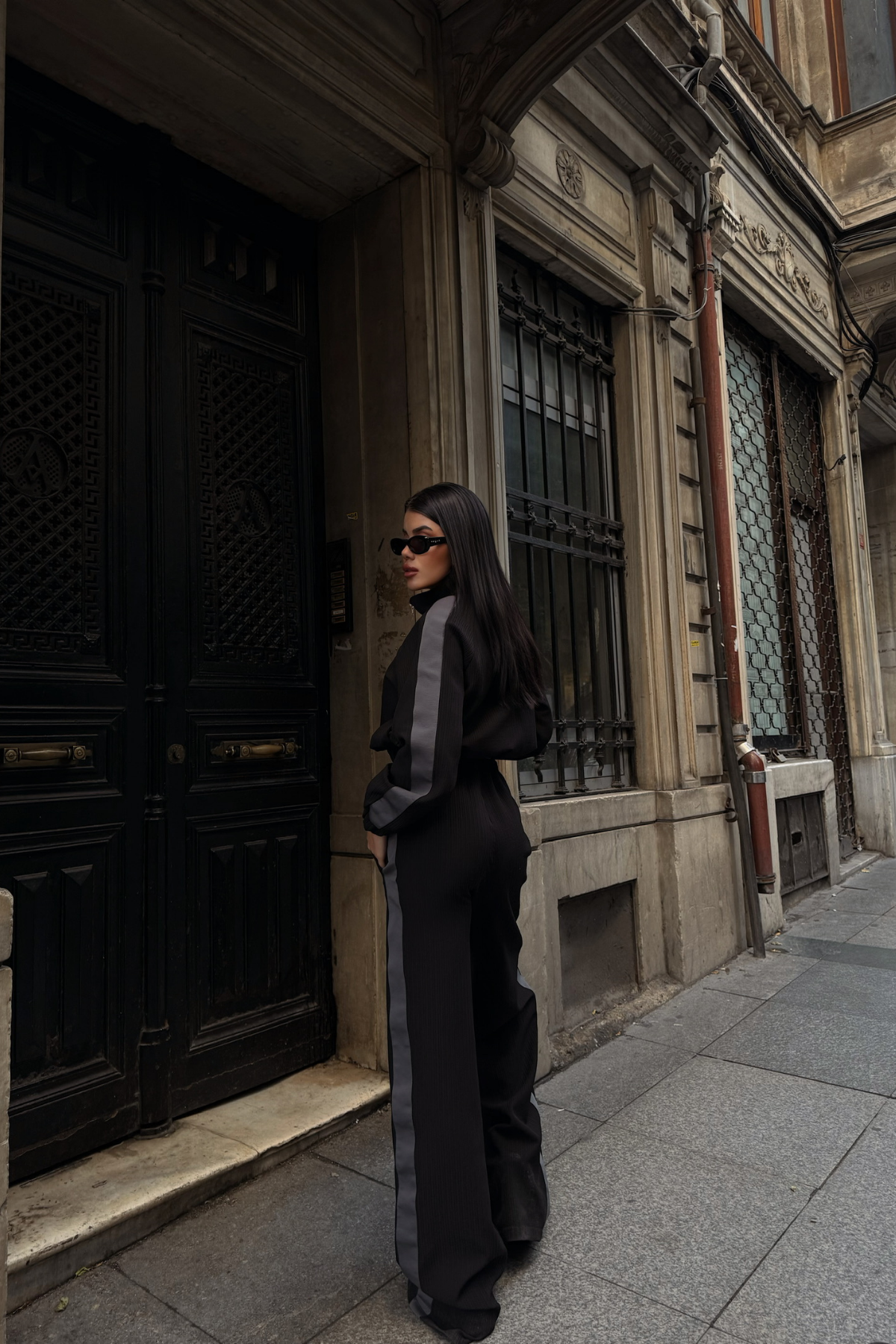 YANLARI ŞERİT DETAYLI OTTOMAN KAPİŞONLU EŞOFMAN TAKIM - Siyah