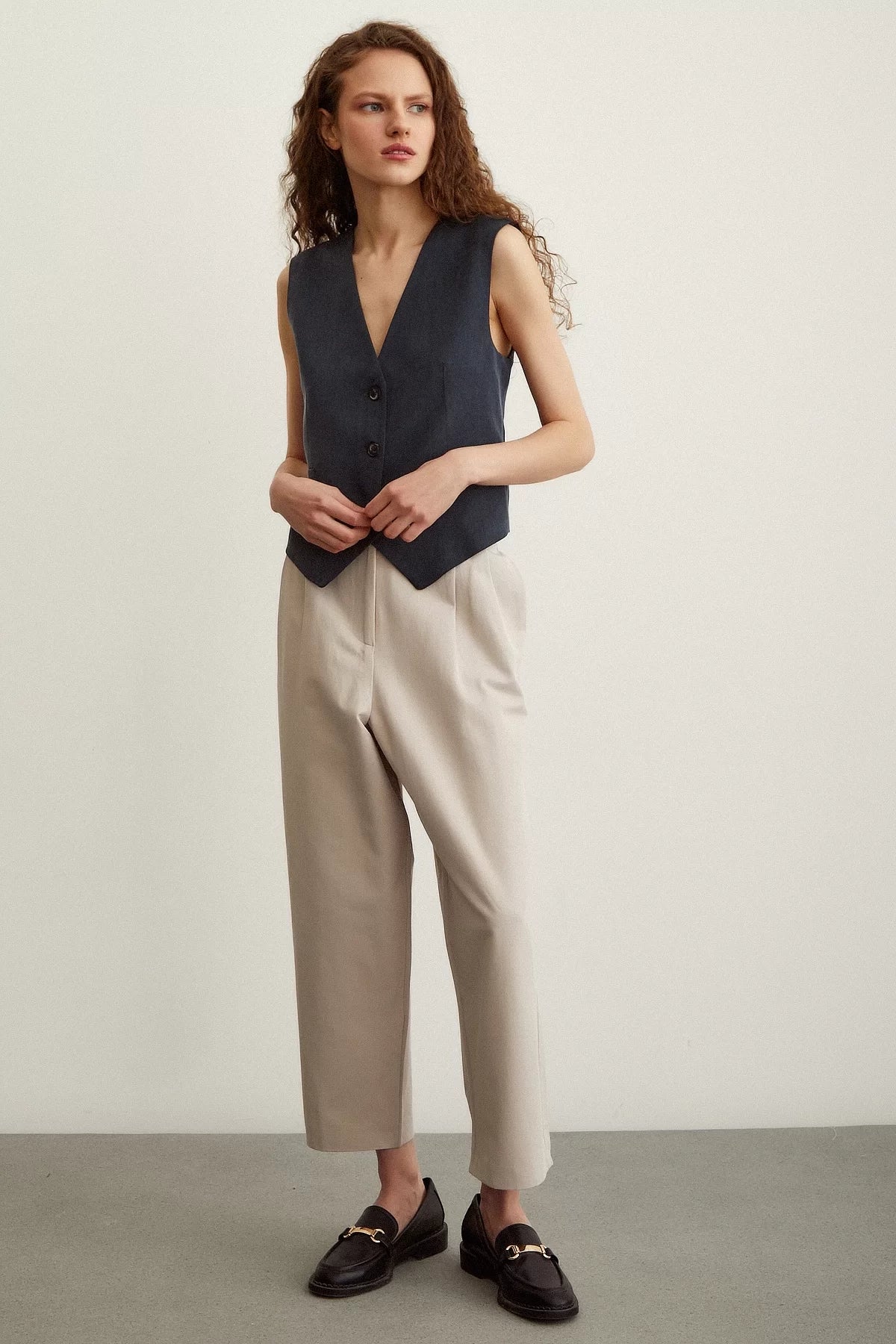 Önü Çift Pileli Pantolon - Taş
