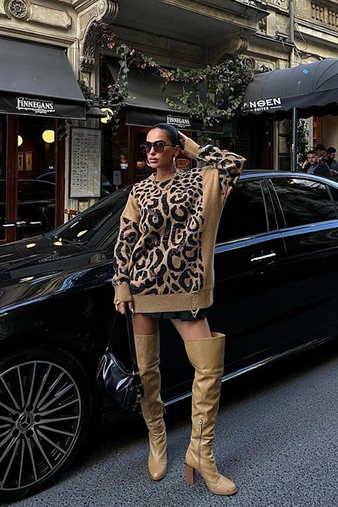 Leopar Desenli Yırtık Detaylı Kazak 1344