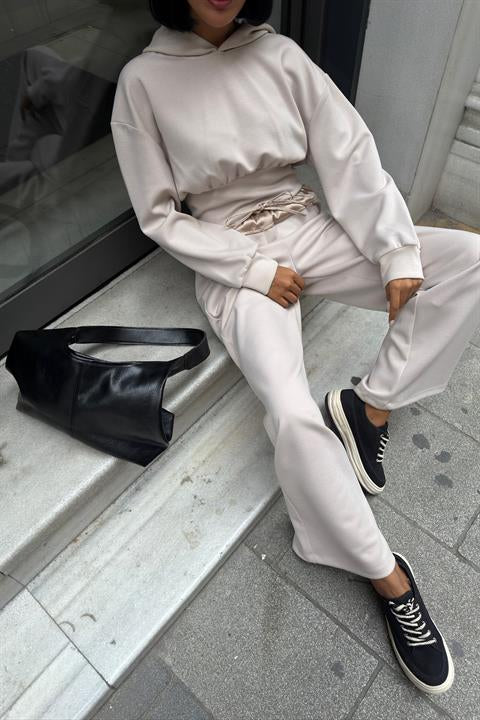 Beli Saten Detaylı Kapüşonlu Modal Takım 10242