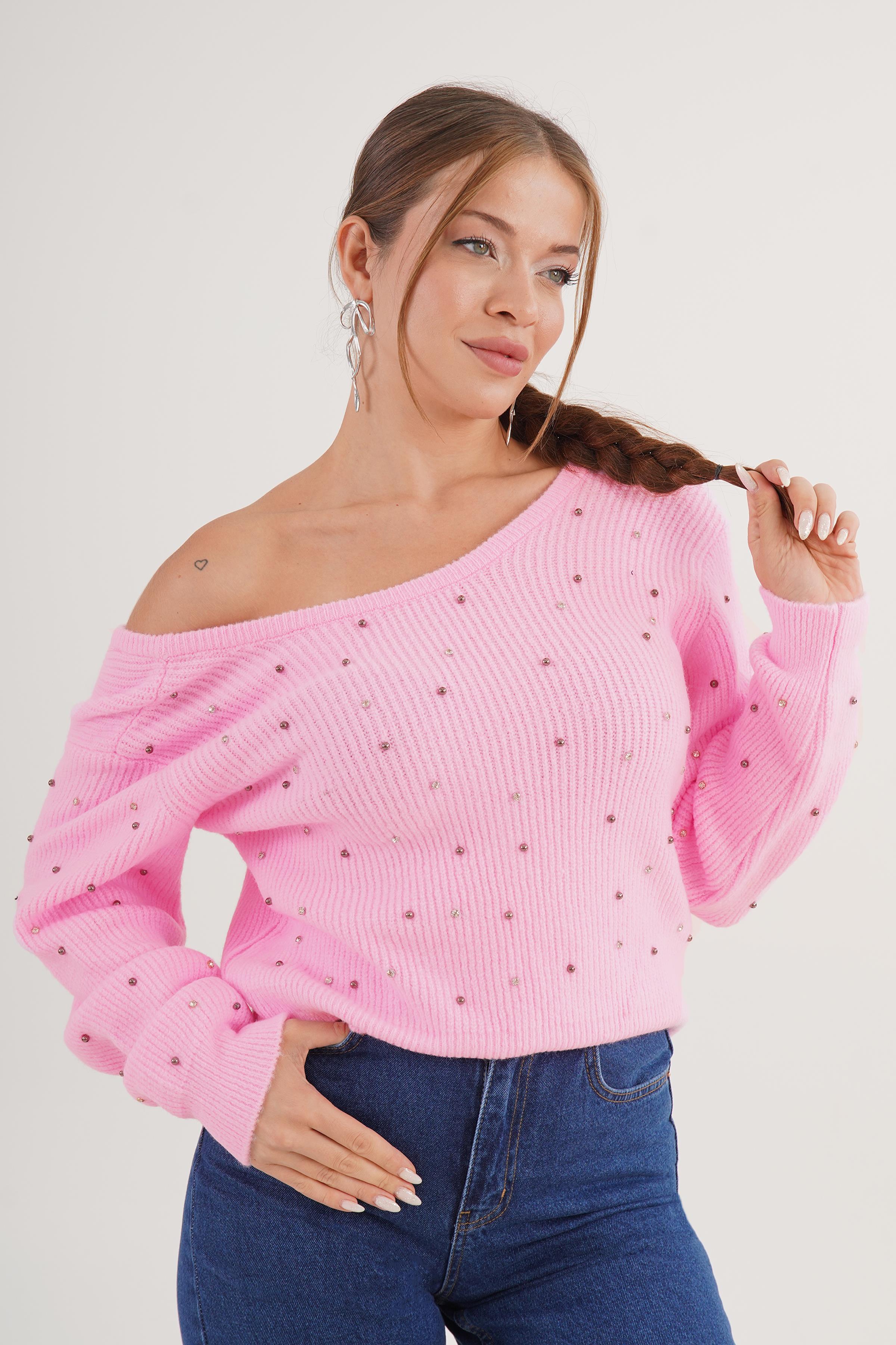 Sırt Dekolteli Taş İşlemeli Pembe Toptan Kazak