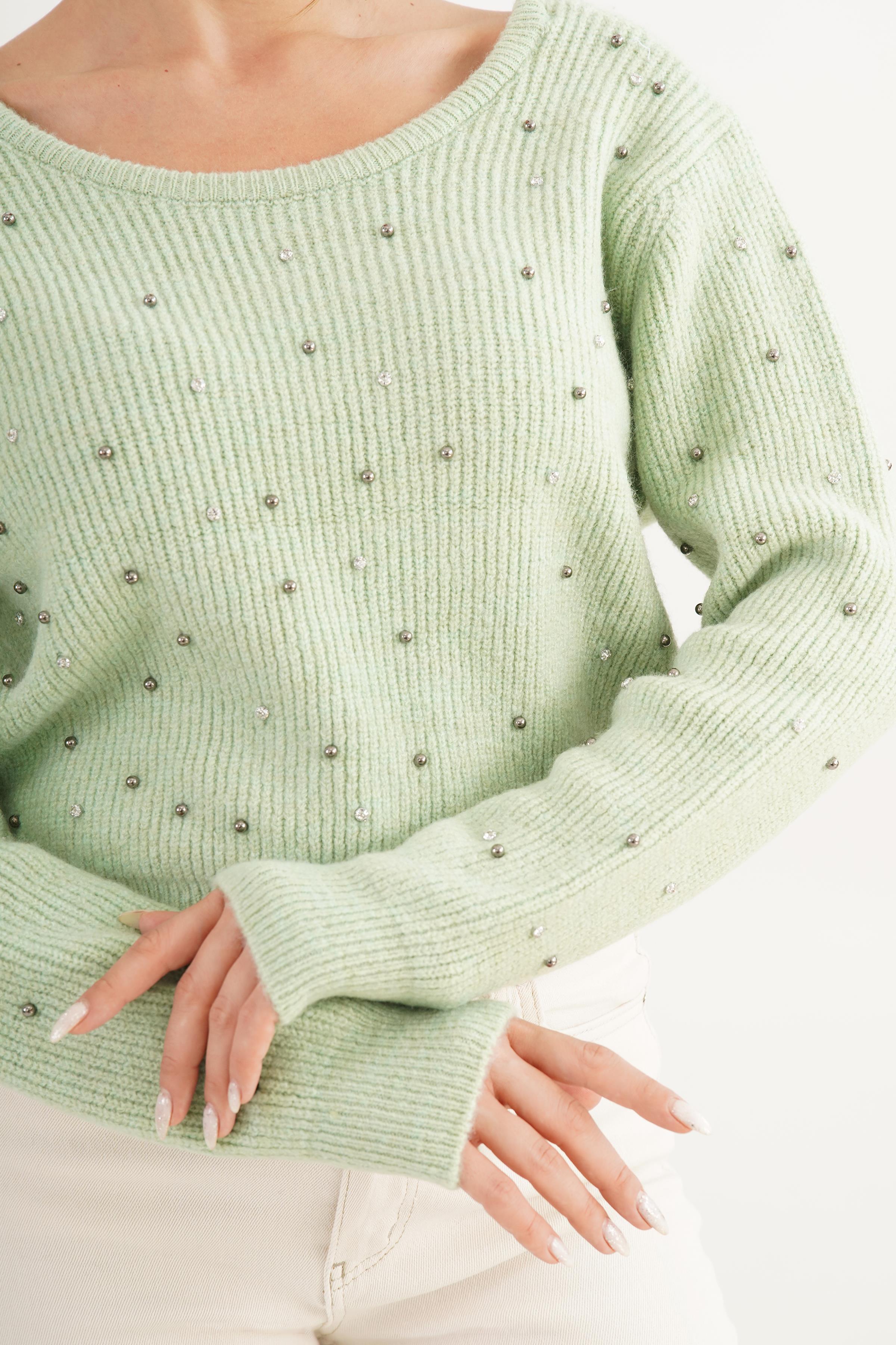 Sırt Dekolteli Yeşil İşlemeli Pembe Toptan Kazak