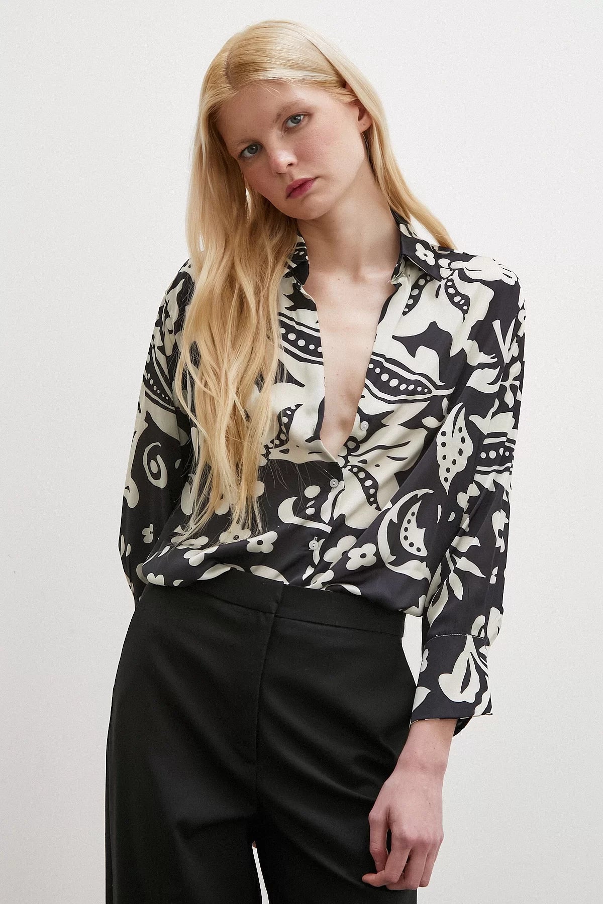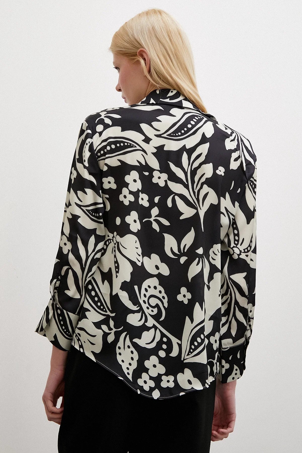 Çiçek Desenli Saten Gömlek - Siyah