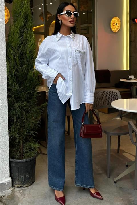 Yaka ve Cebi Taşlı Çizgili Over Gömlek 3406