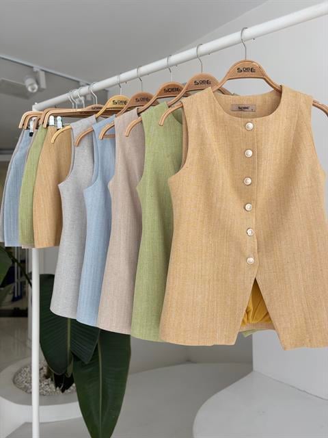 Uzun Yelek Mini Etek Flamlı Keten Takım 10148