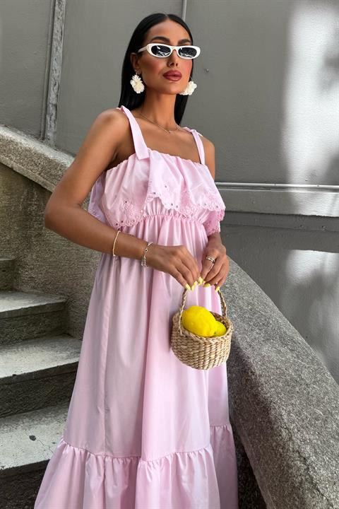 Etek Ucu Brode Nakışlı Boyundan Bağlamalı Elbise 2881