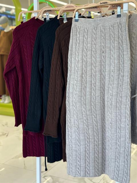 Saç Örgü Desenli Kuşaklı Triko Takım 10218