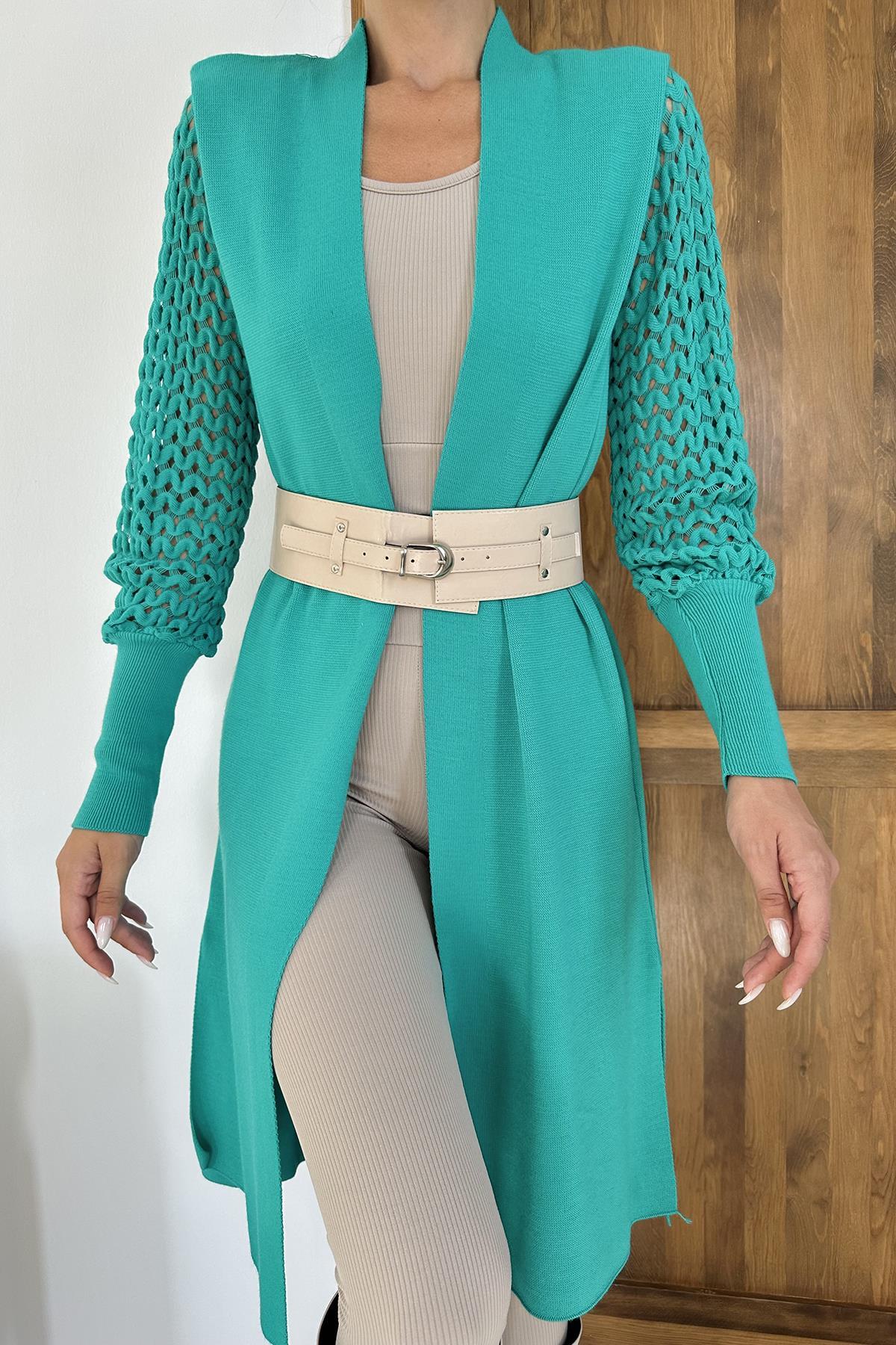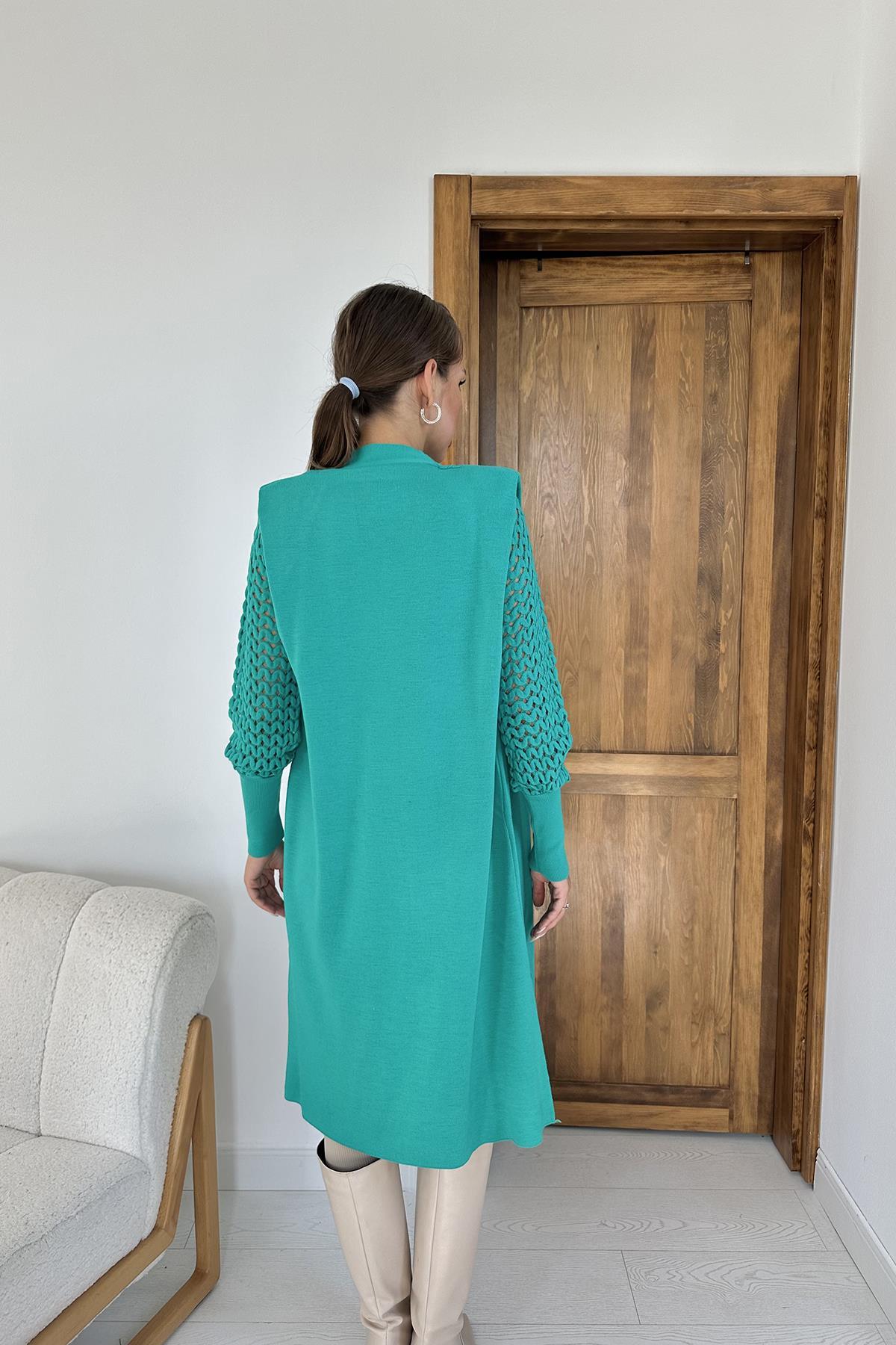 Toptan Yeşil Kolları Örgülü Triko Hırka