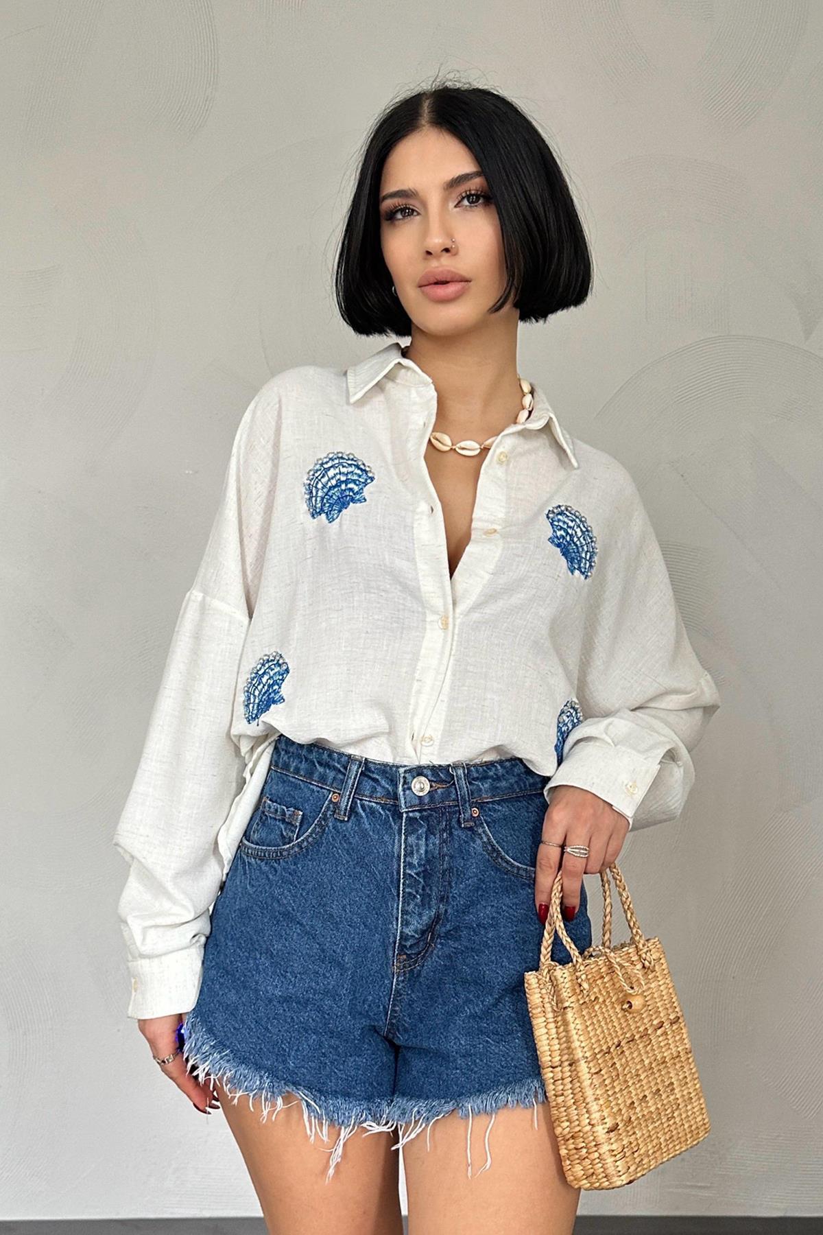 Toptan Beyaz Deniz Kabuk Desenli Gömlek