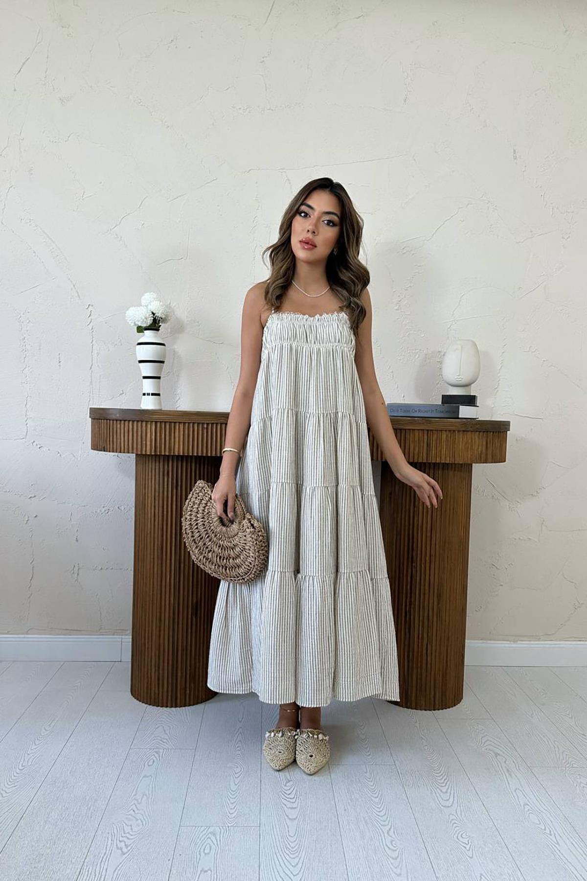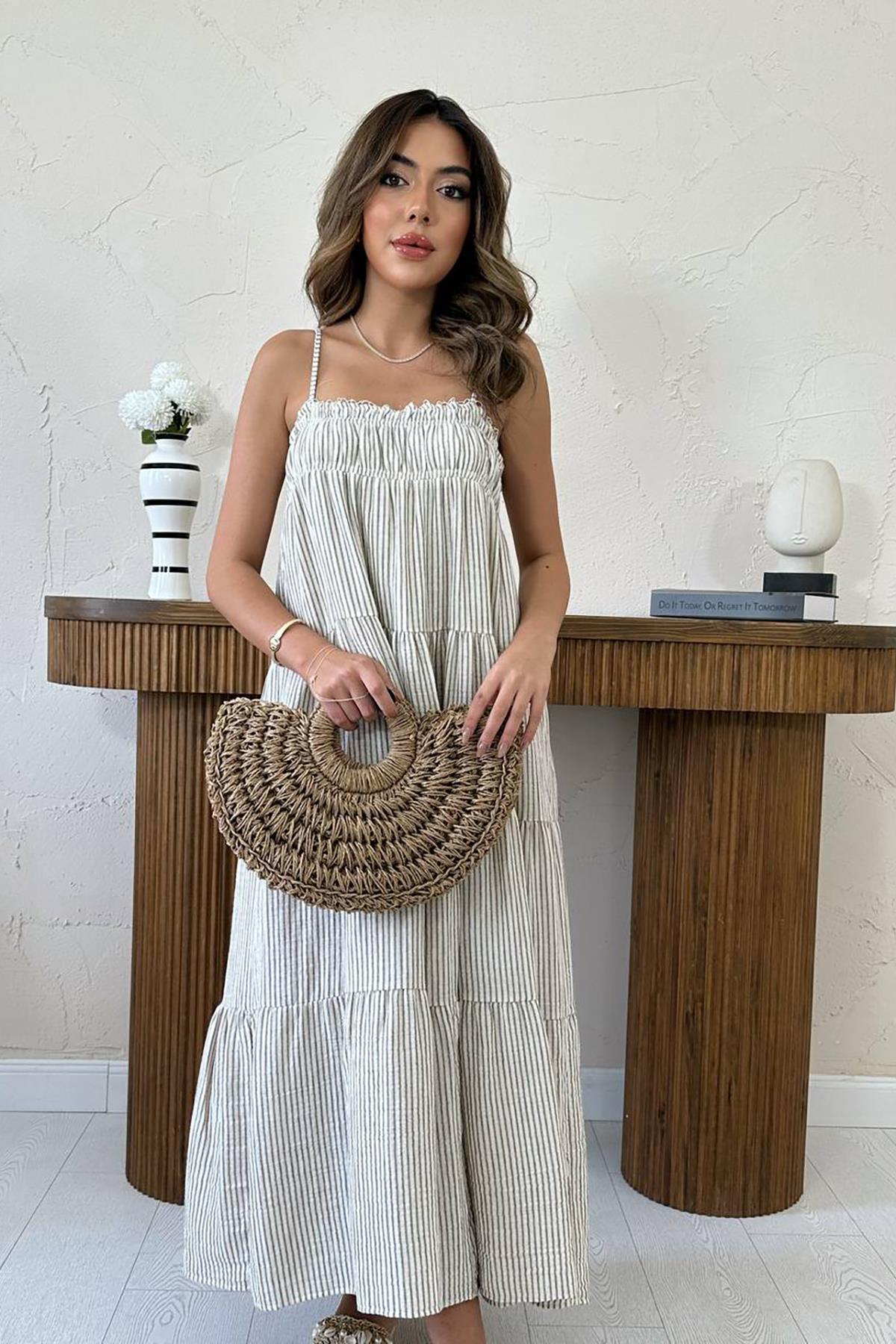 Toptan Kahverengi Askılı Parçalı Çizgili Müslin Elbise