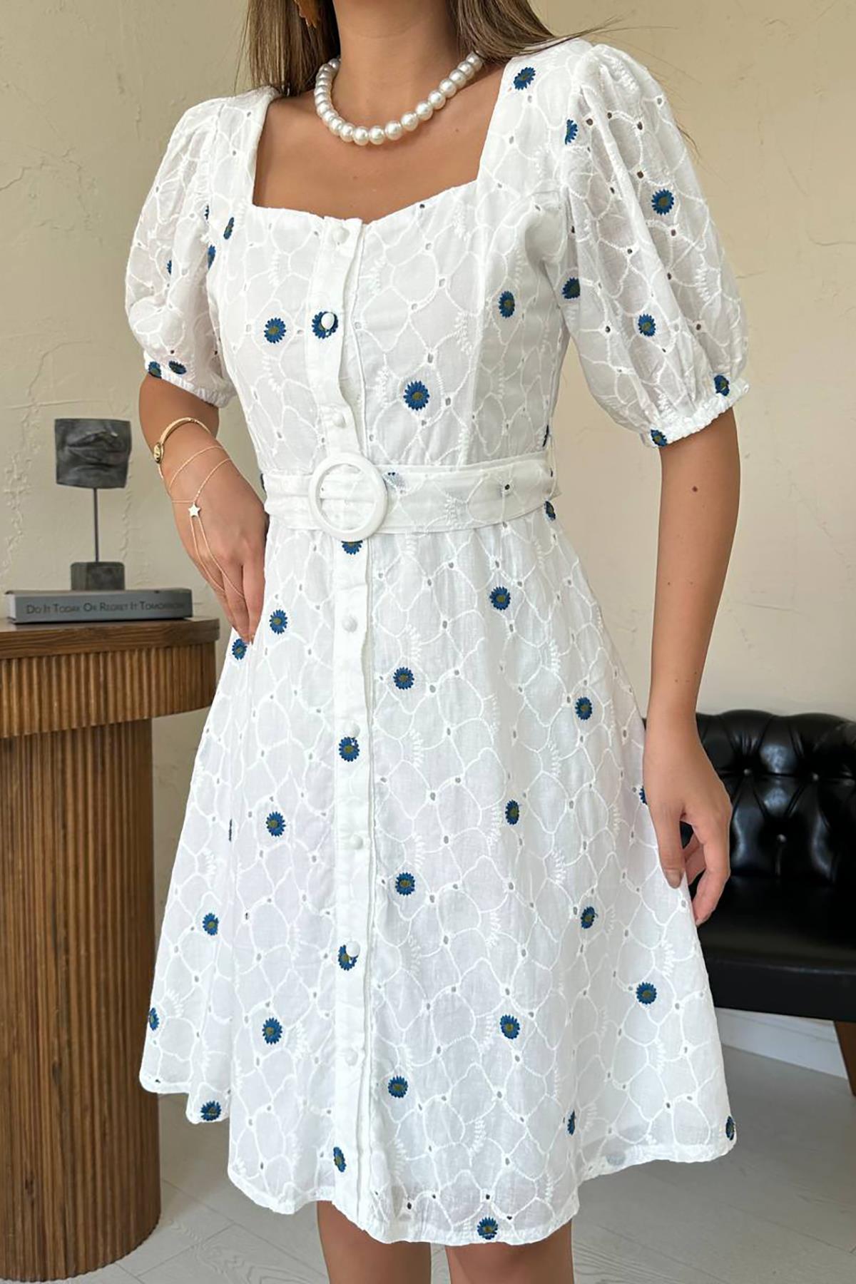 Toptan Mavi Kemerli Kare Yaka Elbise