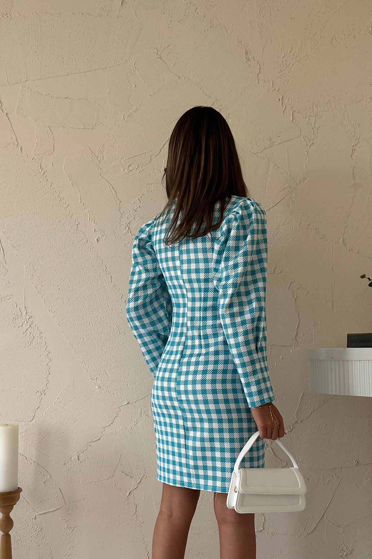 Toptan Mavi Kareli Göğüş Kuplu Elbise