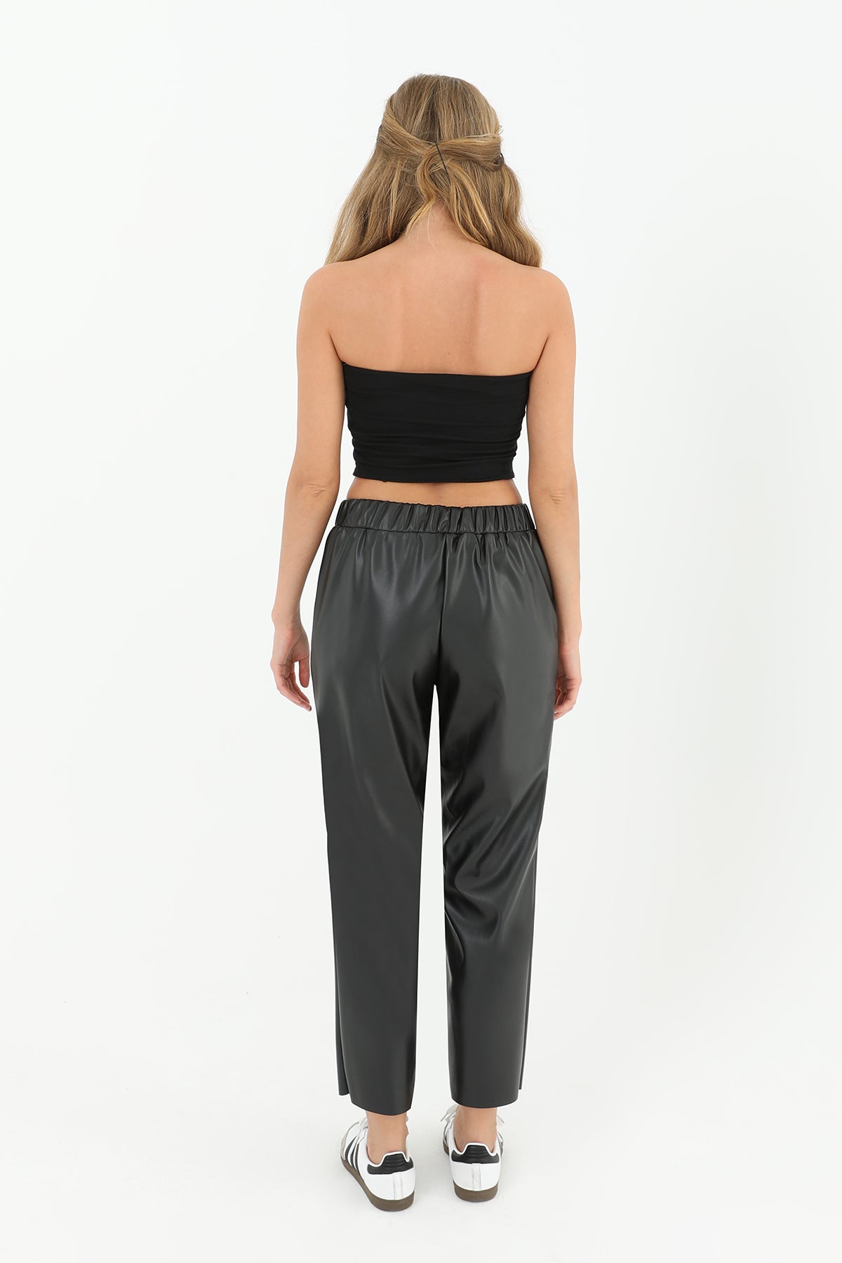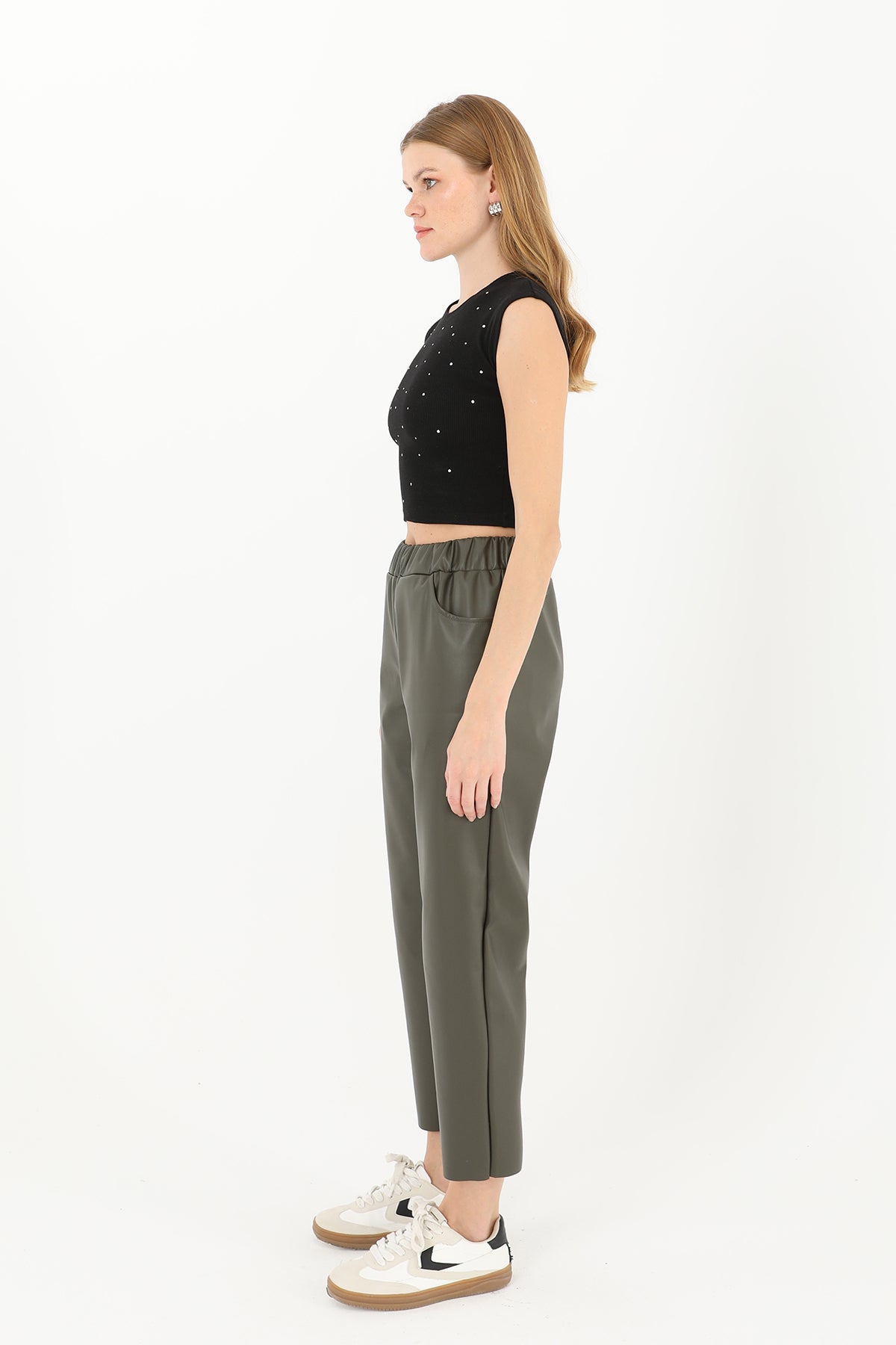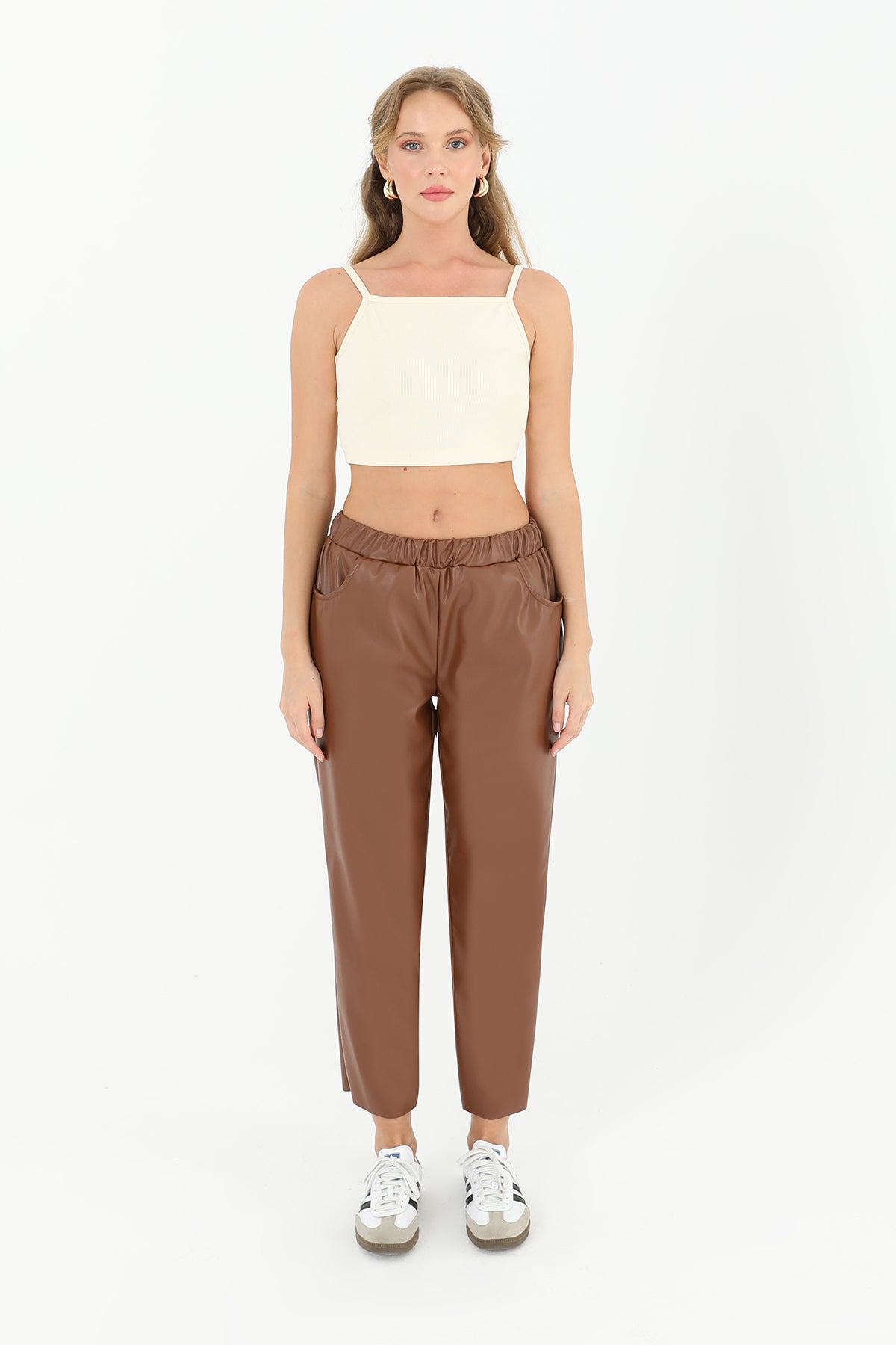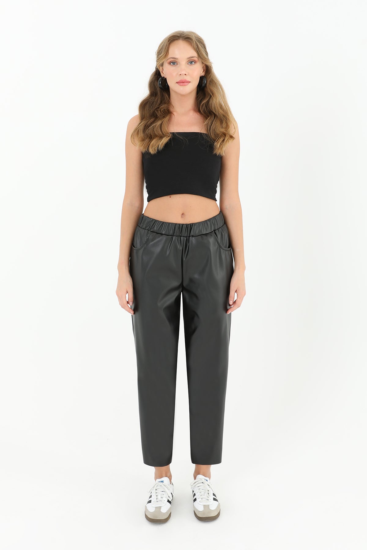 Kadın Beli Lastikli Cep Detaylı Deri Pantolon - 18205PNT