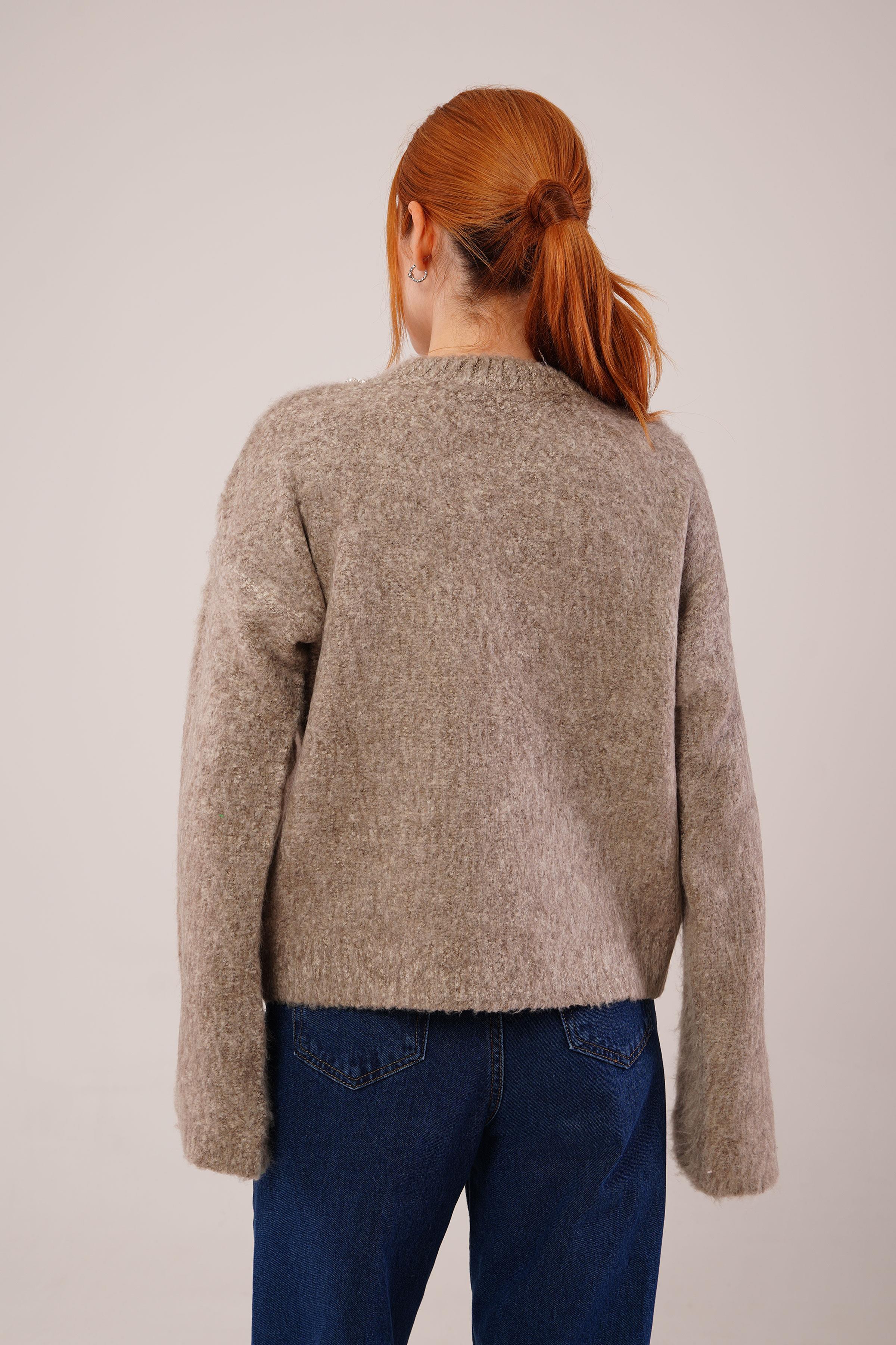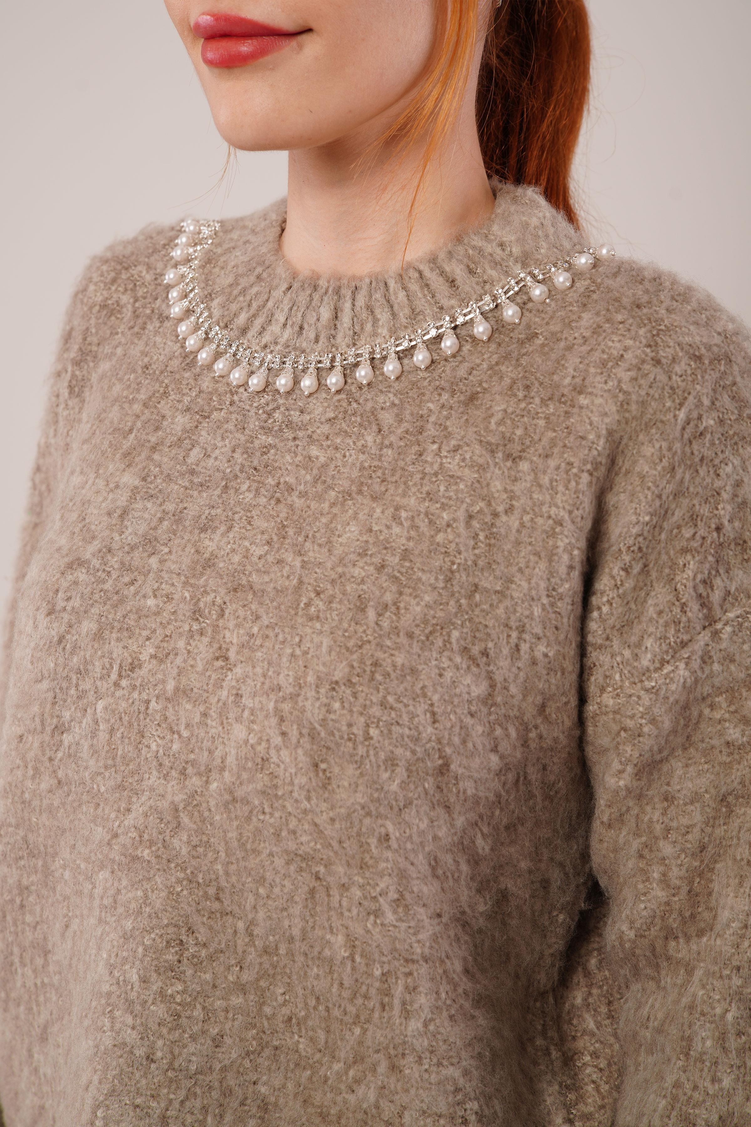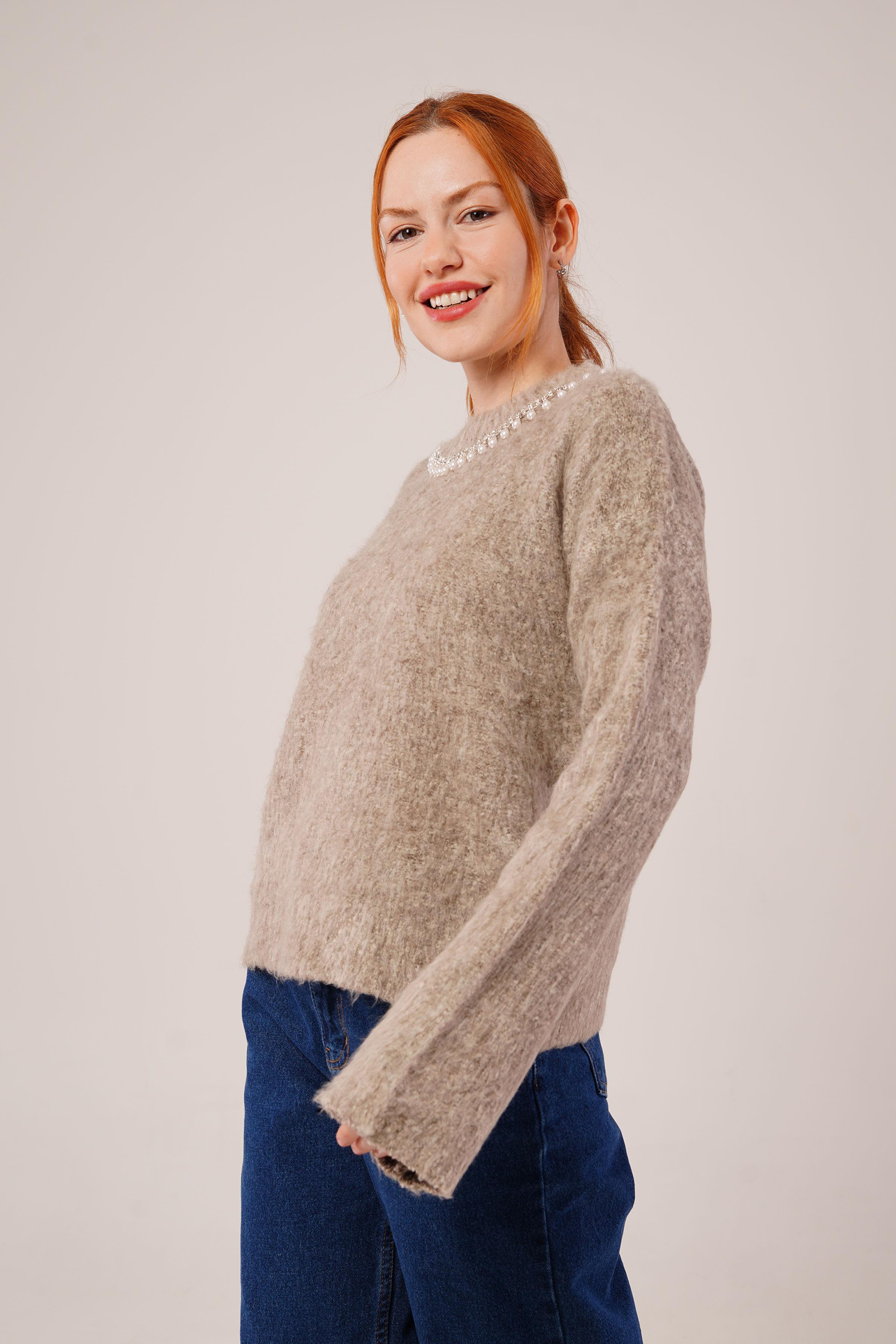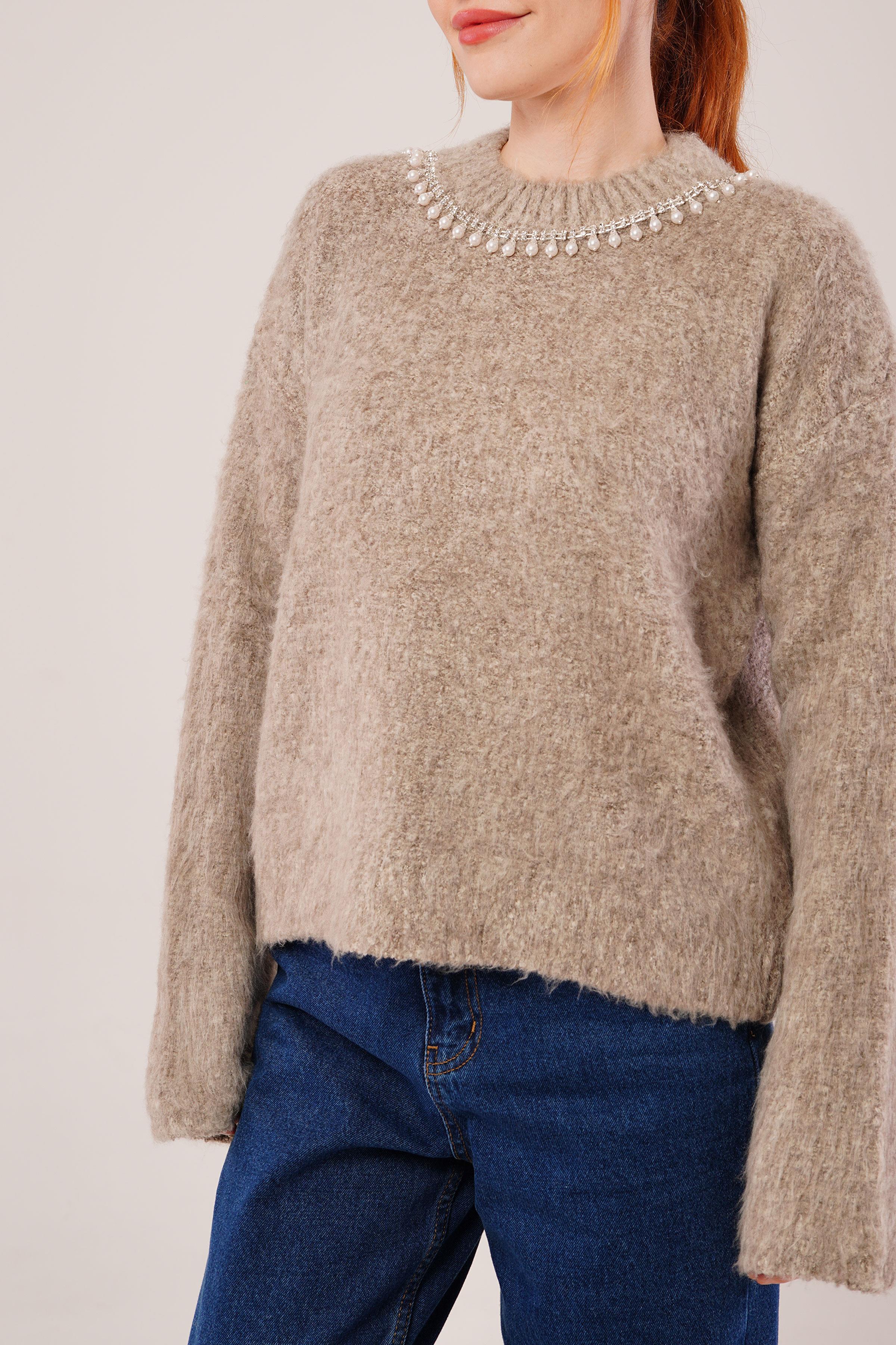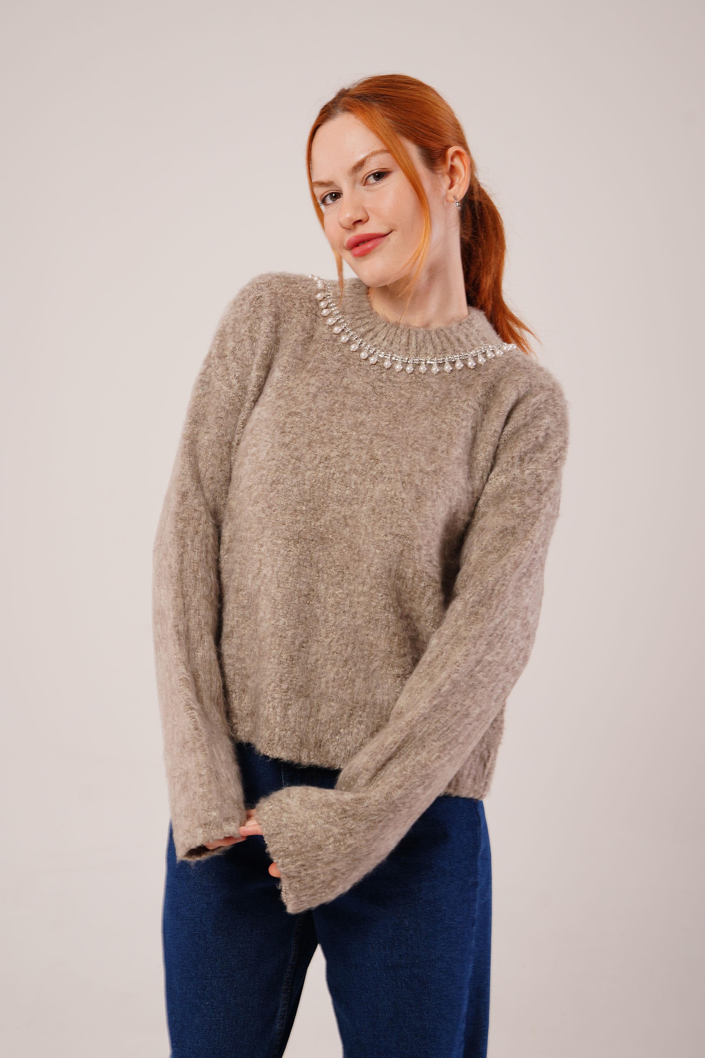 İnci Yaka Detaylı Toptan Vizon Yumuşak Kazak