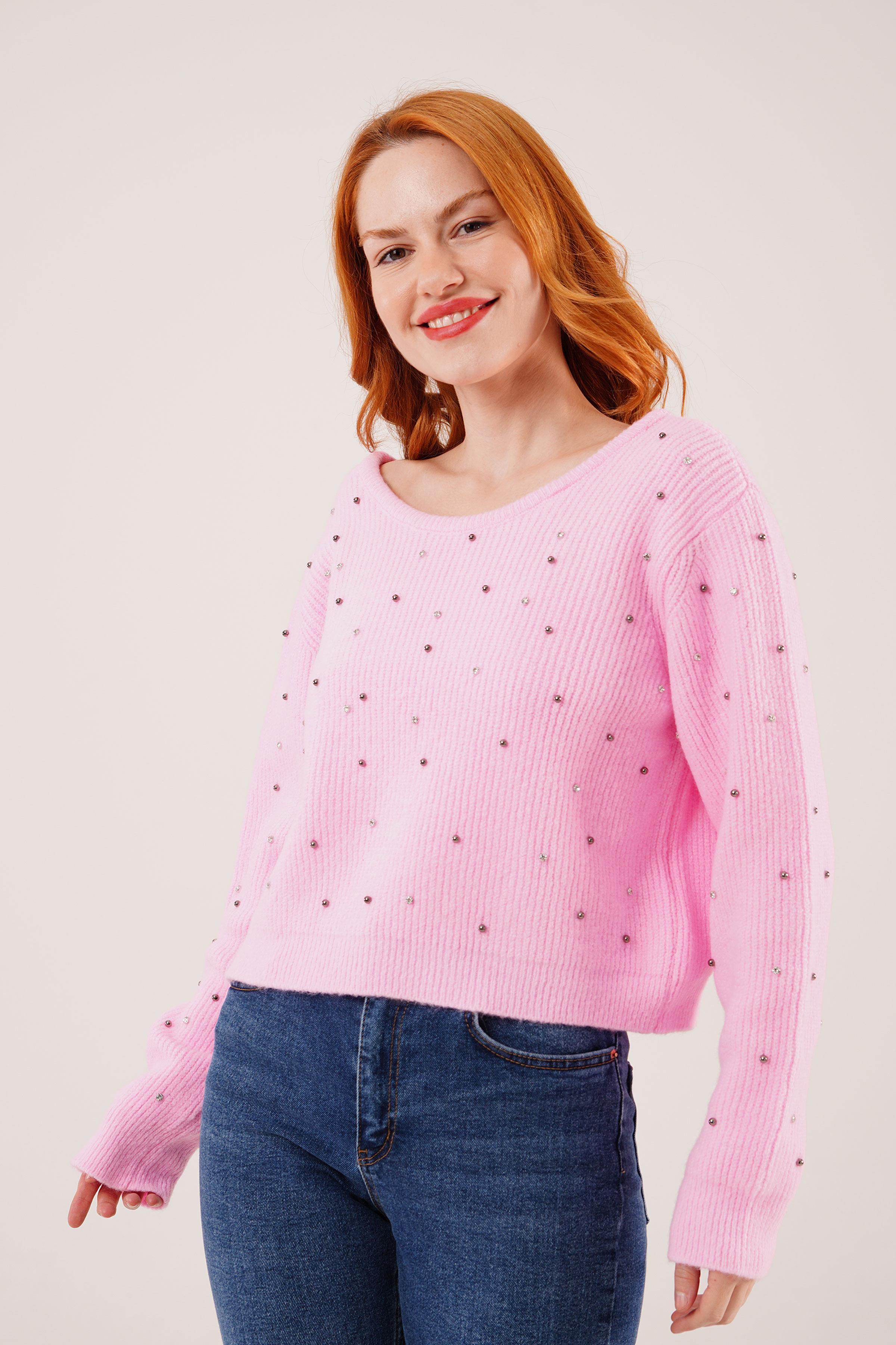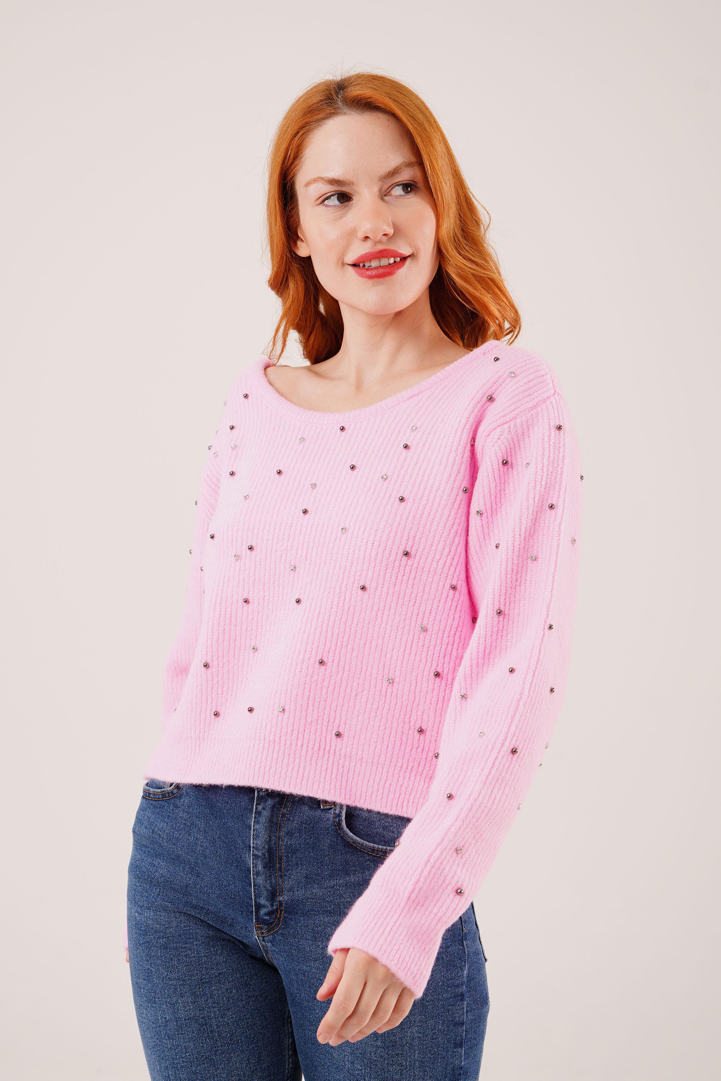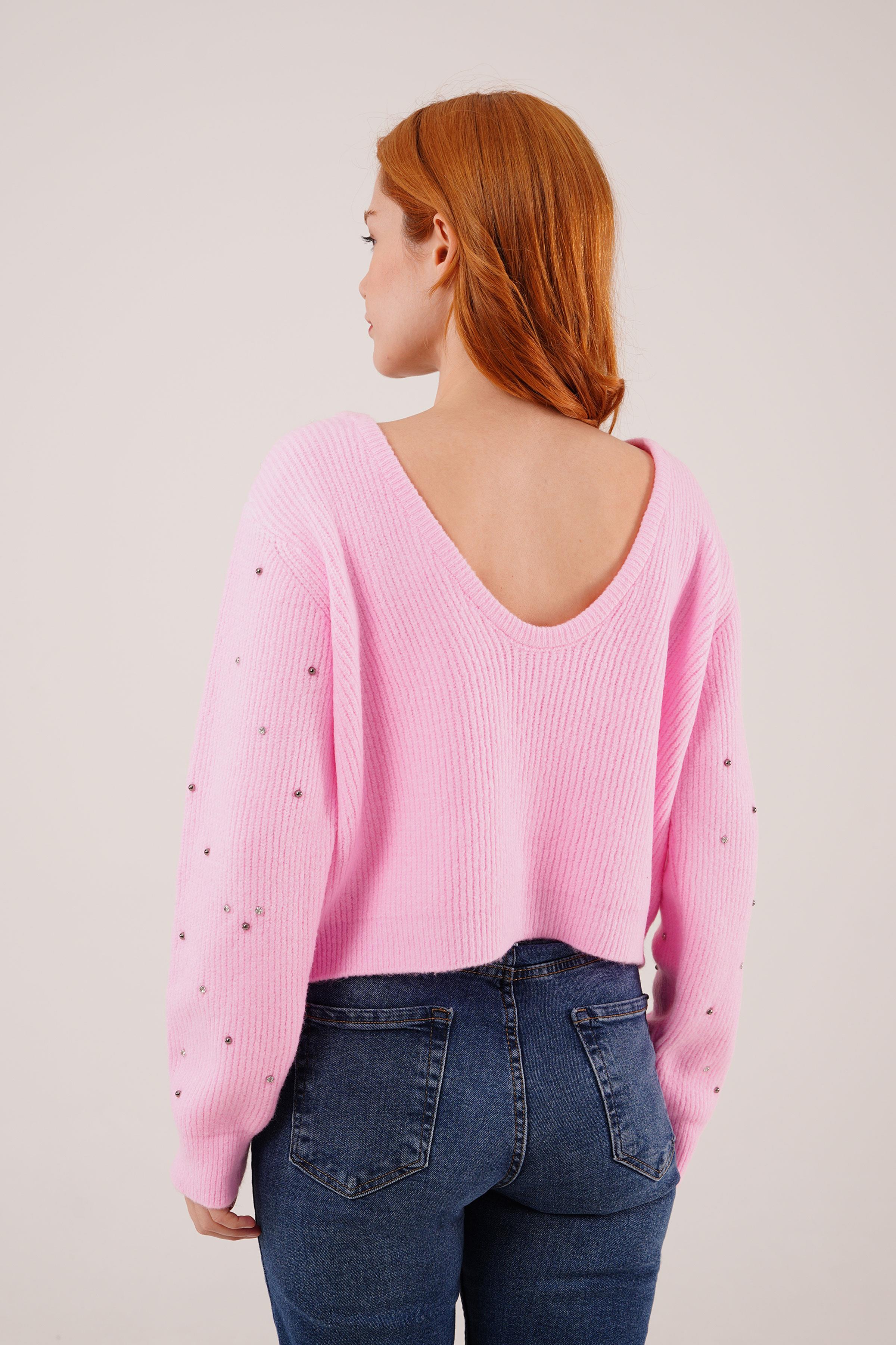 Taşlı Ve Sırt Dekolteli Pembe Toptan Kazak