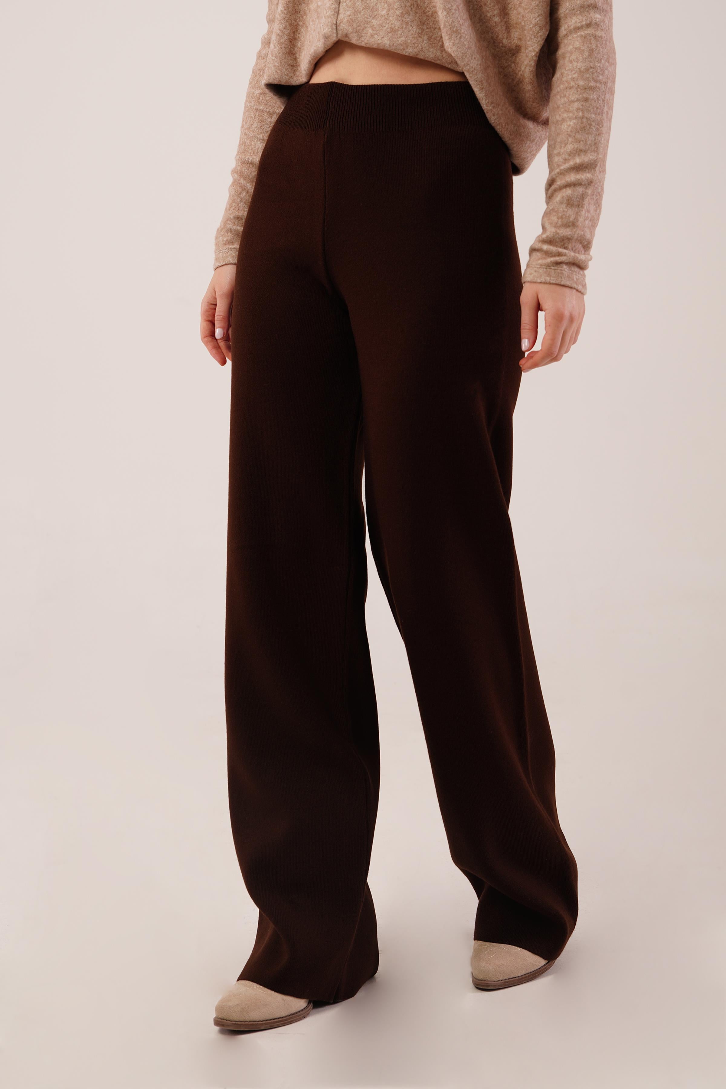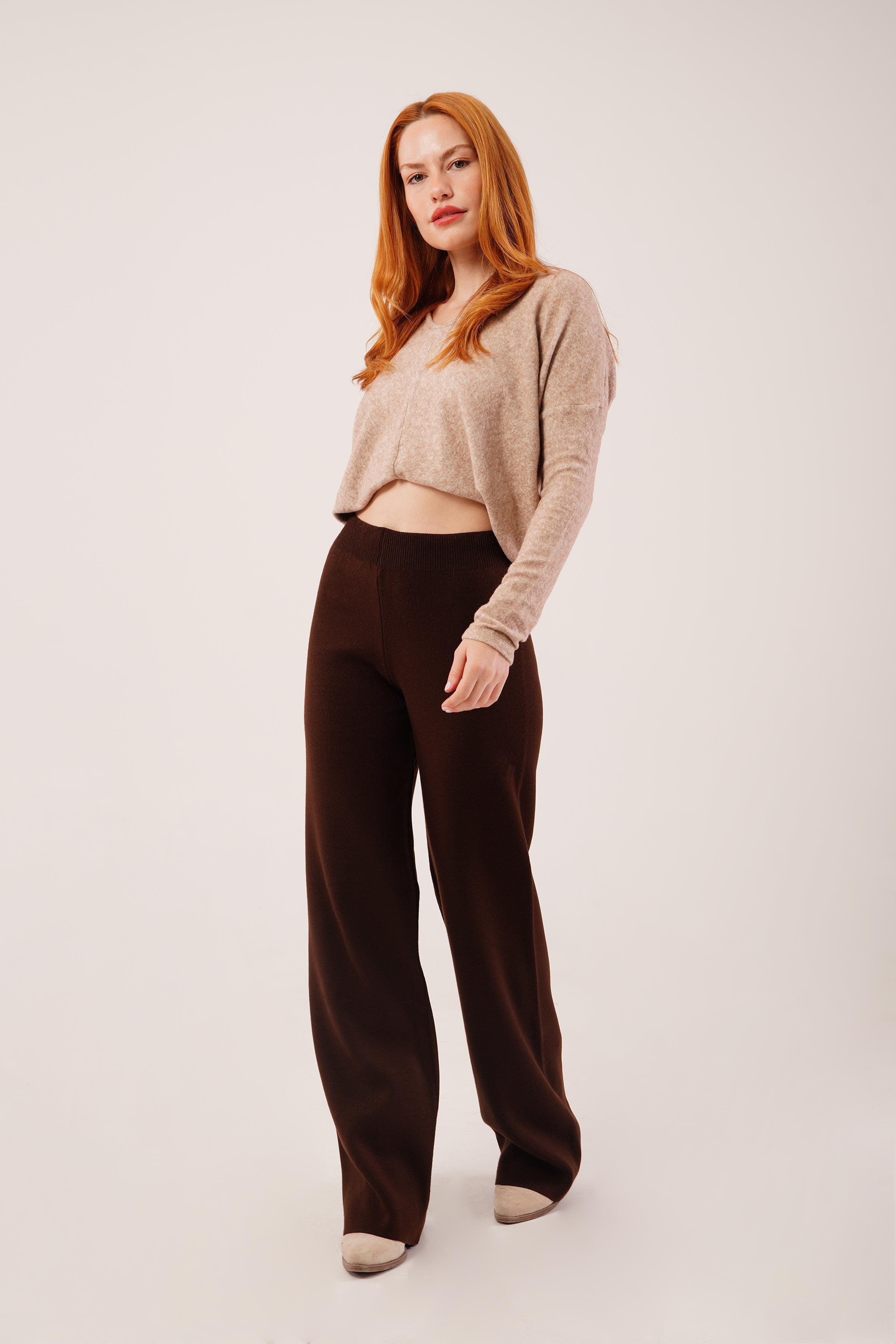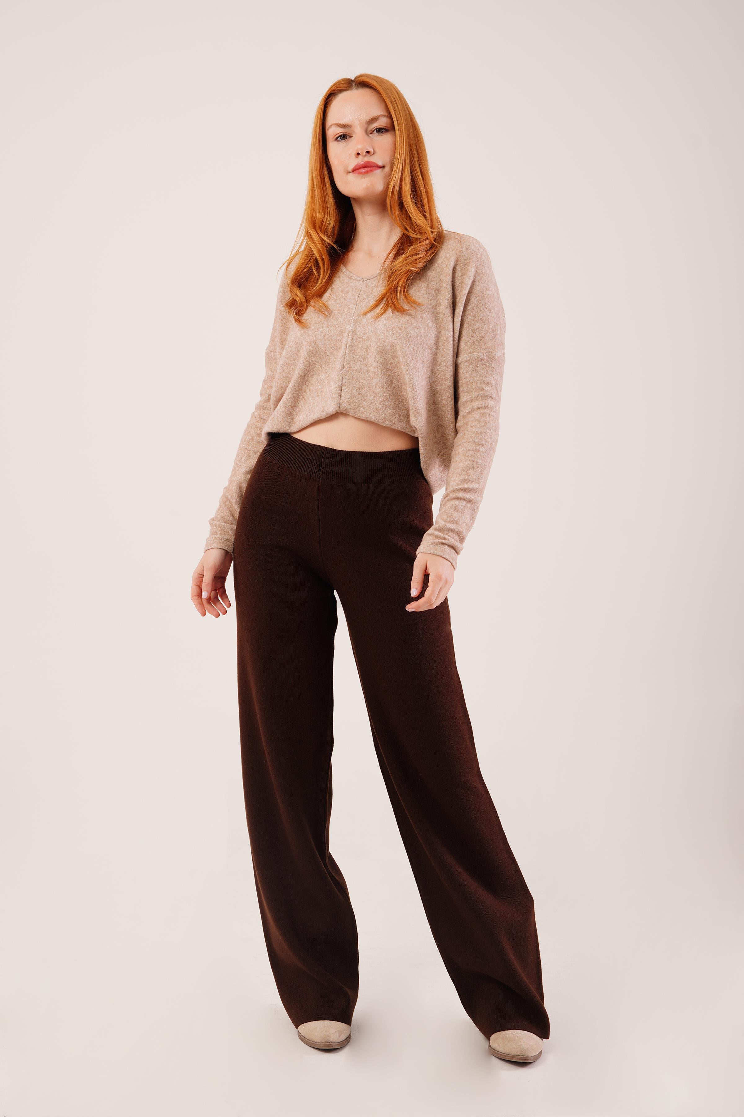 Yüksek Bel Bol Paça Kahverengi Toptan Triko Pantolon