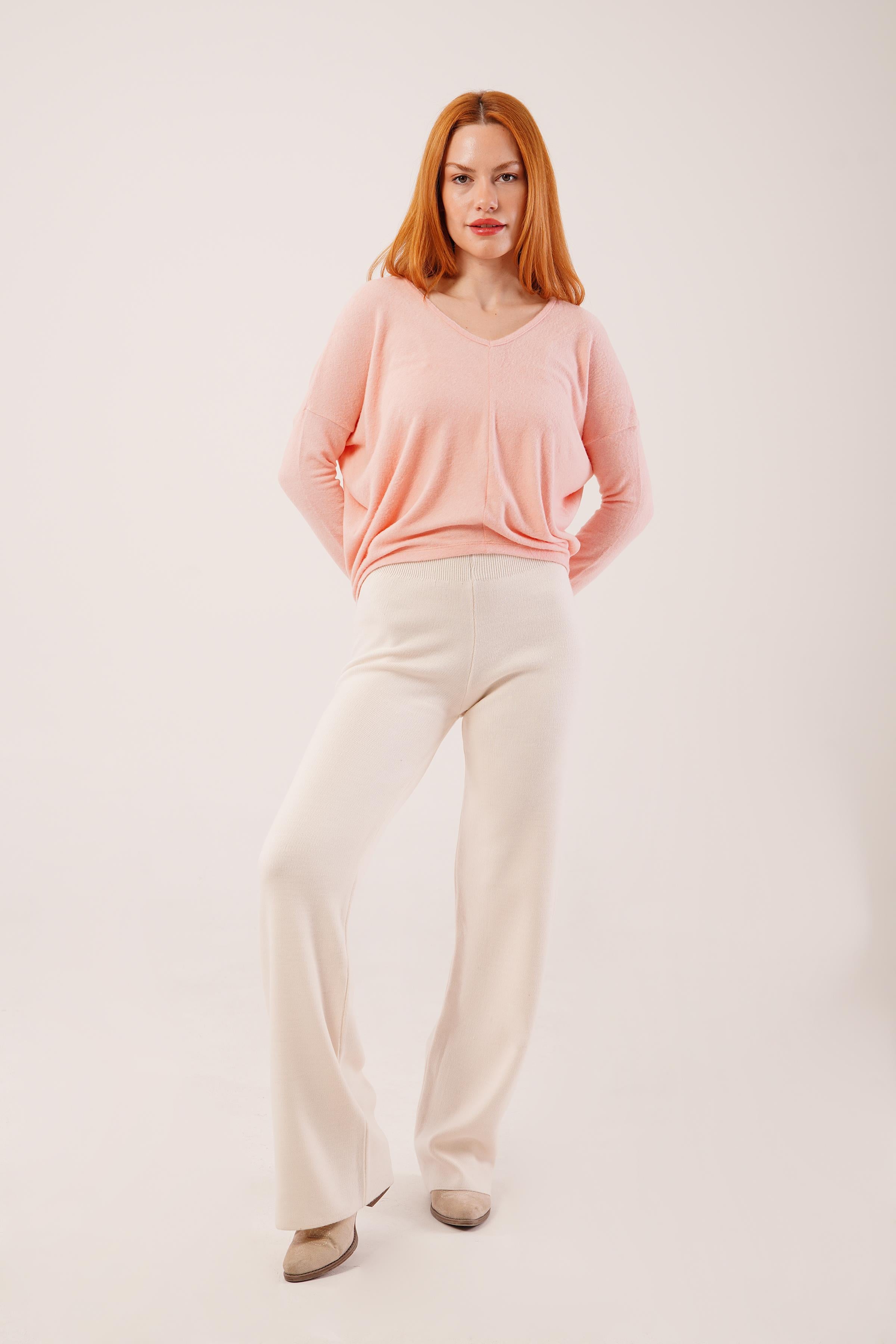 Yüksek Bel Bol Paça Ekru Toptan Triko Pantolon
