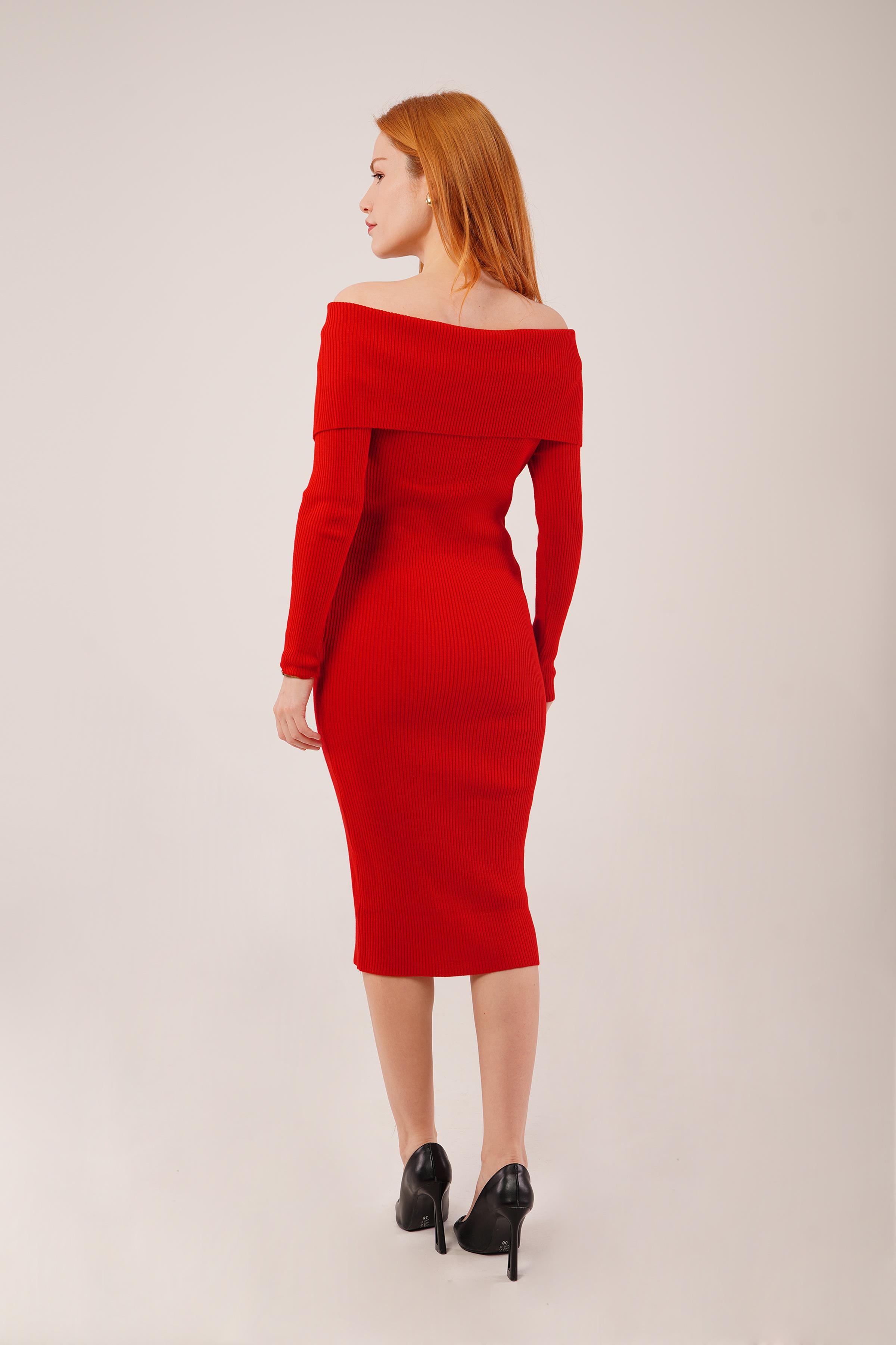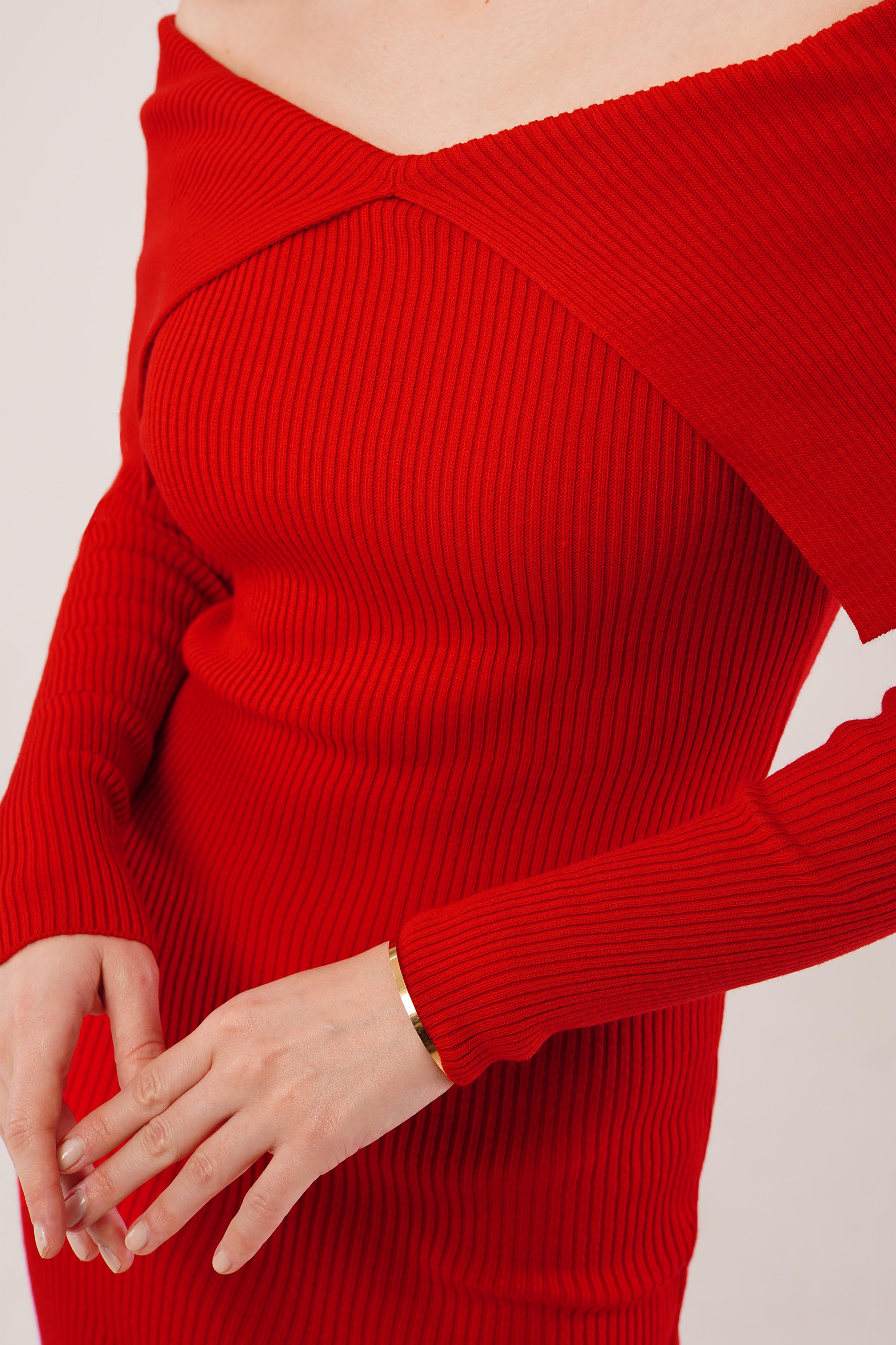 Omuz Detaylı Dekolteli Midi Kırmızı Toptan Triko Elbise