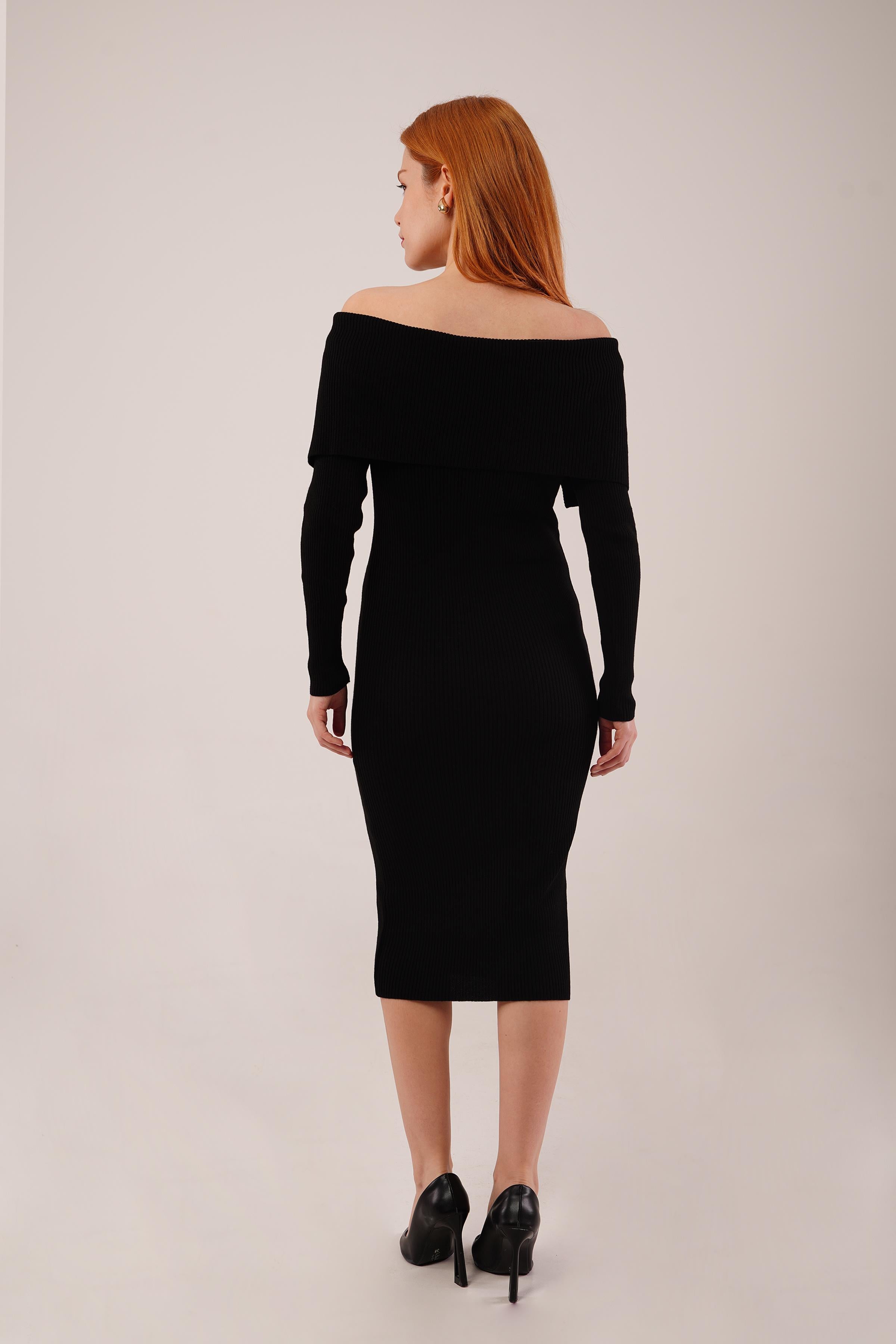 Omuz Detaylı Dekolteli Midi Siyah Toptan Triko Elbise