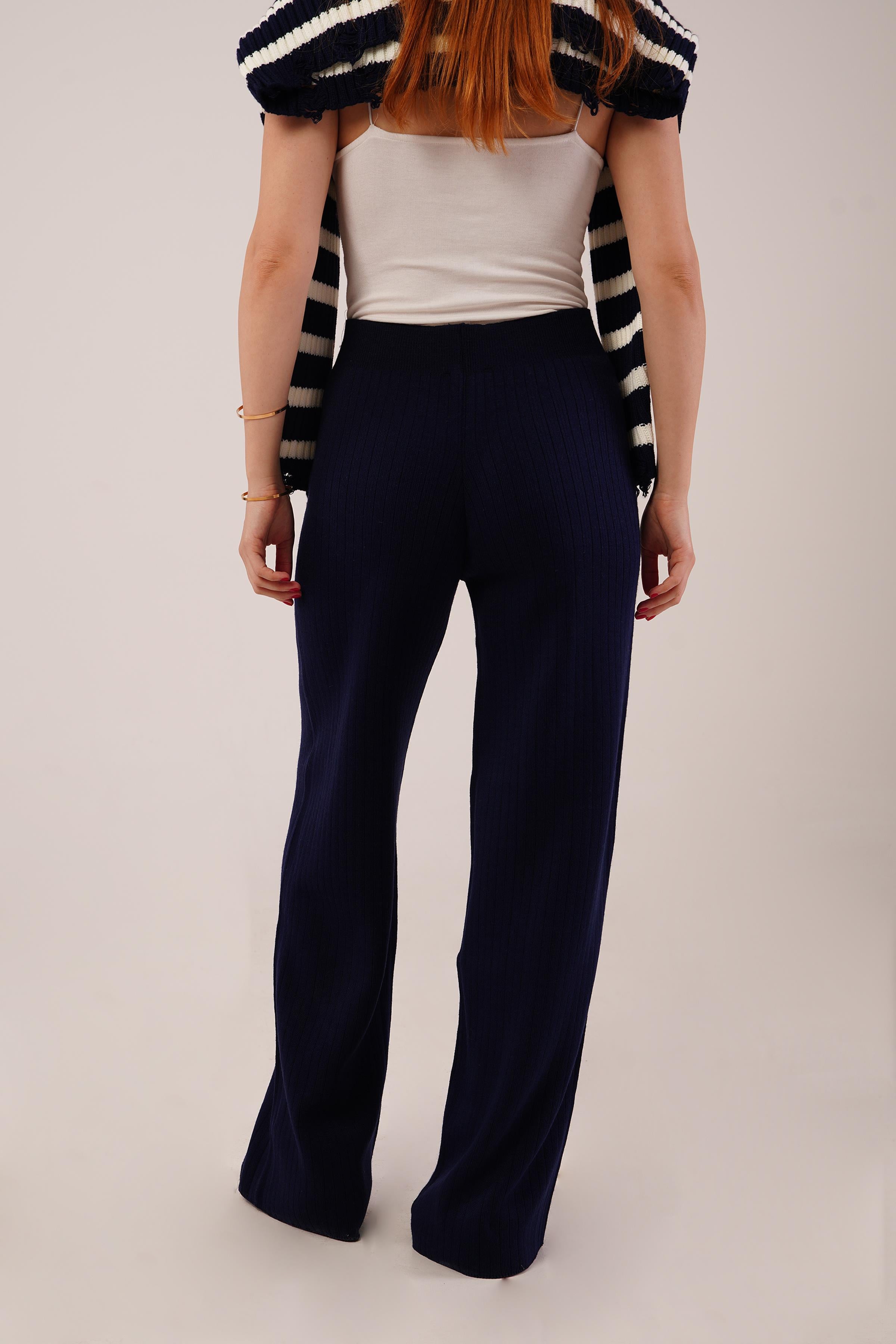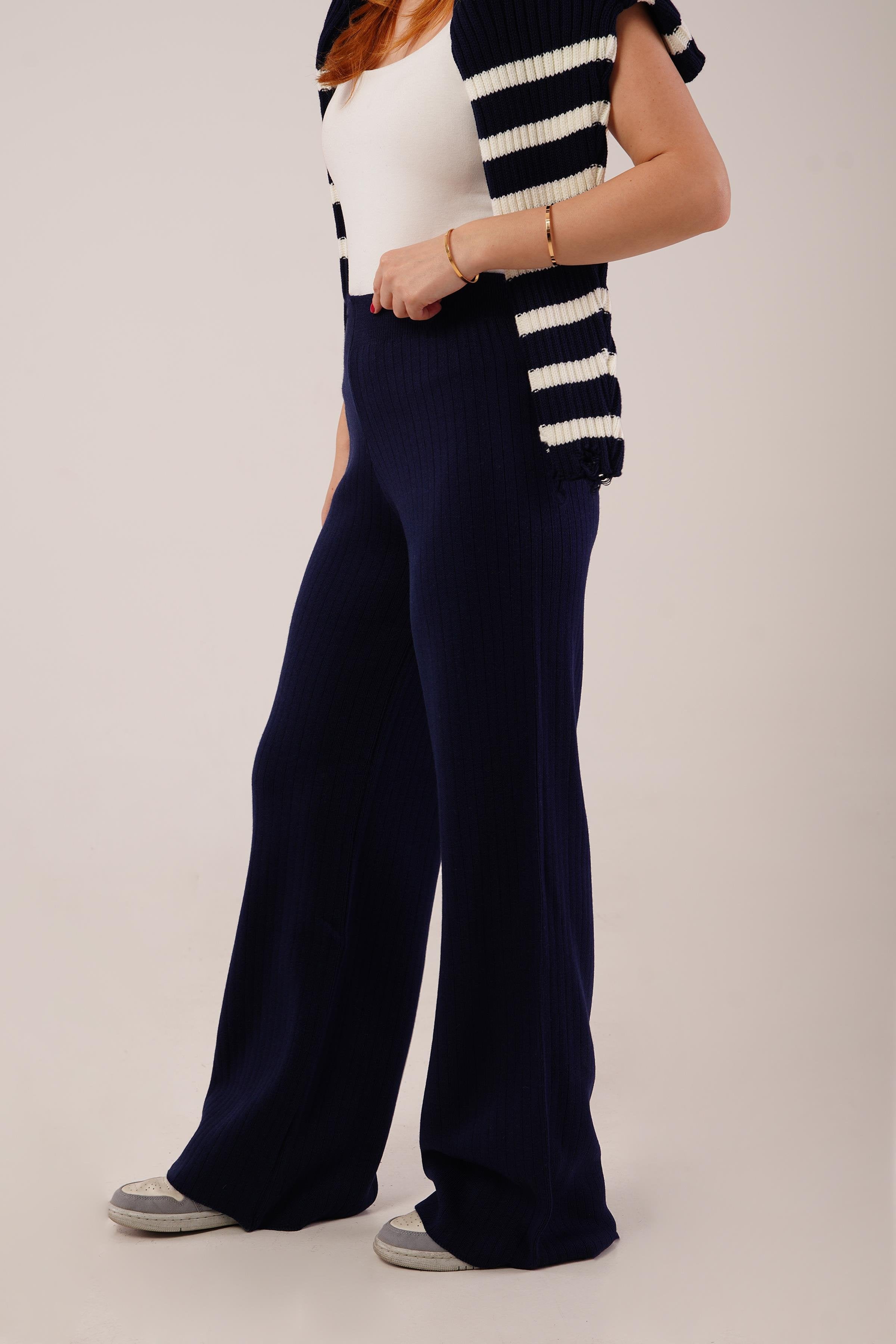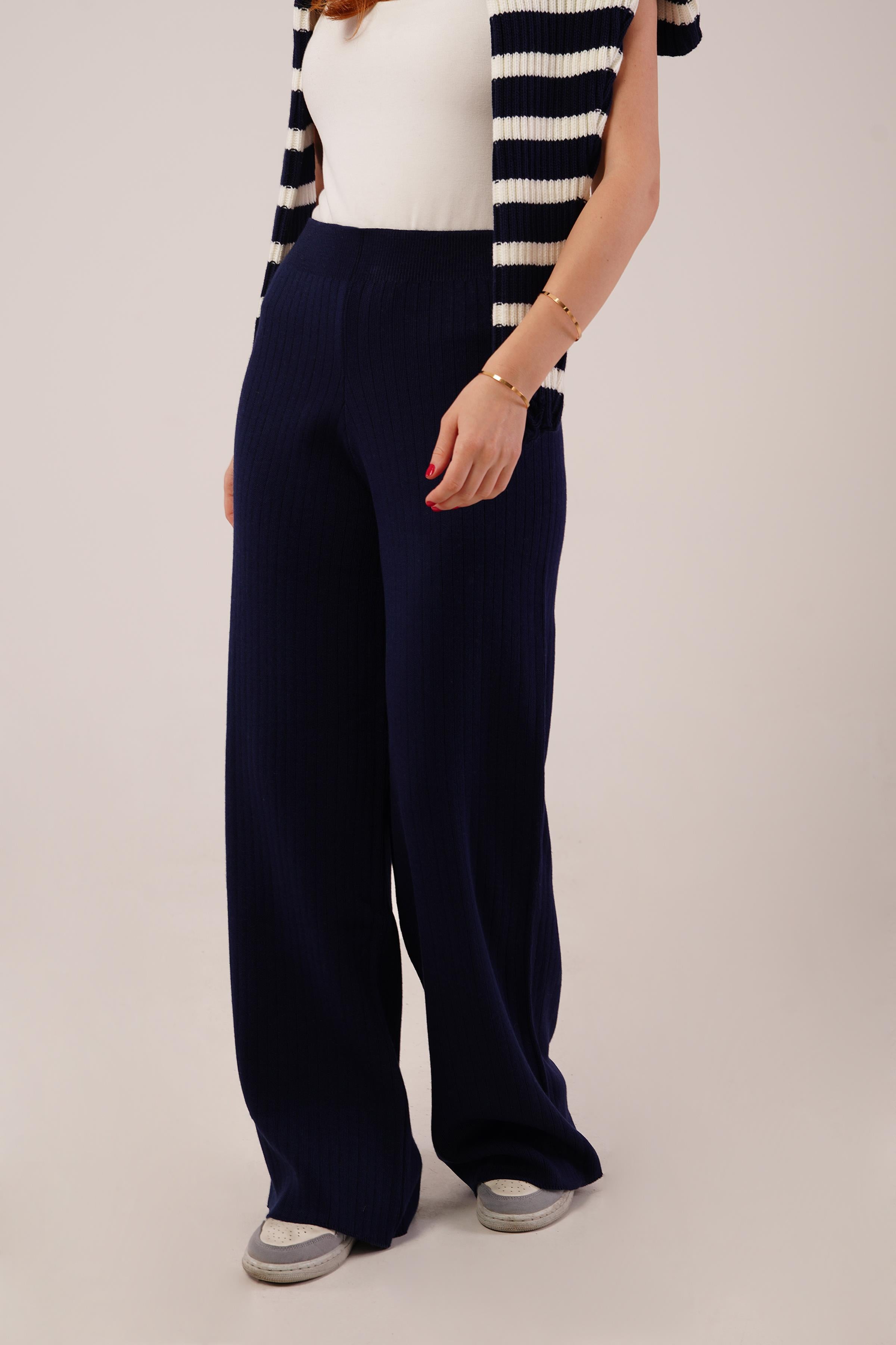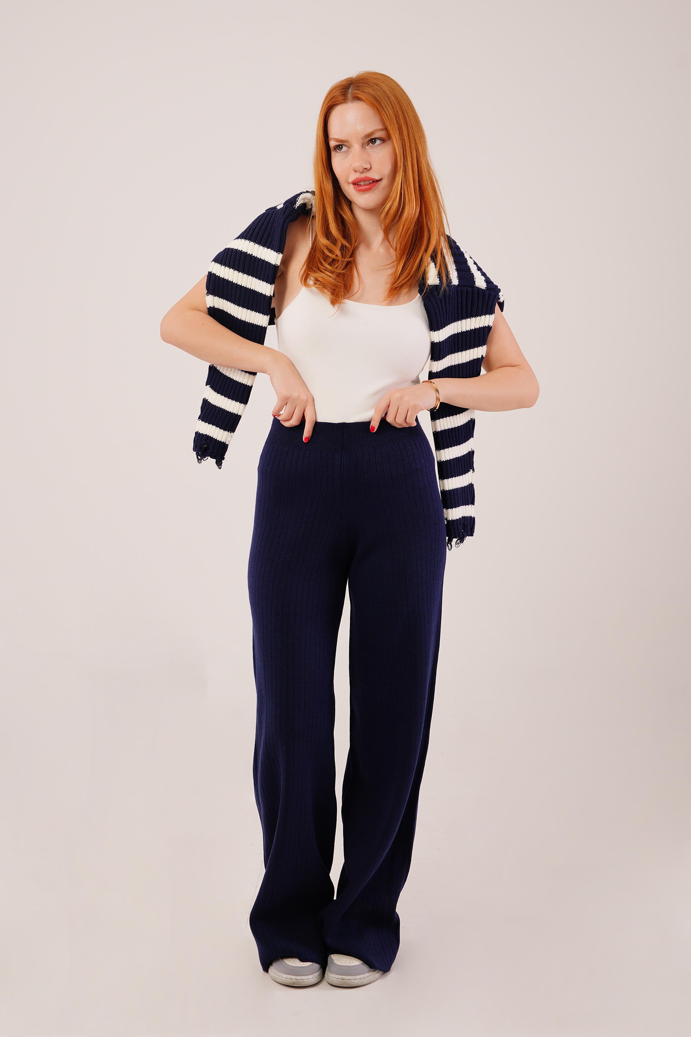 Fitilli Bel Lastikli Bol Paça Lacivert Toptan Triko Pantolon