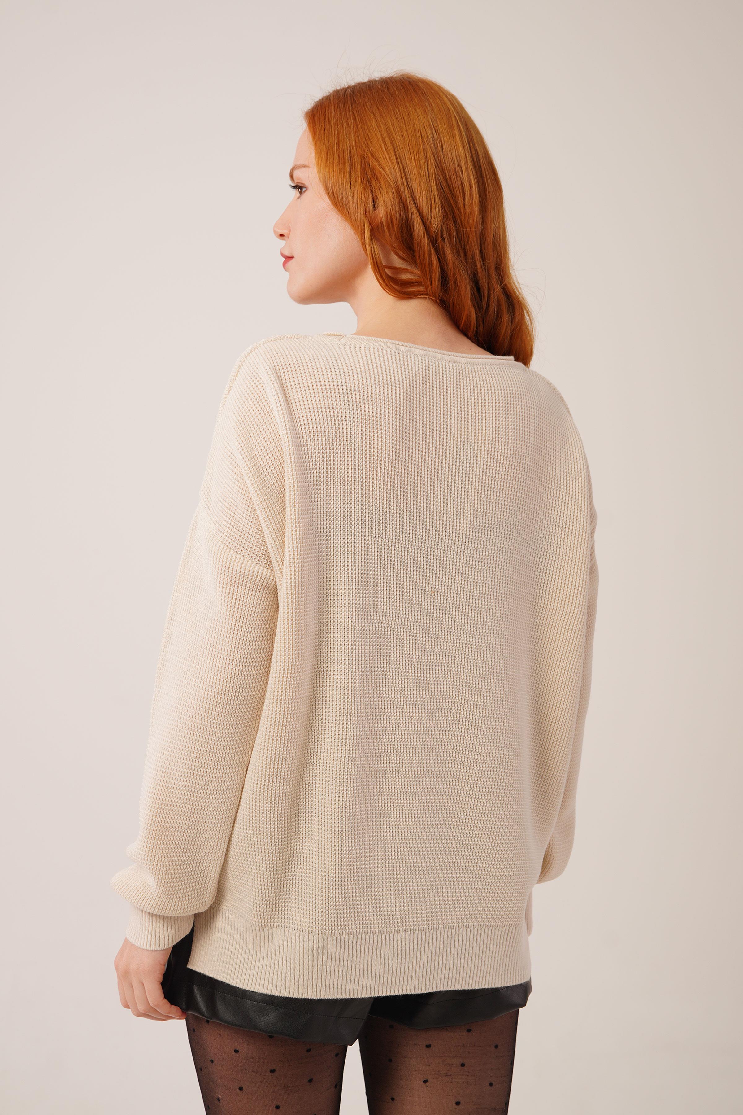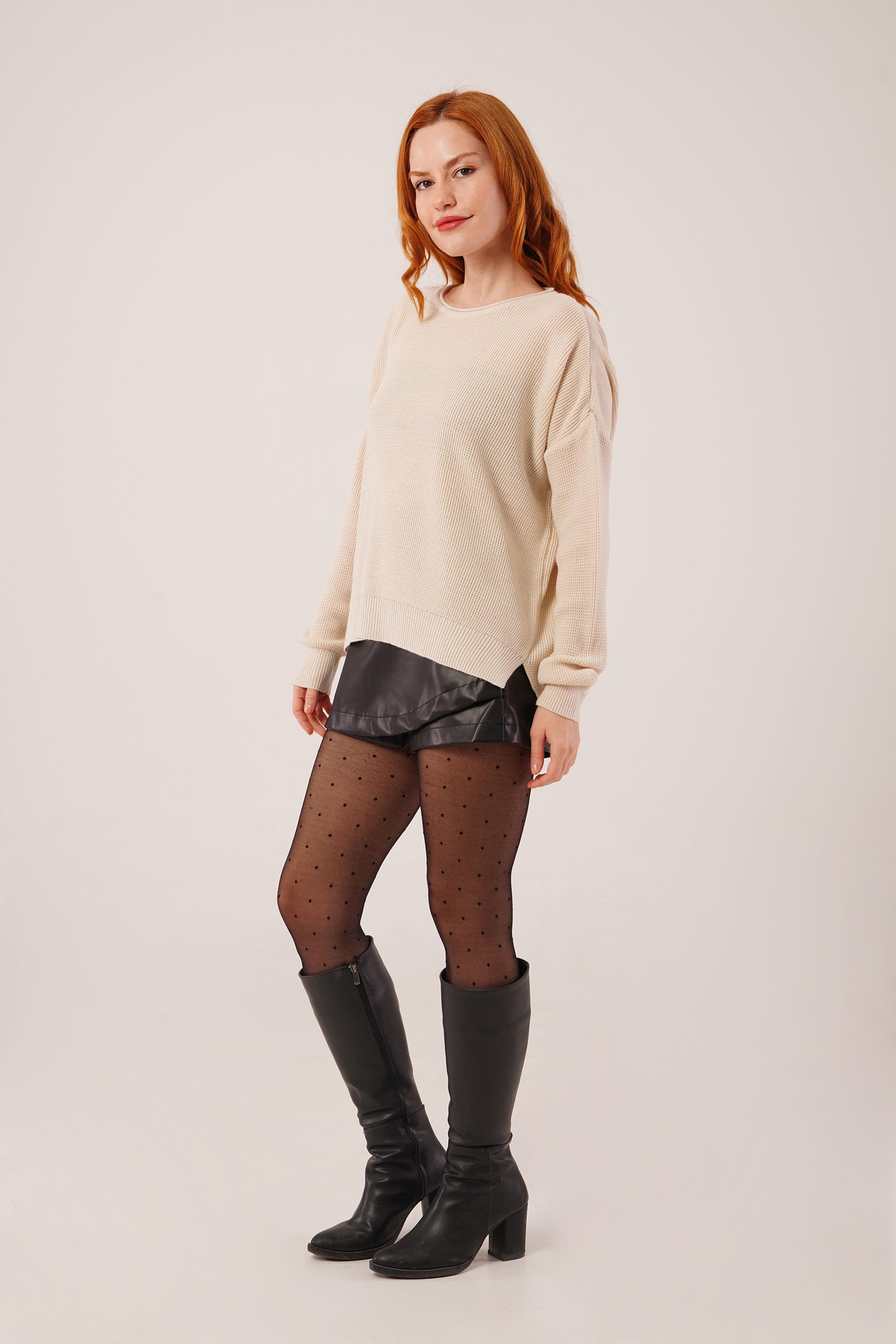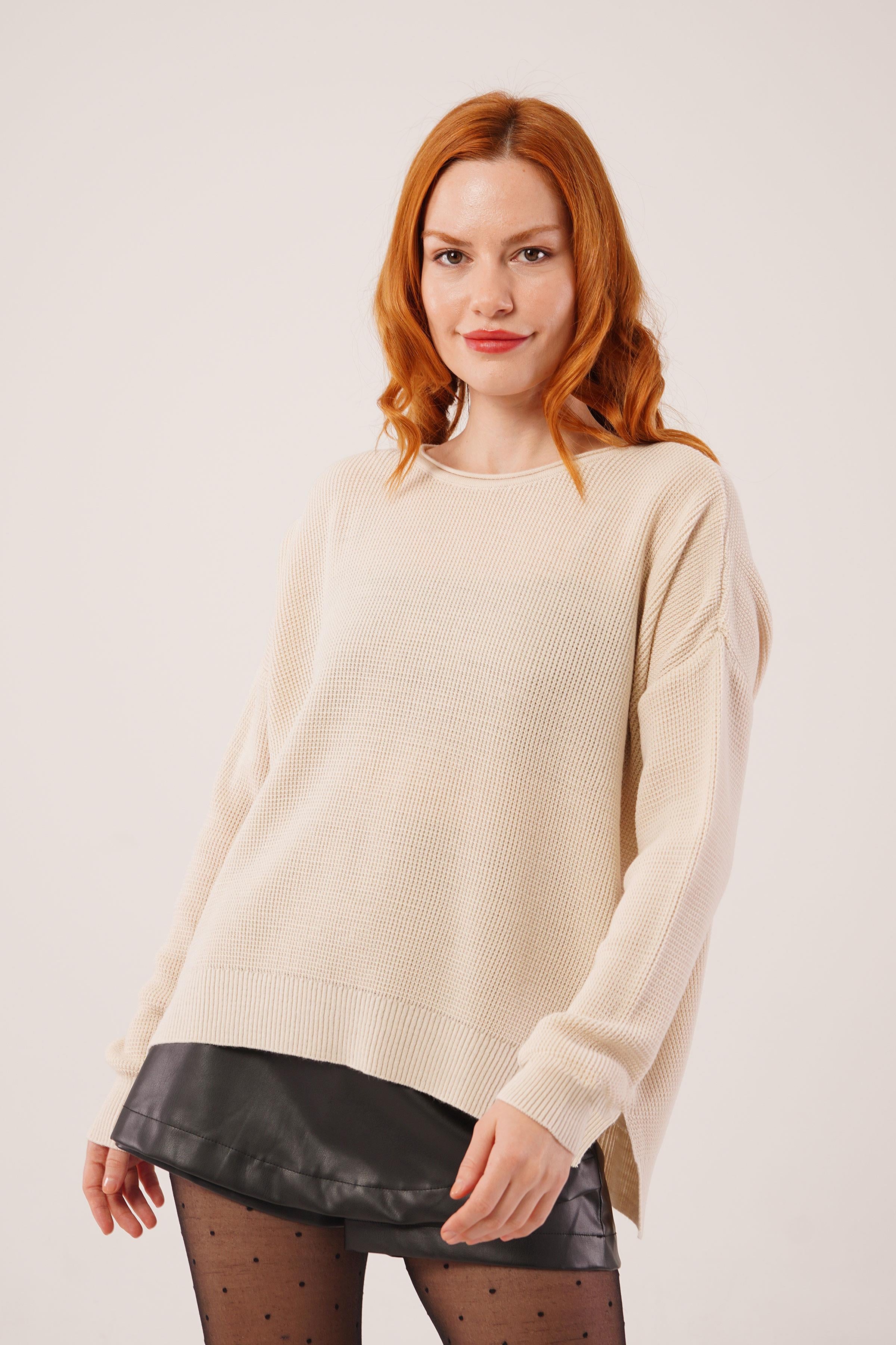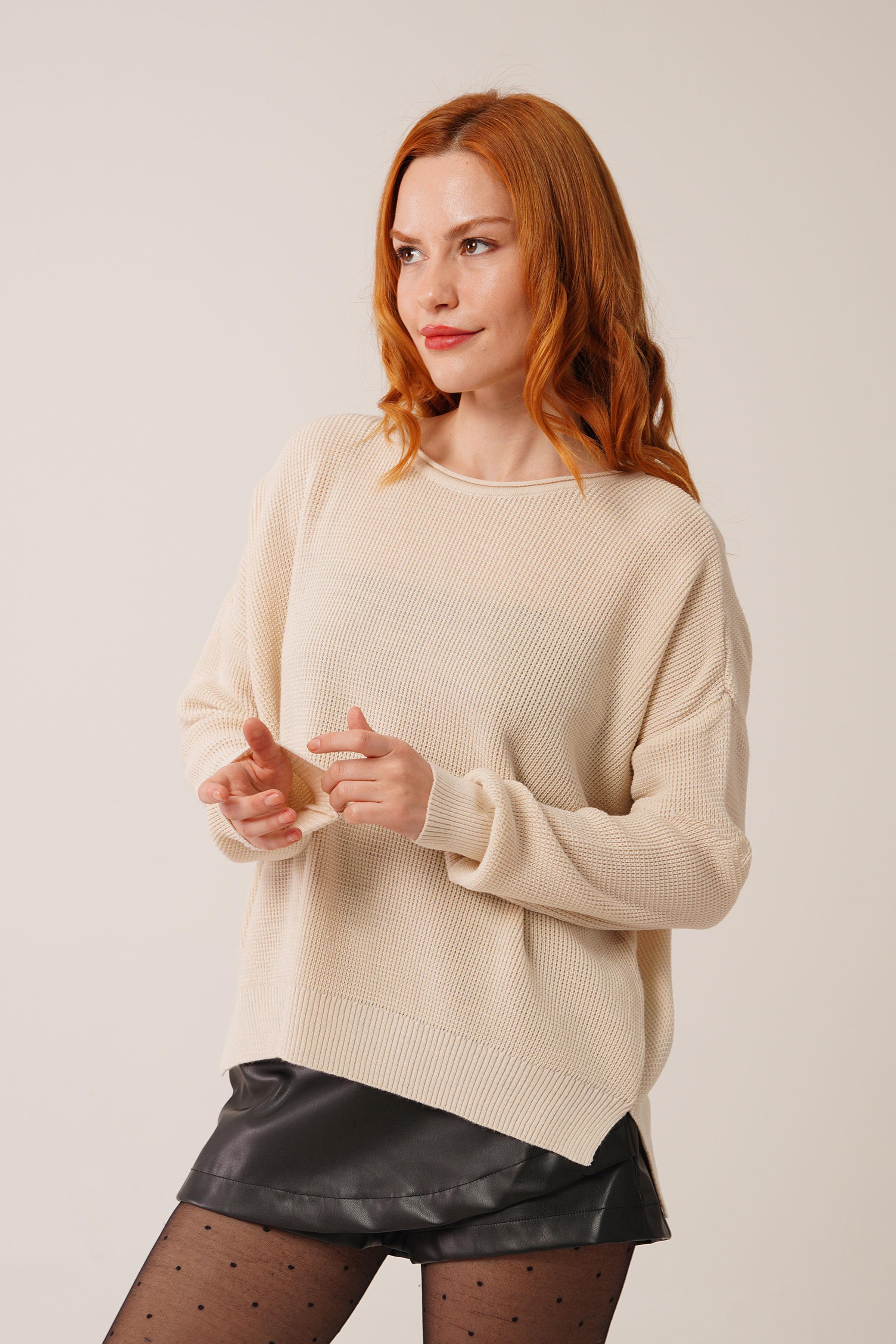 Yan Kısa Yırtmaçlı Selanik Örme Toptan Krem Triko Kazak