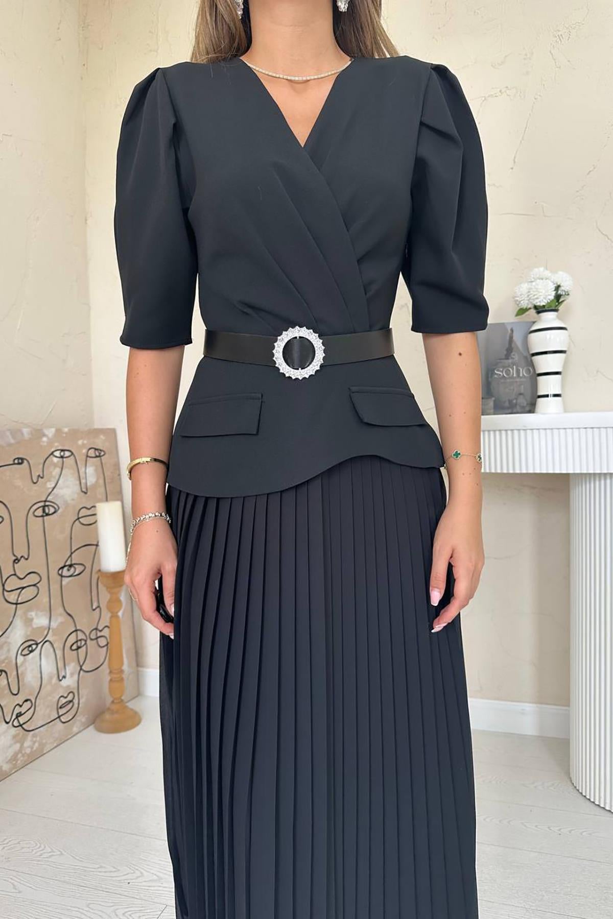 Toptan Siyah Kruvaze Yaka Piliseli Elbise