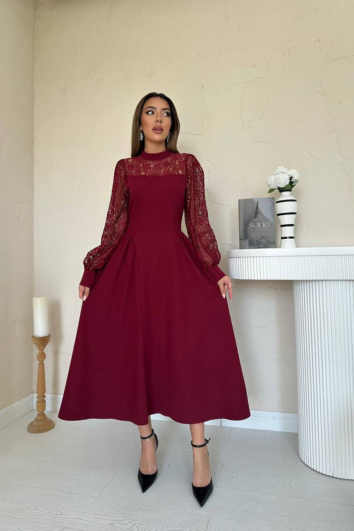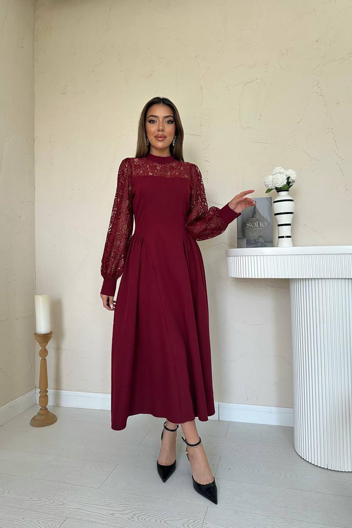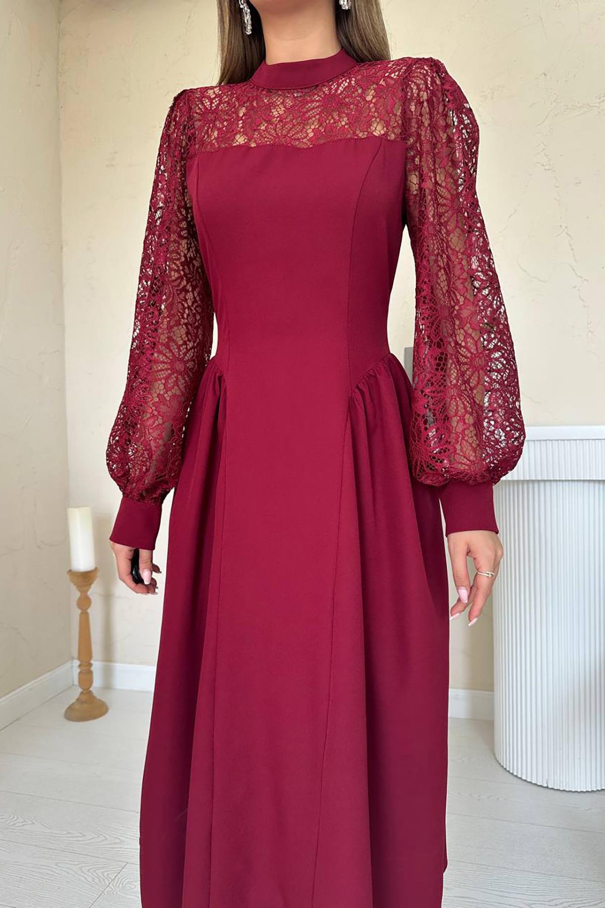 Toptan Bordo Dantel Garnili Büzgülü Atlas Elbise
